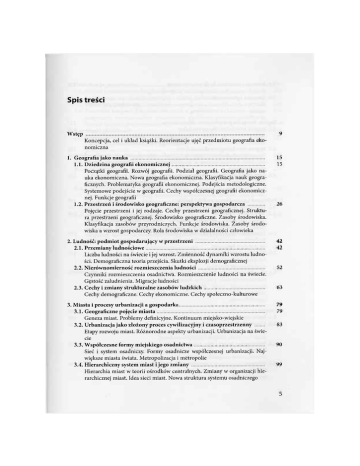 Spis treści Wstęp 9 Koncepcja, cel i układ książki. Reorientacje ujęć przedmiotu geografia ekonomiczna 1. Geografia jako nauka 1.1. Dziedzina geografii ekonomicznej Początki geografii. Rozwój geografii. Podział geografii. Geografia jako nauka ekonomiczna. Nowa geografia ekonomiczna. Klasyfikacja nauk geograficznych. Problematyka geografii ekonomicznej. Podejścia metodologiczne. Systemowe podejście w geografii. Cechy współczesnej geografii ekonomicznej. Funkcje geografii 1.2. Przestrzeń i środowisko geograficzne: perspektywa gospodarcza Pojęcie przestrzeni i jej rodzaje. Cechy przestrzeni geograficznej. Struktura przestrzeni geograficznej. Środowisko geograficzne. Zasoby środowiska. Klasyfikacja zasobów przyrodniczych. Funkcje środowiska. Zasoby środowiska a wzrost gospodarczy. Rola środowiska w działalności człowieka 15 15 26 2. Ludność: podmiot gospodarujący w przestrzeni 2.1. Przemiany ludnościowe Liczba ludności na świecie i jej wzrost. Zmienność dynamiki wzrostu ludności. Demograficzna teoria przejścia. Skutki eksplozji demograficznej 2.2. Nierównomierność rozmieszczenia ludności Czynniki rozmieszczenia osadnictwa. Rozmieszczenie ludności na świecie. Gęstość zaludnienia. Migracje ludności 2.3. Cechy i zmiany strukturalne zasobów ludzkich Cechy demograficzne. Cechy ekonomiczne. Cechy społeczno-kulturowe 42 42 3. Miasta i procesy urbanizacji a gospodarka 3.1. Geograficzne pojęcie miasta Geneza miast. Problemy definicyjne. Kontinuum miejsko-wiejskie 3.2. Urbanizacja jako złożony proces cywilizacyjny i czasoprzestrzenny Etapy rozwoju miast. Różnorodne aspekty urbanizacji. Urbanizacja na świecie 3.3. Współczesne formy miejskiego osadnictwa Sieć i system osadniczy. Formy osadnicze współczesnej urbanizacji. Największe miasta świata. Metropolizacja i metropolie 3.4. Hierarchiczny system miast i jego zmiany Hierarchia miast w teorii ośrodków centralnych. Zmiany w organizacji hierarchicznej miast. Idea sieci miast. Nowa struktura systemu osadniczego 79 79 52 63 83 90 99 5 3.5. Funkcje i struktura funkcjonalna miast Funkcje miast. Baza ekonomiczna miast 3.6. Korzyści aglomeracji Korzyści skali. Ekonomiczne korzyści lokalizacji i urbanizacji. Dynamika miasta. 106 4. Region: kategoria przestrzenno-ekonomiczna 4.1. Region jako jednostka terytorialna Region: narzędzie badawcze. Region: konkretny obiekt poznania. Region: narzędzie działania. Regionalizacja. Skala przestrzenna regionu 4.2. Region jako kategoria ekonomiczna Istota regionu ekonomicznego. Strukturalna odmienność regionów ekonomicznych. Miejsce regionu w gospodarce narodowej. Typologia regionów ekonomicznych 4.3. Rozwój regionalny i polityka regionalna Istota rozwoju regionalnego. Czynniki rozwoju regionalnego. Konkurencyjność i konkurowanie regionów. Polityka regionalna 117 118 5. Polityczny i gospodarczy podział świata 5.1. Przestrzeń geopolityczna i państwo 5.2. Terytorium państwa Kształt terytorium. Enklawy i eksklawy. Wielkość państw. Zmiany terytorialne państwa. Granice państwa. Pogranicze. Stolica państwa 5.3. Przemiany światowej przestrzeni politycznej Rozbudowa systemu kolonialnego. Sytuacja po I wojnie światowej. Sytuacja po II wojnie światowej. 5.4. Współczesny polityczny podział świata Liczba państw świata. Terytoria zależne. Podział Antarktydy. Polityczny podział obszarów morskich 5.5.Współczesna gospodarcza struktura świata Nierównomierność poziomu rozwoju gospodarczego. Tradycyjne gospodarcze podziały świata. Mierniki rozwoju społeczno-gospodarczego. Kontrasty rozwoju społeczno-gospodarczego. Cechy grup państw o różnym poziomie rozwoju 147 147 148 6. Gospodarczo-polityczne procesy integracyjne na świecie 6.1. Istota międzynarodowej integracji gospodarczej 6.2. Uwarunkowania sprzyjające procesom integracji Znaczenie międzynarodowego podziału pracy i handlu zagranicznego. Warunki i czynniki integracji międzynarodowej 6.3. Podstawowe formy i typy międzynarodowych ugrupowań integracyjnych Instytucjonalno-organizacyjne formy porozumień. Podstawowe typy międzynarodowej integracji gospodarczej 6.4. Wybrane organizacje i ugrupowania międzynarodowe Międzynarodowe organizacje globalne i ponadregionalne. Międzynarodowe organizacje regionalne 6 109 128 137 159 163 170 189 189 191 195 198 7. Globalizacja gospodarcza 7.1. Pojęcie i charakterystyka globalizacji Globalizacja: proces wielowymiarowy. Cechy globalizacji 7.2. Czynniki globalizacji 7.3. Znaczenie korporacji transnarodowych w gospodarce światowej Korporacje transnarodowe: podstawowe podmioty procesu globalizacji. Rozwój korporacji transnarodowych 7.4. Skutki globalizacji 7.5. Globalne i lokalne wymiary gospodarki Glokalizacja. Rozwój lokalny i jego istota 211 211 215 218 224 228 8. Przekształcenia strukturalne gospodarki ich przestrzenne konsekwencje 8.1. Innowacje a transformacja gospodarki 8.2. Restrukturyzacja przemysłu Rola przemysłu w gospodarce. Struktura przemysłu i jej zmiany. Dysproporcje w poziomie uprzemysłowienia 8.3. Czynniki lokalizacji produkcji Tradycyjne ujęcie lokalizacji działalności gospodarczej. Współczesne podejście do lokalizacji przedsiębiorstw. Zmieniająca się rola czynników lokalizacji 8.4. Gospodarka napędzana wiedzą Pojęcie i charakterystyka gospodarki opartej na wiedzy. Społeczeństwo informacyjne. Przestrzenne i społeczne konsekwencje GOW. Współczesne paradygmaty techno-ekonomiczne. Geograficzne skutki przejścia z fordyzmu do postfordyzmu. 8.5. Formy organizacji przestrzennej gospodarki Marshallowskie dystrykty przemysłowe. Klastry: sieci współpracy gospodarczej. Technopolie: obszary koncentracji elastycznej produkcji hi-tech 235 235 237 Bibliografia 261 241 245 253