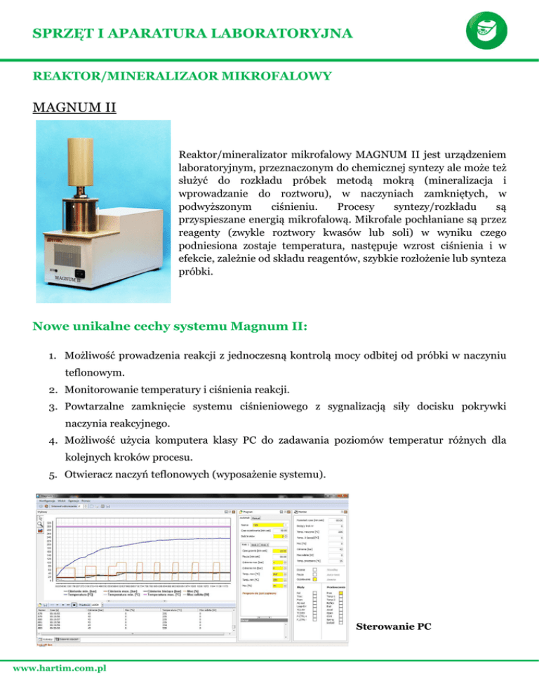 SPRZĘT I APARATURA LABORATORYJNA REAKTOR/MINERALIZAOR MIKROFALOWY MAGNUM II Reaktor/mineralizator mikrofalowy MAGNUM II jest urządzeniem laboratoryjnym, przeznaczonym do chemicznej syntezy ale może też służyć do rozkładu próbek metodą mokrą (mineralizacja i wprowadzanie do roztworu), w naczyniach zamkniętych, w podwyższonym ciśnieniu. Procesy syntezy/rozkładu są przyspieszane energią mikrofalową. Mikrofale pochłaniane są przez reagenty (zwykle roztwory kwasów lub soli) w wyniku czego podniesiona zostaje temperatura, następuje wzrost ciśnienia i w efekcie, zależnie od składu reagentów, szybkie rozłożenie lub synteza próbki. Nowe unikalne cechy systemu Magnum II: 1. Możliwość prowadzenia reakcji z jednoczesną kontrolą mocy odbitej od próbki w naczyniu teflonowym. 2. Monitorowanie temperatury i ciśnienia reakcji. 3. Powtarzalne zamknięcie systemu ciśnieniowego z sygnalizacją siły docisku pokrywki naczynia reakcyjnego. 4. Możliwość użycia komputera klasy PC do zadawania poziomów temperatur różnych dla kolejnych kroków procesu. 5. Otwieracz naczyń teflonowych (wyposażenie systemu). Sterowanie PC www.hartim.com.pl SPRZĘT I APARATURA LABORATORYJNA Parametry robocze: • Podstawowe zastosowanie: - chemiczne reakcje syntezy przebiegające w podwyższonym ciśnieniu i podwyższonej temperaturze - reakcje rozkładu próbek metodą mokrą (mineralizacja i wprowadzanie do roztworu), w naczyniach zamkniętych, w podwyższonym ciśnieniu • Przystosowanie do innych typów procesów chemicznych np. synteza, ekstrakcja: opcja • Znamionowy zakres temperatur roboczych: max. 300ºC • Znamionowy zakres ciśnień roboczych: max. 5MPa (50 bar) *) • Znamionowa wielkość próbki w reakcji mineralizacji: max. 1,5g **) • Reagenty stosowane w reakcjach syntezy i rozkładu: bez ograniczeń; substancje, które mogą oddziaływać na stal (np. HCl) należy usunąć z reaktora natychmiast po zakończeniu reakcji a głowicę i jej części składowe poddać czyszczeniu i konserwacji zgodnie z wskazówkami zawartymi w niniejszej instrukcji • Środowisko pracy: laboratorium analityczne; urządzenie przeznaczone jest do pracy w digestorium, przy sprawnie działającym systemie wyciągowym, z zapewnionym dostępem do wody bieżącej i odprowadzeniem ścieków (skażonych chemicznie). *) Producent dopuszcza pracę urządzenia w wyższym zakresie ciśnień tj. do 90 bar po przedsięwzięciu szczególnych środków ostrożności uzgodnionych z producentem urządzenia. **) Producent dopuszcza przeprowadzanie reakcji mineralizacji próbek większych niż 1,5g lecz mniejszych niż 5g po przedsięwzięciu szczególnych środków ostrożności i przy zastosowaniu specjalnej procedury pracy uzgodnionej z producentem urządzenia. Sposób umieszczenia próbki w teflonowym naczyniu reakcyjnym www.hartim.com.pl SPRZĘT I APARATURA LABORATORYJNA Przykłady mineralizacji i syntez ciśnieniowych: Rodzaj próbki Masa próbki Procedura mineralizacji Ciśnienie (max-min) Rozpuszczalniki Krew Nasiona lnu Kłącze tataraku Morszczyn 0.5g 0.5g 0.5g 0.5g 7min/100%, 7min/100%, 7min/100%, 7min/100%, 45-42 bar 45-42 bar 45-42bar 45-42 bar Włosy dziecka 1.0g 20-17 bar 30-27 bar 35-32 bar 45-42 bar Kopyto końskie 0.2g krok 1) 1min/50%,30sek/0%, krok 2) 1min/60%,30sek/0%, krok 3) 2min/70%,30sek/0%, krok 4) 2min/80%, 15min/100% 7ml HNO3, 6ml HNO3 6ml HNO3 6ml HNO3 2ml H2O2 7ml HNO3 3ml H2O Kości wołowe 0.2g 25min/100% 45-42 bar Woda, ścieki Wołowina chuda, świeża 50ml 5.0g 45-42 bar 20-17 bar 30-27 bar 35-32 bar 45-42 bar Kiełbasa średnio tłusta Ser twaróg Ser żółty Masło 1.0g 15/100% krok 1) 2min/80%, krok 2) 1min/60%,30sek/0%, krok 3) 2min/70%,30sek/0%, krok 4) 2min/80%, 6min/100%, 45-42 bar 6ml HNO3 1.0g 0.2g 45-42 bar 20-17bar 20-17 bar 30-27 bar 35-32 bar 45-42 bar 45-42 bar 45-42 bar 6ml HNO3 6ml HNO3 6ml HNO3 Słonina Kości zwierzęce 10min/100%, 10min/100%, krok 1) 2min/60%, krok 2) 2min/70%, krok 3) 2min/80%, krok 4) 5min/90%, 10min/100%, 15min/100%, www.hartim.com.pl 1.0g 1.0g 1.0g 45-42 bar 6ml HCl, 3ml H2O2 6ml HCl, 3ml H2 O2 7ml HNO 10ml HNO3 6ml HNO3 6ml HCl, 3ml H2O2 HARTIM HARTIM 71-065 Szczecin, al. Piastów 42 Tel.: 91 449-42-67 Fax: 91 449-42-68 Kom: 608-652-533, 507-044-005 e-mail: [email protected] www.hartim.com.pl