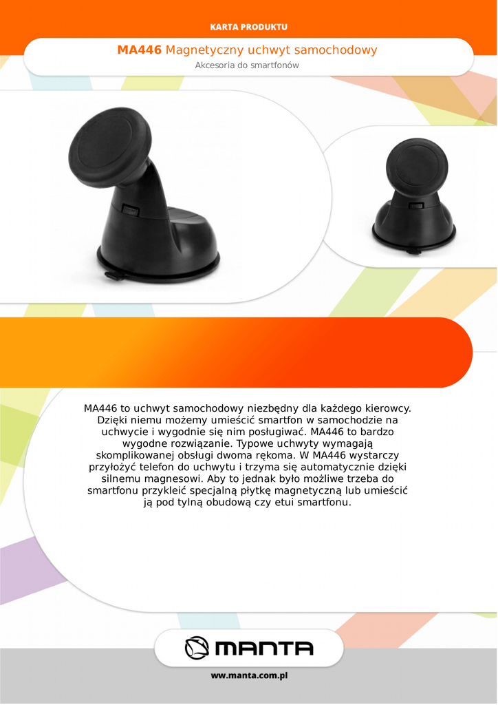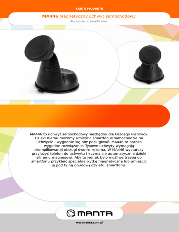 MA446Magnetycznyuchwytsamochodowy Akcesoriadosmartfonów MA446touchwytsamochodowyniezbędnydlakażdegokierowcy. Dziękiniemumożemyumieścićsmartfonwsamochodziena uchwycieiwygodniesięnimposługiwać.MA446tobardzo wygodnerozwiązanie.Typoweuchwytywymagają skomplikowanejobsługidwomarękoma.WMA446wystarczy przyłożyćtelefondouchwytuitrzymasięautomatyczniedzięki silnemumagnesowi.Abytojednakbyłomożliwetrzebado smartfonuprzykleićspecjalnąpłytkęmagnetycznąlubumieścić jąpodtylnąobudowączyetuismartfonu. MA446Magnetycznyuchwytsamochodowy Akcesoriadosmartfonów Specyfikacja Waga 120g Wymiary średnicaprzyssawki68mm,średnica uchwytu45mm,wymiarypłtyki magnetycznej65x45mm Cechyszczególne Uchwytmagnetyczny Sposóbmontażu Przyssawkadoszyby,smartfonmontowany magnetycznie Jakośćwykonania TworzywoABS Kolor Czarny http://www.manta.com.pl/pl/ma446 EAN:5902510600464
