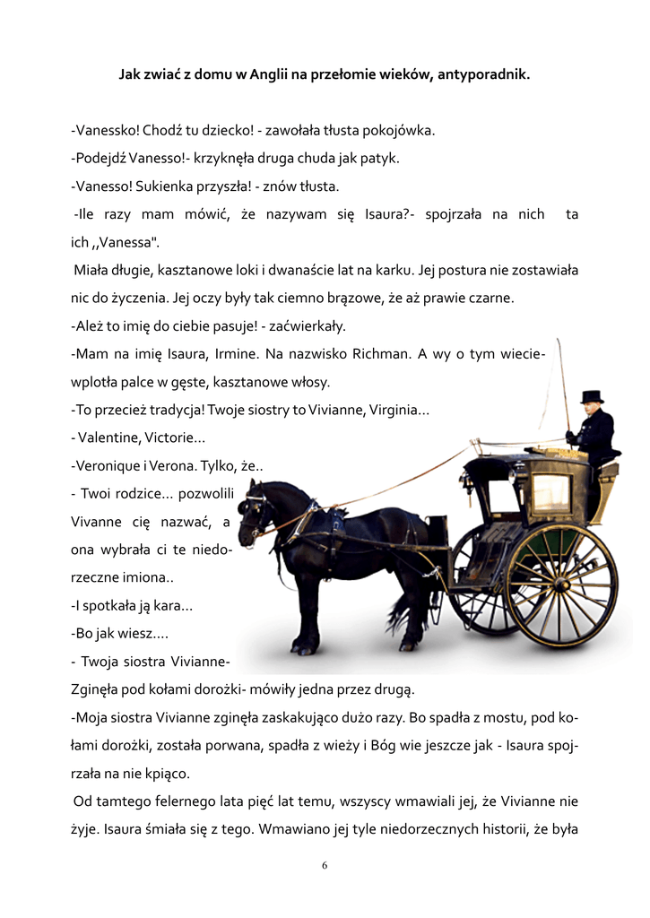 Jak zwiać z domu w Anglii na przełomie wieków, antyporadnik. -Vanessko! Chodź tu dziecko! - zawołała tłusta pokojówka. -Podejdź Vanesso!- krzyknęła druga chuda jak patyk. -Vanesso! Sukienka przyszła! - znów tłusta. -Ile razy mam mówić, że nazywam się Isaura?- spojrzała na nich ta ich ,,Vanessa". Miała długie, kasztanowe loki i dwanaście lat na karku. Jej postura nie zostawiała nic do życzenia. Jej oczy były tak ciemno brązowe, że aż prawie czarne. -Ależ to imię do ciebie pasuje! - zaćwierkały. -Mam na imię Isaura, Irmine. Na nazwisko Richman. A wy o tym wieciewplotła palce w gęste, kasztanowe włosy. -To przecież tradycja! Twoje siostry to Vivianne, Virginia... - Valentine, Victorie... -Veronique i Verona. Tylko, że.. - Twoi rodzice… pozwolili Vivanne cię nazwać, a ona wybrała ci te niedorzeczne imiona.. -I spotkała ją kara... -Bo jak wiesz.... - Twoja siostra VivianneZginęła pod kołami dorożki- mówiły jedna przez drugą. -Moja siostra Vivianne zginęła zaskakująco dużo razy. Bo spadła z mostu, pod kołami dorożki, została porwana, spadła z wieży i Bóg wie jeszcze jak - Isaura spojrzała na nie kpiąco. Od tamtego felernego lata pięć lat temu, wszyscy wmawiali jej, że Vivianne nie żyje. Isaura śmiała się z tego. Wmawiano jej tyle niedorzecznych historii, że była 6