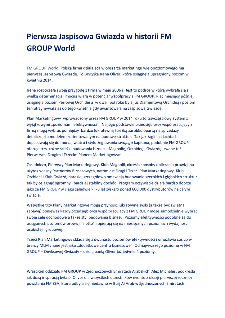 Pierwsza Jaspisowa Gwiazda w historii FM GROUP World FM GROUP World, Polska firma działająca w obszarze marketingu wielopoziomowego ma pierwszą Jaspisową Gwiazdę. To Brytyjka Irena Oliver, która osiągnęła upragniony poziom w kwietniu 2014. Irena rozpoczęła swoją przygodę z firmą w maju 2006 r. Jest to podróż w którą wybrała się z wielką determinacją i mocną wiarą w potencjał współpracy z FM GROUP. Pięć miesięcy później osiągnęła poziom Perłowej Orchidei a w dwa i pół roku była już Diamentową Orchideą i poziom ten utrzymywała aż do tego kwietnia gdy awansowała na Jaspisową Gwiazdę. Plan Marketingowy wprowadzony przez FM GROUP w 2014 roku to trzyczęściowy system z wyjątkowymi „poziomami efektywności”. Na jego podstawie przedsiębiorcy współpracujący z firmą mogą wybrać pomiędzy bardzo lukratywną ścieżką zarobku opartą na sprzedaży detalicznej a modelem zorientowanym na budowę struktur. Tak jak żagle na jachtach dopasowują się do morza, wiatru i stylu żeglowania swojego kapitana, podobnie FM GROUP oferuje trzy różne ścieżki budowania biznesu: Magnolię, Orchideę i Gwiazdę, zwane też Pierwszym, Drugim i Trzecim Planem Marketingowym. Zasadniczo, Pierwszy Plan Marketingowy, Klub Magnolii, określa sposoby obliczania prowizji na użytek własny Partnerów Biznesowych, natomiast Drugi i Trzeci Plan Marketingowy, Klub Orchidei i Klub Gwiazd, bardziej szczegółowo omawiają budowanie szerokich i głębokich struktur tak by osiągnąć ogromny i bardziej stabilny dochód. Program oczywiście działa bardzo dobrze jako że FM GROUP w ciągu zaledwie kilku lat zyskało ponad 600 000 dystrybutorów na całym świecie. Wszystkie trzy Plany Marketingowe mogą przynosić lukratywne zyski (a także być świetną zabawą) ponieważ każdy przedsiębiorca współpracujący z FM GROUP może samodzielnie wybrać swoje cele dochodowe a także styl budowania biznesu. Poziomy efektywności podobne są do osiąganych poziomów prowizji "netto" i opierają się na miesięcznych poziomach wydajności osobistej i grupowej. Trzeci Plan Marketingowy składa się z dwunastu poziomów efektywności i umożliwia coś co w branży MLM znane jest jako „dodatkowe centra biznesowe”. Od najwyższego poziomu w FM GROUP – Onyksowej Gwiazdy – dzielą panią Oliver już jedynie 4 poziomy. Właściciel oddziału FM GROUP w Zjednoczonych Emiratach Arabskich, Alex Michales, podkreśla jak dużą inspiracją była p. Oliver dla wszystkich uczestników eventu z okazji pierwszej rocznicy powstania FM ZEA, która odbyła się niedawno w Burj Al Arab w Zjednoczonych Emiratach Arabskich. Pani Irena była tam gościem honorowym oraz została poproszona o wygłoszenie przemowy. Michaels stwierdził, że „ ludzie byli poruszeni jej autentycznością i nieustępliwą postawą w dążeniu do celów i marzeń.” Michaels dodał też, że „Dzięki wspaniałym i dynamicznym członkom jej zespołu a także nieustępliwości Ireny, osiągnęła to (przyp. tłumacza – poziom Jaspisowej Gwiazdy) i wszyscy gratulujemy jej, jej zespołowi i oczywiście oddziałowi FM UK prowadzonemu przez wspaniały duet Anitę Sieniuc i Krzysztofa Mielocha, którzy także byli obecni na naszej imprezie. Jesteśmy w końcu jedną wielką rodziną i jestem zachwycony, że mogę być częścią tej fantastycznej podróży.” Na nowo osiągniętym poziomie efektywności, Irena zarobiła imponujące 60 000 euro w miesiąc. Zarządza międzynarodową strukturą liczącą ponad 25 000 osób. Działa głównie na rynkach brytyjskim, Litewskim i Ukraińskim. Tym co sprawia jej największą przyjemność we współpracy z FM GROUP jest możliwość pomagania kolegom w rozwoju a także pokazywanie im nowych możliwości na osiągnięcie sukcesu. FM GROUP Polska została założona w 2004 roku we Wrocławiu przez pana Artura Trawińskiego. Ze względu na szybki rozwój firmy, w 2007 roku powstała FM GROUP World po to by propagować markę za granicą. Firma przypisuje swój sukces skutecznemu połączeniu wysokiej jakości produktów szybko zbywalnych z bardzo lukratywnymi prowizjami dla Partnerów Biznesowych. FM GROUP wykorzystuje unikalny model biznesowy – marketing sieciowy w połączeniu ze sprzedażą bezpośrednią – tworzenie sprzyjającego środowiska dla rozwoju mikroprzedsiębiorstw, jako że firma oferuje współpracownikom profesjonalne szkolenia biznesowe oraz wsparcie. Biznes w marketingu sieciowym jest w dużej mierze oparty na związkach rodzinnych i relacjach międzyludzkich nic więc dziwnego, że firmę prowadzi małżeństwo – Artur i Katarzyna Trawińscy. Inną ważną postacią w FM GROUP jest pan Andrzej Trawiński, właściciel firmy Perfand – partnera biznesowego FM GROUP – który, tak się składa, jest także ojcem Artura. Drom Fragrances, globalna firma z ponad 100-letnim doświadczeniem, jest jednym z głównych dostawców firmy. Grono prestiżowych partnerów FM GROUP obejmuje też firmy Daimler AG oraz markę Mercedes-Benz, z którą FM GROUP tworzy Program Motywacyjny dla swoich Liderów – „Mercedesem po sukces”. Dziś, produkty FM GROUP są znane i kochane w ponad 40 krajach i ponad 60 000 Partnerów Biznesowych współpracuje z FM GROUP a liczba ta stale rośnie. -Zobacz więcej: http://www.obtainer-online.com/news/en/fm-group-world-welcomes-first-everjasper-star.html#sthash.IJboPis2.dpuf