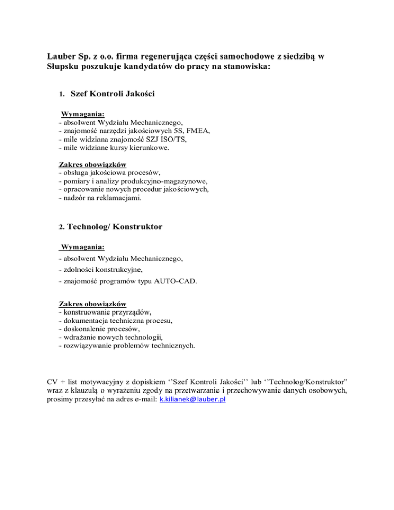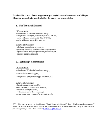 Lauber Sp. z o.o. firma regenerująca części samochodowe z siedzibą w Słupsku poszukuje kandydatów do pracy na stanowiska: 1. Szef Kontroli Jakości Wymagania: - absolwent Wydziału Mechanicznego, - znajomość narzędzi jakościowych 5S, FMEA, - mile widziana znajomość SZJ ISO/TS, - mile widziane kursy kierunkowe. Zakres obowiązków - obsługa jakościowa procesów, - pomiary i analizy produkcyjno-magazynowe, - opracowanie nowych procedur jakościowych, - nadzór na reklamacjami. 2. Technolog/ Konstruktor Wymagania: - absolwent Wydziału Mechanicznego, - zdolności konstrukcyjne, - znajomość programów typu AUTO-CAD. Zakres obowiązków - konstruowanie przyrządów, - dokumentacja techniczna procesu, - doskonalenie procesów, - wdrażanie nowych technologii, - rozwiązywanie problemów technicznych. CV + list motywacyjny z dopiskiem ‘’Szef Kontroli Jakości’’ lub ‘’Technolog/Konstruktor” wraz z klauzulą o wyrażeniu zgody na przetwarzanie i przechowywanie danych osobowych, prosimy przesyłać na adres e-mail: [email protected]