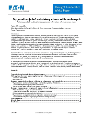 Optymalizacja infrastruktury chmur obliczeniowych Najlepsze praktyki w dziedzinie zarządzania środowiskiem informatycznym chmur Autor: Chris Loeffler Menedżer Aplikacji Ośrodków Danych, Dystrybuowane Rozwiązania Energetyczne, Eaton Corporation Streszczenie Technologie chmur obliczeniowych stanowią obecnie przedmiot wielu dyskusji i cieszą się olbrzymim zainteresowaniem w świecie nowoczesnych korporacji informatycznych. Starając się zwiększać swoją produktywność i ograniczać koszty, organizacje i firmy o dowolnych rozmiarach szybko wdrażają oprogramowanie opracowane w oparciu o technologie, platformy i infrastruktury internetowe. Zgodnie z wynikami badań przeprowadzonych przez firmę analityczną International Data Corporation, w skali całego świata wartość wydatków ponoszonych przez przedsiębiorstwa w odniesieniu do usług dotyczących chmur rosła średnio w okresie od 2009 do 2013 roku o 26 procent rocznie, z 17,4 mld dolarów do 44,2 mld dolarów. Eksperci przewidują, że w okresie najbliższych kilku lat większość firm będzie korzystać przynajmniej z niektórych aplikacji i usług wykorzystujących technologię chmur. Oprócz możliwości w zakresie usprawnienia zarządzania i zwiększenia elastyczności, technologie chmur stanowią prawdziwe wyzwanie w odniesieniu do zapewnienia zasilania, właściwego chłodzenia oraz dostępności. Aby spełnić te wymagania, firmy muszą zwiększyć wydajność oraz niezawodność wykorzystywanych infrastruktur elektrycznych i mechanicznych. W niniejszym opracowaniu omówione zostały niektóre aspekty wdrażania technologii chmur, w szczególności dotyczące architektur wykorzystywanych w ośrodkach danych. Ponadto przedstawione zostały konkretne przykłady praktyk i technologii, które umożliwiają firmom lepsze wykorzystanie technologii chmur bez zwiększenia czasu przestojów, a także zużycia zasilania i obciążenia systemów chłodniczych. Spis treści Zrozumienie technologii chmur obliczeniowych ..................................................................................... 2 Jakie są konsekwencje technologii chmur dla infrastruktur informatycznych .................................... 3 Zasilanie i chłodzenie ............................................................................................................................... 3 Niezawodność........................................................................................................................................... 4 Strategie zapewnienia zasilania i chłodzenia infrastruktur technologii chmur .................................... 4 Wykorzystanie zasilania modułowego i elementów systemu chłodzenia ................................................. 4 Zastosowanie pasywnego systemu chłodzenia ........................................................................................ 5 Wykorzystanie wielu pomieszczeń dla wyposażenia ............................................................................... 7 Strategie mające na celu zwiększenie niezawodności infrastruktury ................................................... 7 Przeprowadzenie audytu łańcucha zasilania ............................................................................................ 7 Zapewnienie dodatkowej redundancji architektury zasilania .................................................................... 7 Zastosowanie oprogramowania do replikacji............................................................................................ 9 Wykorzystanie oprogramowania do migracji w czasie rzeczywistym ....................................................... 9 Zastosowanie zintegrowanego oprogramowania zarządzającego ........................................................... 9 Podsumowanie .......................................................................................................................................... 10 O firmie Eaton ............................................................................................................................................ 10 O autorze .................................................................................................................................................... 11 EPE0747 www.eaton.eu/powerquality listopad 2013 Strona 2 / 11 Zrozumienie technologii chmur obliczeniowych Pomimo różnorakich definicji, zasadniczo technologie chmur obliczeniowych polegają na zapewnieniu w czasie rzeczywistym obsługi infrastruktur informatycznych, usług oraz oprogramowania za pośrednictwem sieci Internet lub wewnętrznych infrastruktur opracowanych na bazie technologii internetowych. W ujęciu ogólnym rozwiązania dotyczące chmur mogą zostać podzielone na trzy najważniejsze kategorie: Rozwiązania „Oprogramowanie jako usługa” (SaaS) zapewniają oprogramowanie za pośrednictwem chmury. Typowe przykłady oferowanych rozwiązań SaaS to internetowa aplikacja obsługi klientów salesforce.com, a także zestaw aplikacji internetowych Google Apps. Rozwiązania „Platforma jako usługa” (PaaS) zapewniają dostęp internetowy do zasobów obliczeniowych oraz narzędzi programowania wykorzystywanych przez deweloperów w zakresie opracowywania i hostingu aplikacji na bazie technologii chmur. Typowe przykłady rozwiązań PaaS to opracowana przez salesforce.com aplikacja force.com oraz Microsoft Windows Azure. Rozwiązania „Infrastruktura jako usługa” (IaaS) zapewniają zasoby infrastrukturalne, takie jak przestrzeń dyskowa oraz zasób mocy obliczeniowej w sieci Internet. Najbardziej znanym dostawcą usług IaaS jest Amazon Web Services. Niezależnie od kategorii, do której należą, rozwiązania dotyczące chmur mogą być dostarczane za pośrednictwem „chmury publicznej” lub „chmury prywatnej.” Rozwiązania chmur publicznych umożliwiają wymianę danych w sieci Internet. W ujęciu ogólnym nie wymagają one od użytkownika żadnej specyficznej infrast