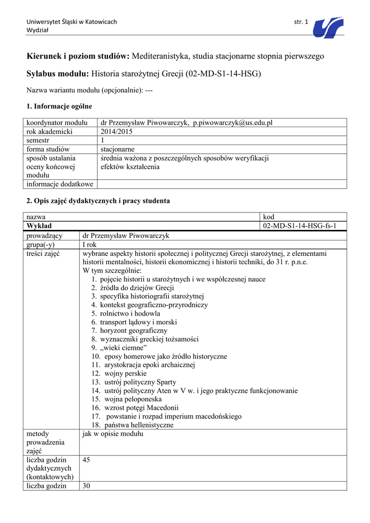 Uniwersytet Śląski w Katowicach Wydział str. 1 Kierunek i poziom studiów: Mediteranistyka, studia stacjonarne stopnia pierwszego Sylabus modułu: Historia starożytnej Grecji (02-MD-S1-14-HSG) Nazwa wariantu modułu (opcjonalnie): --1. Informacje ogólne koordynator modułu rok akademicki semestr forma studiów sposób ustalania oceny końcowej modułu informacje dodatkowe dr Przemysław Piwowarczyk, [email protected] 2014/2015 1 stacjonarne średnia ważona z poszczególnych sposobów weryfikacji efektów kształcenia 2. Opis zajęć dydaktycznych i pracy studenta nazwa Wykład prowadzący grupa(-y) treści zajęć metody prowadzenia zajęć liczba godzin dydaktycznych (kontaktowych) liczba godzin kod 02-MD-S1-14-HSG-fs-1 dr Przemysław Piwowarczyk I rok wybrane aspekty historii społecznej i politycznej Grecji starożytnej, z elementami historii mentalności, historii ekonomicznej i historii techniki, do 31 r. p.n.e. W tym szczególnie: 1. pojęcie historii u starożytnych i we współczesnej nauce 2. źródła do dziejów Grecji 3. specyfika historiografii starożytnej 4. kontekst geograficzno-przyrodniczy 5. rolnictwo i hodowla 6. transport lądowy i morski 7. horyzont geograficzny 8. wyznaczniki greckiej tożsamości 9. „wieki ciemne” 10. eposy homerowe jako źródło historyczne 11. arystokracja epoki archaicznej 12. wojny perskie 13. ustrój polityczny Sparty 14. ustrój polityczny Aten w V w. i jego praktyczne funkcjonowanie 15. wojna peloponeska 16. wzrost potęgi Macedonii 17. powstanie i rozpad imperium macedońskiego 18. państwa hellenistyczne jak w opisie modułu 45 30 Uniwersytet Śląski w Katowicach Wydział pracy własnej studenta opis pracy własnej studenta organizacja zajęć literatura obowiązkowa literatura uzupełniająca adres strony www zajęć informacje dodatkowe str. 2 lektura tekstów źródłowych, studium map i materiałów ikonograficznych 3 godziny dydaktyczne (135 min.) raz w tygodniu, czas i miejsce według harmonogramu --Z tomu B. Bravo, E. Wipszycka, Historia starożytnych Greków, t. I, Warszawa 1988: • charakterystyka środowiska geograficznego (6-19 ) • poematy homerowe (s. 120-126) • społeczeństwo czasów archaicznych (s. 127-155) • aneks ilustracyjny (strony nienumerowane) W. Lengauer, Starożytna Grecja okresu archaicznego i klasycznego, Warszawa 1999, s. 45-111 (Kryzys i rozwój Grecji od wieku VII do wojen perskich); s. 1120152 (świat grecki u szczytu świetności) Z tomu Antropologia antyku greckiego. Zagadnienia i wybór tekstów, oprac. W. Lengauer, L. Trzcionkowski, Warszawa 2011: • F. Cassola, Kim byli Grecy? (s. 57-72) • J. Burckhardt, Polis grecka (s. 89-97) • M. Węcowski, Sympozjon, czyli wino jako źródło kultury (s. 399-413) L. Russo, Zapomniana rewolucja. Grecka myśl naukowa a nauka nowoczesna, Kraków 2005, s. 259-283 (rozdział nauka, technika i gospodarka) - 3. Opis sposobów weryfikacji efektów kształcenia modułu nazwa kod 02-MD-S1-14-HSG-w-1 Pisemna weryfikacja wiedzy kod(-y) zajęć 02-MD-S1-14-HSG-fs-1 osoba(-y) dr Przemysław Piwowarczyk przeprowadzająca(e) weryfikację grupa(-y) I rok wymagania znajomość treści poruszanych na wykładach; umiejętność interpretacji tekstów merytoryczne źródłowych omawianych na wykładach; umiejętność odczytywania i wskazywania danych kartograficznych na mapie historycznej; umiejętność odczytywania i interpretacji danych tabelarycznych omawianych na wykładach kryteria oceny Egzamin ma charakter pisemny; składa się z pięciu pytań, które student wybiera losowo; z nich przynajmniej jedno opiera się o kartografię, ikonografię lub dane tabelaryczne; kryterium oceny jest poprawność odpowiedzi przebieg procesu harmonogram zgodny z organizacją roku akademickiego weryfikacji informacje dodatkowe