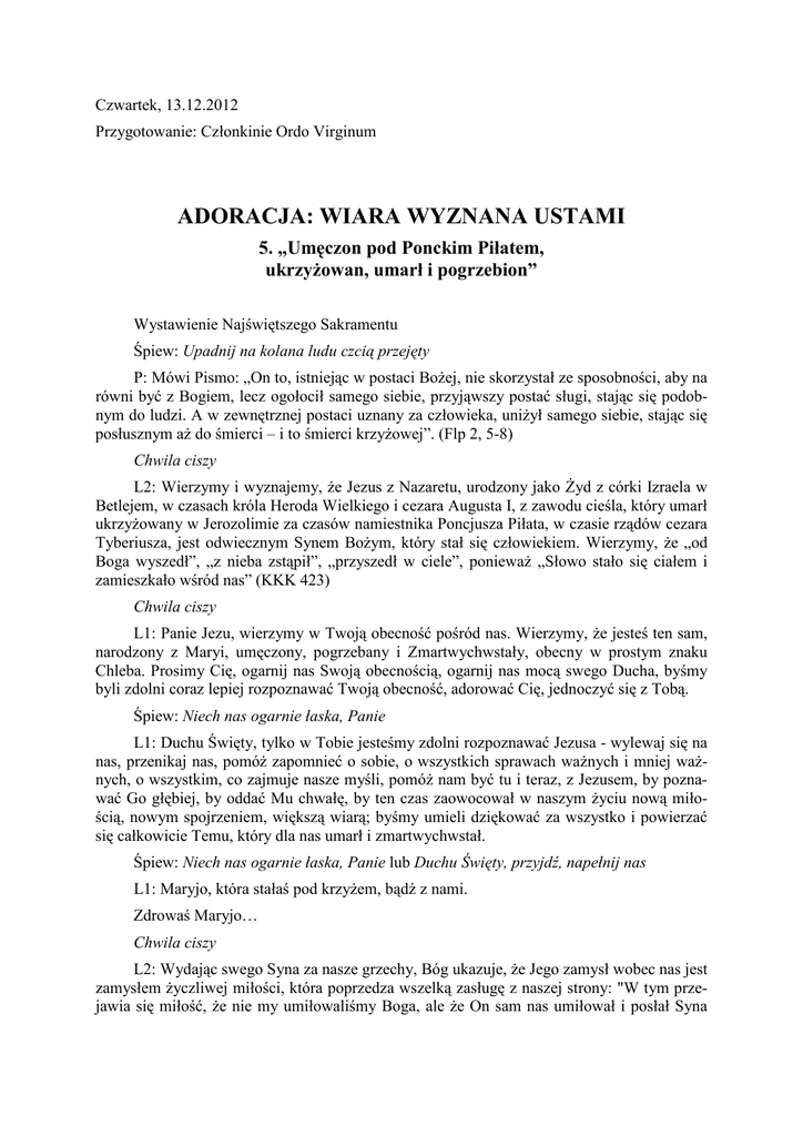 Czwartek, 13.12.2012 Przygotowanie: Członkinie Ordo Virginum ADORACJA: WIARA WYZNANA USTAMI 5. „Umęczon pod Ponckim Piłatem, ukrzyŜowan, umarł i pogrzebion” Wystawienie Najświętszego Sakramentu Śpiew: Upadnij na kolana ludu czcią przejęty P: Mówi Pismo: „On to, istniejąc w postaci BoŜej, nie skorzystał ze sposobności, aby na równi być z Bogiem, lecz ogołocił samego siebie, przyjąwszy postać sługi, stając się podobnym do ludzi. A w zewnętrznej postaci uznany za człowieka, uniŜył samego siebie, stając się posłusznym aŜ do śmierci – i to śmierci krzyŜowej”. (Flp 2, 5-8) Chwila ciszy L2: Wierzymy i wyznajemy, Ŝe Jezus z Nazaretu, urodzony jako śyd z córki Izraela w Betlejem, w czasach króla Heroda Wielkiego i cezara Augusta I, z zawodu cieśla, który umarł ukrzyŜowany w Jerozolimie za czasów namiestnika Poncjusza Piłata, w czasie rządów cezara Tyberiusza, jest odwiecznym Synem BoŜym, który stał się człowiekiem. Wierzymy, Ŝe „od Boga wyszedł”, „z nieba zstąpił”, „przyszedł w ciele”, poniewaŜ „Słowo stało się ciałem i zamieszkało wśród nas” (KKK 423) Chwila ciszy L1: Panie Jezu, wierzymy w Twoją obecność pośród nas. Wierzymy, Ŝe jesteś ten sam, narodzony z Maryi, umęczony, pogrzebany i Zmartwychwstały, obecny w prostym znaku Chleba. Prosimy Cię, ogarnij nas Swoją obecnością, ogarnij nas mocą swego Ducha, byśmy byli zdolni coraz lepiej rozpoznawać Twoją obecność, adorować Cię, jednoczyć się z Tobą. Śpiew: Niech nas ogarnie łaska, Panie L1: Duchu Święty, tylko w Tobie jesteśmy zdolni rozpoznawać Jezusa - wylewaj się na nas, przenikaj nas, pomóŜ zapomnieć o sobie, o wszystkich sprawach waŜnych i mniej waŜnych, o wszystkim, co zajmuje nasze myśli, pomóŜ nam być tu i teraz, z Jezusem, by poznawać Go głębiej, by oddać Mu chwałę, by ten czas zaowocował w naszym Ŝyciu nową miłością, nowym spojrzeniem, większą wiarą; byśmy umieli dziękować za wszystko i powierzać się całkowicie Temu, który dla nas umarł i zmartwychwstał. Śpiew: Niech nas ogarnie łaska, Panie lub Duchu Święty, przyjdź, napełnij nas L1: Maryjo, która stałaś pod krzyŜem, bądź z nami. Zdrowaś Maryjo… Chwila ciszy L2: Wydając swego Syna za nasze grzechy, Bóg ukazuje, Ŝe Jego zamysł wobec nas jest zamysłem Ŝyczliwej miłości, która poprzedza wszelką zasługę z naszej strony: "W tym przejawia się miłość, Ŝe nie my umiłowaliśmy Boga, ale Ŝe On sam nas umiłował i posłał Syna swojego jako ofiarę przebłagalną za nasze grzechy". "Bóg zaś okazuje nam swoją miłość właśnie przez to, Ŝe Chrystus umarł za nas, gdyśmy byli jeszcze grzesznikami". (KKK 604) Chwila ciszy L3: Bóg tak bardzo miłuje człowieka, Ŝe sam stawszy się człowiekiem, przyjmuje nawet jego śmierć i w ten sposób godzi sprawiedliwość z miłością. Godzina Jezusa jest godziną, w której zwycięŜa miłość. (Benedykt XVI „Dlaczego wierzę”). Śpiew: Tak Bóg umiłował świat Chwila ciszy L2: "Jak przez nieposłuszeństwo jednego człowieka wszyscy stali się grzesznikami, tak przez posłuszeństwo Jednego wszyscy staną się sprawiedliwymi". Przez swoje posłuszeństwo aŜ do śmierci Jezus stał się cierpiącym Sługą, który w sposób zastępczy "siebie na śmierć ofiarował", "poniósł grzechy wielu", aby "usprawiedliwić wielu i dźwigać ich nieprawości". (KKK 615) Chwila ciszy L1: Z proroka Izajasza: Zacny mój Sługa usprawiedliwi wielu, ich nieprawości On sam dźwigać będzie. Dlatego w nagrodę przydzielę Mu tłumy, i posiądzie moŜnych jako zdobycz, za to, Ŝe Siebie na śmierć ofiarował i policzony został pomiędzy przestępców. A On poniósł grzechy wielu, i oręduje za przestępcami. (Iz 53, 11b-12) L3: Lecz On się obarczył naszym cierpieniem, On dźwigał nasze boleści, a myśmy Go za skazańca uznali, chłostanego przez Boga i zdeptanego. Lecz On był przebity za nasze grzechy, zdruzgotany za nasze winy. Spadła Nań chłosta zbawienna dla nas, a w Jego ranach jest nasze zdrowie. Wszyscyśmy pobłądzili jak owce, kaŜdy z nas się obrócił ku własnej drodze, L1: a Pan zwalił na Niego winy nas wszystkich…(Iz 53,4-6) Chwila ciszy Śpiew: Adoramus Te Christe L1: Od grzechu rajskiego zaczęło się wzajemne oskarŜanie i zrzucanie winy na innych, Ty, Panie wziąłeś na Siebie winy nas wszystkich, prosimy Cię - naucz nas, tak jak Ty, raczej brać winę na siebie, niŜ oskarŜać. L2: Ty wisząc na drzewie krzyŜa odpuściłeś winę łotrowi, modliłeś się za prześladowców, prosimy - naucz nas przebaczać. L3: Chryste, gdy byłeś podwyŜszony na krzyŜu, Twój bok został przebity włócznią Ŝołnierza, prosimy - ulecz nasze rany. Śpiew: Adoramus Te Christe lub Jezus, Jezus 2 L2: Wiecie bowiem, Ŝe z waszego, odziedziczonego po przodkach, złego postępowania zostaliście wykupieni nie czymś przemijającym, srebrem lub złotem, ale drogocenną krwią Chrystusa jako baranka niepokalanego i bez zmazy.” (1 P 1, 18-19) L1: Prośmy więc słowami wziętymi z Litanii do Krwi Przenajświętszej: Krwi Chrystusa, Jednorodzonego Syna Ojca Przedwiecznego, -wybaw nas. Krwi Chrystusa, wcielonego Słowa BoŜego, Krwi Chrystusa, nowego i wiecznego Przymierza, Krwi Chrystusa, przy konaniu w Ogrójcu spływająca na ziemię, Krwi Chrystusa, tryskająca przy biczowaniu, Krwi Chrystusa, brocząca spod cierniowej korony, Krwi Chrystusa, przelana na krzyŜu, L2: Krwi Chrystusa, zapłato naszego zbawienia, Krwi Chrystusa, bez której nie ma przebaczenia, Krwi Chrystusa, która poisz i oczyszczasz dusze w Eucharystii, Krwi Chrystusa, zdroju miłosierdzia, Krwi Chrystusa, zwycięŜająca złe duchy, Krwi Chrystusa, męstwo Męczenników, Krwi Chrystusa, mocy Wyznawców, L.3:Krwi Chrystusa, rodząca Dziewice, Krwi Chrystusa, ostojo zagroŜonych, Krwi Chrystusa, ochłodo pracujących, Krwi Chrystusa, pociecho płaczących, Krwi Chrystusa, nadziejo po