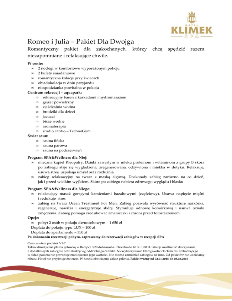 Romeo i Julia – Pakiet Dla Dwojga Romantyczny pakiet dla zakochanych, niezapomniane i relaksujące chwile. którzy chcą spędzić razem W cenie: • 2 noclegi w komfortowo wyposażonym pokoju • 2 bufety śniadaniowe • romantyczna kolacja przy świecach • obiadokolacja w dniu przyjazdu • niespodzianka powitalna w pokoju Centrum rekreacji – aquapark: • rekreacyjny basen z kaskadami i hydromasażem • gejzer powietrzny • zjeżdżalnia wodna • brodziki dla dzieci • jacuzzi • bicze wodne • aromaterapia • studio cardio – TechnoGym Świat saun: • sauna fińska • sauna parowa • sauna na podczerwień Program SPA&Wellness dla Niej: • mleczna kąpiel Kleopatry. Dzięki zawartym w mleku proteinom i witaminom z grupy B skóra po zabiegu staje się wygładzona, zregenerowana, odżywiona i miękka w dotyku. Relaksuje, usuwa stres, uspokaja umysł oraz rozluźnia • zabieg relaksacyjny na twarz z maską algową. Doskonały zabieg zarówno na co dzień, jak i przed wielkim wyjściem. Skóra po zabiegu nabiera zdrowego wyglądu i blasku Program SPA&Wellness dla Niego: • relaksujący masaż gorącymi kamieniami bazaltowymi (częściowy). Usuwa napięcie mięśni i redukuje stres • zabieg na twarz Ocean Treatment For Men. Zabieg pozwala wyrównać strukturę naskórka, regeneruje, nawilża i energetyzuje skórę. Stymuluje odnowę komórkową i usuwa oznaki zmęczenia. Zabieg pomaga zredukować zmarszczki i chroni przed fotostarzeniem Opcje: • pobyt 2 osób w pokoju dwuosobowym – 1 650 zł Dopłata do pokoju typu LUX – 100 zł Dopłata do apartamentu – 350 zł Po dokonaniu rezerwacji pobytu, zapraszamy do rezerwacji zabiegów w recepcji SPA Cena zawiera podatek VAT. Taksa klimatyczna płatna gotówką w Recepcji 3,20 doba/osoba. Dziecko do lat 3 - 1,00 zł. Istnieje możliwość skorzystania z dodatkowych zabiegów oraz atrakcji wg oddzielnego cennika. Niewykorzystanie któregokolwiek elementu wchodzącego w skład pakietu nie powoduje zmniejszenia jego wartości. Nie można zamieniać zabiegów na inne. Od pakietów nie udzielamy rabatu. Hotel nie przyjmuje zwierząt. W hotelu obowiązuje zakaz palenia. Pakiet ważny od 02.01.2015 do 08.03.2015