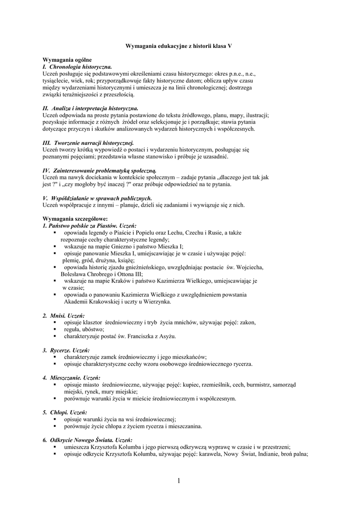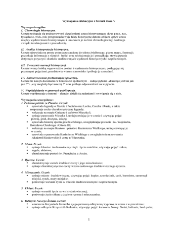 Wymagania edukacyjne z historii klasa V Wymagania ogólne I. Chronologia historyczna. Uczeń posługuje się podstawowymi określeniami czasu historycznego: okres p.n.e., n.e., tysiąclecie, wiek, rok; przyporządkowuje fakty historyczne datom; oblicza upływ czasu między wydarzeniami historycznymi i umieszcza je na linii chronologicznej; dostrzega związki teraźniejszości z przeszłością. II. Analiza i interpretacja historyczna. Uczeń odpowiada na proste pytania postawione do tekstu źródłowego, planu, mapy, ilustracji; pozyskuje informacje z różnych źródeł oraz selekcjonuje je i porządkuje; stawia pytania dotyczące przyczyn i skutków analizowanych wydarzeń historycznych i współczesnych. III. Tworzenie narracji historycznej. Uczeń tworzy krótką wypowiedź o postaci i wydarzeniu historycznym, posługując się poznanymi pojęciami; przedstawia własne stanowisko i próbuje je uzasadnić. IV. Zainteresowanie problematyką społeczną. Uczeń ma nawyk dociekania w kontekście społecznym – zadaje pytania „dlaczego jest tak jak jest ?" i „czy mogłoby być inaczej ?" oraz próbuje odpowiedzieć na te pytania. V. Współdziałanie w sprawach publicznych. Uczeń współpracuje z innymi – planuje, dzieli się zadaniami i wywiązuje się z nich. Wymagania szczegółowe: 1. Państwo polskie za Piastów. Uczeń: opowiada legendy o Piaście i Popielu oraz Lechu, Czechu i Rusie, a także rozpoznaje cechy charakterystyczne legendy; wskazuje na mapie Gniezno i państwo Mieszka I; opisuje panowanie Mieszka I, umiejscawiając je w czasie i używając pojęć: plemię, gród, drużyna, książę; opowiada historię zjazdu gnieźnieńskiego, uwzględniając postacie św. Wojciecha, Bolesława Chrobrego i Ottona III; wskazuje na mapie Kraków i państwo Kazimierza Wielkiego, umiejscawiając je w czasie; opowiada o panowaniu Kazimierza Wielkiego z uwzględnieniem powstania Akademii Krakowskiej i uczty u Wierzynka. 2. Mnisi. Uczeń: opisuje klasztor średniowieczny i tryb życia mnichów, używając pojęć: zakon, reguła, ubóstwo; charakteryzuje postać św. Franciszka z Asyżu. 3. Rycerze. Uczeń: charakteryzuje zamek średniowieczny i jego mieszkańców; opisuje charakterystyczne cechy wzoru osobowego średniowiecznego rycerza. 4. Mieszczanie. Uczeń: opisuje miasto średniowieczne, używając pojęć: kupiec, rzemieślnik, cech, burmistrz, samorząd miejski, rynek, mury miejskie; porównuje warunki życia w mieście średniowiecznym i współczesnym. 5. Chłopi. Uczeń: opisuje warunki życia na wsi średniowiecznej; porównuje życie chłopa z życiem rycerza i mieszczanina. 6. Odkrycie Nowego Świata. Uczeń: umieszcza Krzysztofa Kolumba i jego pierwszą odkrywczą wyprawę w czasie i w przestrzeni; opisuje odkrycie Krzysztofa Kolumba, używając pojęć: karawela, Nowy Świat, Indianie, broń palna; 1 wymienia następstwa wypraw odkrywczych dla Europy i dla Ameryki. 16. Mikołaj Kopernik i jego odkrycie. Uczeń: opowiada o życiu Mikołaja Kopernika, używając pojęć: uczony, astronom, odkrycie naukowe; opisuje i umieszcza w czasie odkrycie Mikołaja Kopernika, wyjaśniając, co znaczy powiedzenie: „Wstrzymał Słońce, ruszył Ziemię”. 17. Jadwiga i Jagiełło. Uczeń: wskazuje na mapie Wielkie Księstwo Litewskie; wyjaśnia przyczyny unii polsko-litewskiej; charakteryzuje osobę Jadwigi i wymienia jej zasługi dla kultury polskiej; opowiada o przyczynach i skutkach bitwy pod Grunwaldem. 18. Dwór Jagiellonów. Uczeń opisuje życie dworskie na Wawelu w okresie panowania Zygmuntów, używając pojęć: dwór, paziowie, komnata, arras. 19. Polski szlachcic. Uczeń: charakteryzuje obowiązki szlachcica wobec państwa, używając pojęć: sejm, sejmik, pospolite ruszenie; opisuje działalność gospodarczą polskiej szlachty, używając pojęć: folwark, pańszczyzna, kmiecie, spichlerz, spław rzeczny – Wisłą do Gdańska. 20. Rzeczpospolita Obojga Narodów. Uczeń: wyjaśnia, na czym polegała unia lubelska i wskazuje na mapie Rzeczypospolitą Obojga Narodów; opisuje, w jaki sposób dokonywano wyboru króla, używając pojęć: elekcja, pole elekcyjne, koronacja. 21. Rzeczpospolita w XVII w. Uczeń: sytuuje w czasie i omawia wydarzenia potopu szwedzkiego z uwzględnieniem obrony Częstochowy i postaci Stefana Czarnieckiego; sytuuje w czasie i opisuje wyprawę wiedeńską Jana III Sobieskiego, używając pojęć: oblężenie, odsiecz, sułtan, husaria. 22. Upadek I Rzeczypospolitej. Uczeń: podaje przykłady naprawy państwa polskiego za panowania Stanisława Augusta Poniatowskiego z uwzględnieniem Konstytucji 3 maja; omawia i sytuuje w czasie wydarzenia powstania kościuszkowskiego, używając pojęć: naczelnik powstania, przysięga Kościuszki, kosynierzy; wyjaśnia, w jakich okolicznościach doszło do upadku państwa polskiego, podaje datę III rozbioru. Osiągnięcia uczniów oceniane są poprzez: odpowiedzi ustne ( przynajmniej 1-2 w semestrze ), pisemne ( sprawdziany z całych działów, karty pracy, czytanie tekstów źródłowych ), praktyczne – posługiwanie się mapą , słownikiem, encyklopedią, obliczanie czasu minionych wydarzeń, czytanie i analizę książek popularno naukowych lub przygodowych. Przedmiotem oceniania są więc: Wiadomości, Umiejętności, Postawa – aktywność. Prowadzenie zeszytu uczniowskiego Aktywność na lekcji punktowana jest tzw. plusami, wpisywanymi do zeszytu nauczyciela, Zdobycie trzech plusów oznacza wpisanie oceny bardzo dobrej do dziennika – z aktywności! Oceny za samodzielnie !! wykonane prze ucznia zadanie domowe są zapisywane w zeszycie ucznia jak i nauczyciel odnotowuje je w swoim zeszycie. Pod koniec danego miesiąca jest obliczana z nich średnia arytmetyczna i wpisywana do dziennika. Poprawa sprawdzianów i kart pracy: 2 uczeń w terminie dwóch - trzech tygodni ( nauczyciel wyznacza termin ) ma obowiązek poprawić sprawdzian i kartę, jeśli otrzymał ocenę niedostateczną lub dopuszczając