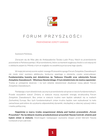Forum Przyszłości Przemówienie Doroty Gardias Szanowni Państwo, Zwracam się do Was jako do Ambasadorów Świata Ludzi Pracy. Niech to przemówienie pozostanie w Państwa pamięci. W przemówieniu, które za moment wygłoszę chodzi o coś więcej niż o zdobycie poparcia. Mówię o tym ze względu na zasadniczą przyczynę tego zjazdu. W mojej skromnej ocenie wybór nowego Przewodniczącego Forum Związków Zawodowych nie może mieć wymiaru plebiscytu, konkursu opartego o elementy czysto wizerunkowe. Fundamentalną kwestią jest dziedzictwo śp. Tadeusza Chwałki oraz założyciela Forum Związków Zawodowych - Wiesława Siewierskiego. O tym dziedzictwie nie można zapomnieć. Trzeba je umiejętnie dostrzec i na tym właśnie dziedzictwie zbudować nową jakość Forum Związków Zawodowych. Pamiętając o tym dziedzictwie zacznę to przemówienie od spraw w istocie fundamentalnych. Przede wszystkim statut! Zmiany w statucie muszą wyzwolić energię strukturalną Forum Związków Zawodowych. Bez zmian w statucie trudno nam będzie odnaleźć się w realiach Zachodniej Europy. Bez tych fundamentalnych zmian trudno będzie nam wybudować to koło zamachowe potrzebne do uzyskania odpowiedniej dynamiki, niezbędnej w obecnej sytuacji mikro i marko politycznej. Najpóźniej w marcu trzeba zorganizować debatę pod hasłem przewodnim „Forum Przyszłości”. Na tej debacie musimy przedyskutować przyszłość Naszej Centrali, właśnie pod kątem zmian w statucie. Dostrzegam następujące wyzwania stojące przed liderami Naszej Centarali w tym zakresie: 1 Po pierwsze. Trzeba obronić Forum Związków Zawodowych przed paraliżem strukturalno finansowym w zakresie pozyskiwania środków unijnych. Bez szerokiej dyskusji o podmiotowości struktur wojewódzkich, które dziś nie mają osobowości prawnej oraz nie posiadają w większości 10% wkładu finansowego zostaniemy outsiderami. Stanie się tak pomimo tego, że tak wiele wysiłku, determinacji włożyliście przez ostatnie kilka lat by skutecznie angażować się i budować szeroką obecność Forum Związków Zawodowych w procesach pozyskiwania środków unijnych z poprzedniej perspektywy. To jest właśnie jeden z elementów tego dziedzictwa, o którym mówiłam na początku. Kolejne wyzwanie to filozofii myślenia o strukturze Forum Związków Zawodowych. Otóż zarząd musi w większym stopniu partycypować we wszystkich możliwych procesach decyzyjnych. Prezydium w moim przekonaniu ma przede wszystkim odpowiadać za realizację, a rzadziej za kreację strategii krótko- i długoterminowych. Dlaczego? Bo ponad 40 organizacji wchodzi w skład Forum. W imię jakiego paradygmatu mniejsze organizacje nie mają zacząć w większym stopniu nadawać tonu dla inicjatyw prowadzonych przez forum? Bo są mniejsze? Bo są mniej reprezentatywne? A może dzieje się tak, bo brakuje odwagi do walki o prawa tych mniejszych, tych którzy nie zgromadzą dziesiątek tysiecy ludzi pod KPRM? Im mniejsza grupa zawodowa, tym potrzeba więcej odwagi, aby walczyć o jej prawa. Mam nadzieję, że tej odwagi nam nie zabraknie! Apeluję, abyście się nie lękali tego typu myślenia. Jeśli od kilku lat widzi się problemy tylko kilku grup zawodowych to powstaje przekonanie, że cała reszta grup zawodowych znajduje się w świetnej kondycji. Skoro pod Sejm przychodzą tylko pielęgniarki, górnicy i rolnicy to społeczeństwo otrzymuje za pośrednictwem mediów następujący komunikat - duże, bogate związki zawodowe chcą więcej. Nie możemy się uparcie trzymać takiej liny, bo tracą na tym wszyscy pielęgniarki, górnicy, kolejarze również. Po trzecie. Nowy Statut oparty o nowy sposób myślenia o strukturze Forum dający Wam narzędzia do utrzymania kondycji w zakresie obecności Naszej Centrali w ekosystemie nowej perspektywy unijnej utrzyma, a być może i wyzwoli kolejną falę potrzebnej energii, niezbędnej dynamiki. Mówię tutaj o kwestii zmiany jeśli chodzi o budowanie wizerunku Forum. Jest kilka kluczowych celów wizerunkowych, które powinniśmy wspólnie osiągnąć: - większa obecność w mediach rozumiana jako dążenie do wybudowania kadry liderów opinii płynących w głównym nurcie tradycyjnych środkach masowego przekazu; - sprawna i dopełniająca obszary czysto merytoryczne komunikacja z zakresu marketingu politycznego, mam tu na myśli przede wszystkim naszą obecność w kluczowych momentach, w takich, w których głos Naszej Centrali musi być słyszalny i wyrazisty; 2 - Internet rozumiany jako narzędzie do wywierania wpływu na poszczególne grupy. Wdrożenie strategii komunikacji zewnętrznej opartej między innymi na mediach społecznościowych będzie również ważnym źródłem nowej dynamiki. Internet pozwoli nam na przełamywanie stereotypów, skuteczniejszą i o wiele tańszą kampanię informacyjną. Dzięki skuteczności kampanii internetowych mamy ogromną szansę wybudować markę forum wyzwalającą nas ze stereotypu struktury postrzeganej jako betonową. Młodzi ludzie i nowa klasa średnia mogą zacząć współodczuwać trud z jakim zmagają się poszczególne grupy zawodowe. Nie zapominam również o kwestiach dotyczących szkoleń PR - owych, identyfikacji wizualnej Forum i kwestiach międzynarodowych. Chyba wszyscy się zgodzimy co do tego, że w pierwszej kolejności w kontekście zmiany wizerunku Forum Związków Zawodowych niezbędne jest wdrożenie nowoczesnej strony internetowej, bo ona jest wizytówką wszystkich działaczy! Jako osoba, która od kilku lat jest członkiem EKESu szczególną uwagę zwracam na kwestie międzynarodowe, które są potencjałem z następujących powodów: - to jest przede wszystkim pozycja Polski w Unii Europejskiej - markę Polski trzeba wykorzystać, aby wzmocnić obecność Forum Związków Zawodowych w EKZZ; - osobiście chcę położyć nacisk na budowanie kadry ambasadorów marki Forum Związków Zawodowych wykorzystując kontakty zdobyte w EKES, jak i w okre