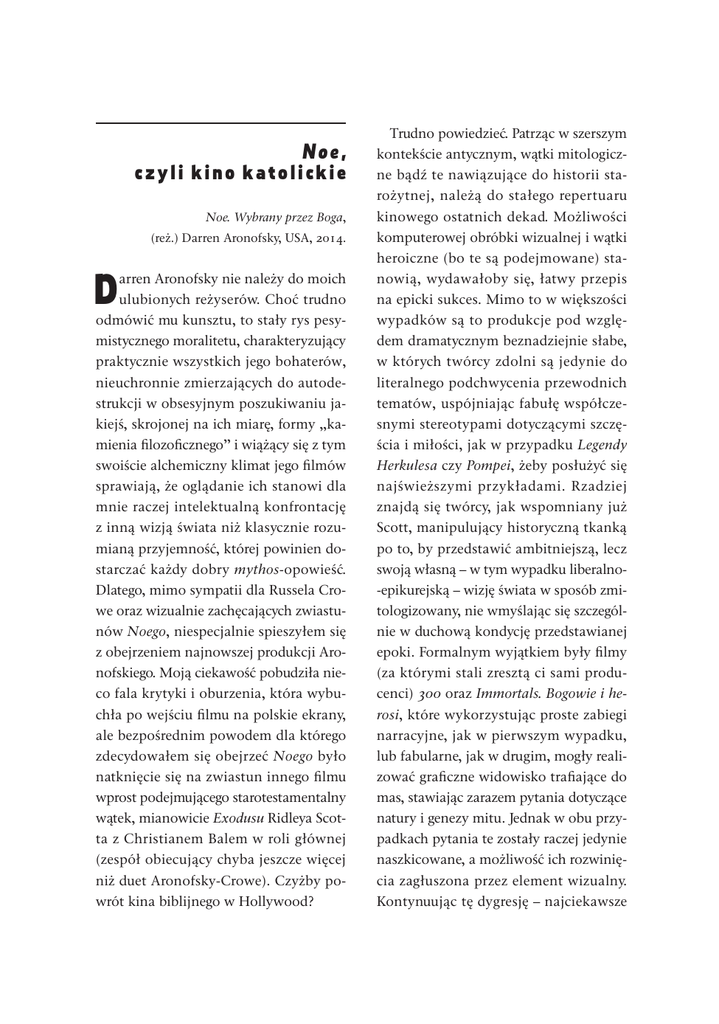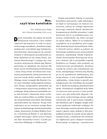 D Trudno powiedzieć. Patrząc w szerszym kontekście antycznym, wątki mitologiczne bądź te nawiązujące do historii starożytnej, należą do stałego repertuaru kinowego ostatnich dekad. Możliwości komputerowej obróbki wizualnej i wątki heroiczne (bo te są podejmowane) stanowią, wydawałoby się, łatwy przepis na epicki sukces. Mimo to w większości nów Noego, niespecjalnie spieszyłem się z obejrzeniem najnowszej produkcji Aronofskiego. Moją ciekawość pobudziła nieco fala krytyki i oburzenia, która wybuchła po wejściu filmu na polskie ekrany, ale bezpośrednim powodem dla którego zdecydowałem się obejrzeć Noego było natknięcie się na zwiastun innego filmu wprost podejmującego starotestamentalny wątek, mianowicie Exodusu Ridleya Scotta z Christianem Balem w roli głównej (zespół obiecujący chyba jeszcze więcej niż duet Aronofsky-Crowe). Czyżby powrót kina biblijnego w Hollywood? nie w duchową kondycję przedstawianej epoki. Formalnym wyjątkiem były filmy (za którymi stali zresztą ci sami producenci) 300 oraz Immortals. Bogowie i herosi, które wykorzystując proste zabiegi narracyjne, jak w pierwszym wypadku, lub fabularne, jak w drugim, mogły realizować graficzne widowisko trafiające do mas, stawiając zarazem pytania dotyczące natury i genezy mitu. Jednak w obu przypadkach pytania te zostały raczej jedynie naszkicowane, a możliwość ich rozwinięcia zagłuszona przez element wizualny. Kontynuując tę dygresję – najciekawsze Noe, c z y l i k i n o k a t o l i ck i e Noe. Wybrany przez Boga, (reż.) Darren Aronofsky, USA, 2014. arren Aronofsky nie należy do moich ulubionych reżyserów. Choć trudno odmówić mu kunsztu, to stały rys pesymistycznego moralitetu, charakteryzujący praktycznie wszystkich jego bohaterów, nieuchronnie zmierzających do autodestrukcji w obsesyjnym poszukiwaniu jakiejś, skrojonej na ich miarę, formy „kamienia filozoficznego” i wiążący się z tym swoiście alchemiczny klimat jego filmów sprawiają, że oglądanie ich stanowi dla mnie raczej intelektualną konfrontację z inną wizją świata niż klasycznie rozumianą przyjemność, której powinien dostarczać każdy dobry mythos-opowieść. Dlatego, mimo sympatii dla Russela Crowe oraz wizualnie zachęcających zwiastu- wypadków są to produkcje pod względem dramatycznym beznadziejnie słabe, w których twórcy zdolni są jedynie do literalnego podchwycenia przewodnich tematów, uspójniając fabułę współczesnymi stereotypami dotyczącymi szczęścia i miłości, jak w przypadku Legendy Herkulesa czy Pompei, żeby posłużyć się najświeższymi przykładami. Rzadziej znajdą się twórcy, jak wspomniany już Scott, manipulujący historyczną tkanką po to, by przedstawić ambitniejszą, lecz swoją własną – w tym wypadku liberalno-epikurejską – wizję świata w sposób zmitologizowany, nie wmyślając się szczegól- 364 Christianitas 56-57/2014 HYPERTEKSTY podejście do samego problemu „mitu” w ostatnich latach znalazłem w filmie animowanym adresowanym do młodszych widzów, ParaNorman, który (świadomie lub nie) w bajkowy sposób przedstawiał niemal czysto girardowskie wyjaśnienie genezy mitów ze wszystkimi najważniejszymi elementami teorii francuskiego myśliciela, począwszy od odróżnorodnienia, kryzysu mimetycznego, przez zniekształcenia prześladowcze, aż po heroizację kozła ofiarnego. Warto mieć ten kontekst w pamięci, ponieważ mówi on nie tylko o aktualnych trendach w kinematografii, lecz również o samej kondycji jej odbiorców, z jednej strony formowanych przez współczesne mity, a z drugiej – spontanicznie weryfikujących ich trafność 1. Ten formalny mechanizm całkowicie sprawdził się również w przypadku Noego Darrena Aronofskiego. Oczywiście tekstów biblijnych nie da się wrzucić do jednego worka z mitami (greckimi), niezależnie bowiem od osobistego stosunku do ich źródła, mamy tu do czynienia z zupełnie inną tkanką narracyjną oraz tradycją interpretacji. Mówiąc językiem wspomnianego już René Girarda, zaczerpniętym z pola egzegezy antropologicznej (a nie teologicznej), teksty biblijne są w istocie raczej anty-mitologiczne i stanowią demaskację mecha1 Czytelników bardziej wytrwałych i cierpliwych odsyłam do mojego starego już eseju Między fatum a marzeniem z „Christianitas” 39 (2008), w całości poświęconego temu problemowi. nizmu stojącego za powstaniem mitów, odsłaniając „rzeczy ukryte od założenia świata” (rzeczy, które mity sukcesywnie zasłaniają). I choć Girard ma na myśli przede wszystkim ukrywanie przez mity mechanizmów przemocy mimetycznej, to myślę, że można pozwolić sobie na rozciągnięcie tej opinii szerzej. Poważnie i integralnie potraktowany tekst biblijny będzie więc raczej demaskował nasze odruchy „mitologizujące”, odsłaniając jakąś prawdę o nas. W pewnym sensie tak stało się w przypadku Pasji Mela Gibsona, która odsłoniła odrealniającą mitologizację, jakiej współczesna wyobraźnia poddaje ofiarę i mękę Chrystusa. Żadnego filmu nie można też utożsamić z tekstem biblijnym, a tym bardziej z jego teologicznie rozumianą, pozatekstualną treścią (czy ściślej: Treścią), dlatego świadomie umieszczam tu film na poziomie arystotelesowsko rozumianego mitu – opowieści, która ożywia treści obecne w kulturze, uważając, że właśnie na takim poziomie film biblijny powinien być analizowany. Jak na tym planie wypada Noe? Większość zarzutów wobec filmu, z jakimi się spotkałem, miała charakter „ideologiczny”, wskazując między innymi, że Aronofsky zmienił oryginalną relację z Księgi Rodzaju i próbował przemycić szkodliwe – gnostyckie, jeśli nie wprost „demoniczne” – treści oraz obcy tekstowi ekologizm. Pomijając fakt, że ekologizm (nadmiernie akcentujący wartość przyrody lub nadający wszelkiej formie życia tę samą godność) stoi w sprzeczności z