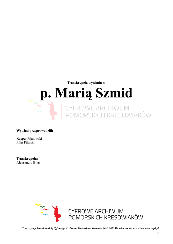 Transkrypcja wywiadu z: p. Marią Szmid Wywiad przeprowadzili: Kacper Fijałowski Filip Pilarski Transkrypcja: Aleksandra Biłas Transkrypcja jest własnością Cyfrowego Archiwum Pomorskich Kresowiaków © 2013 Wszelkie prawa zastrzeżone www.capk.pl 1 Jestem na tyle stara, że gimnazjum rozpoczęłam przed wojną światową. Normalnie miałam 13 lat jak zaczęłam gimnazjum. Pierwszą klasę gimnazjalną przedwojenną skończyłam, a potem to już wiadomo ’39 rok to już… gimnazjum, jeszcze chodziło się do tego samego gimnazjum, ale to już było co innego… to jest cała historia długa taka. A pani mieszkała w samym Wilnie? W samym Wilnie, Świętojańska 4 m. 3…potem przyszli Litwini, wszystkich ze służbowych mieszkań wyrzucili, z pracy wyrzucili, no więc mieszkaliśmy gdzie indziej, potem przenieśliśmy się na Piórową 19 A i stamtąd już wyjeżdżałam do Wilna… tzn. transportem uniwersyteckim, bo ojciec od wieków tam pracował jako taki gospodarny, jak to … szatnie prowadził, czy coś, w każdym bądź razie, tym transportem Wileńskim, uniwersyteckim, w ’44…w ’45 myśmy jechali, bo mama poszła, żeby coś dostać na drogę… jakiejś mąki czy tam krupy czy coś, bo przecież jechaliśmy 2 tygodnie w tych bydlęcych wagonach… no więc, mama spóźniła się i tym pierwszym transportem, nie jechaliśmy, drugim transportem jechaliśmy, i tak się zaczęło… Tak jak cały Uniwersytet Wileński, tak został do Gdańska przeniesiony… Cały nie. W Łodzi troszkę zostało… No właśnie, przez jakie miasta Państwo jechaliście? Tak tutaj /w Gdańsku/ medycyna… nie, dobrze tutaj medycyna, tutaj sztuki piękne, tutaj astronomia, tak… z Dziewulskim, także część uniwersytetu, to jest tutaj humanistyka to Łódź, no i tam… Toruń to też, tak… no i w Toruniu, zatrzymaliśmy się w Toruniu, ja mogę mówić o sobie, bo ci z wcześniejszego tego transportu…, bo właśnie mama spóźniła się, przez to dużo gorzej mieliśmy, ale z tego pierwszego transportu, to nawet dostali jakieś mieszkania ludzie, no bo to gro już jechało. Jechaliśmy, a myśmy w drugim jechali, więc 2 tygodnie jechało się. Wiadomo w jakich warunkach. Jakieś cegiełki, podłoży się ogień pod cegiełki, wody podgrzeją, bo przecież nie było mowy o obiadach jakiś, co kto miał…2 tygodnie się jechało, oczywiście bydlęce wagony, oczywiście brud i smród i wszystko to, co kto chciał. Ciasno, no ale wśród swoich… to jechali wszyscy swoi… Dostaliśmy z tego drugiego właśnie rzutu, to już nie było tych mieszkań, bo pierwszy rzut w Toruniu, jak zatrzymał się to w Weście, taki dom Westy był, także nawet tam mieszkanie dostali, profesor Wasiński tam był… tam jeszcze ktoś z tych dawnych pracowników, a my tu już jak przyjechaliśmy później, to już nie było mieszkań, to dostaliśmy w Toruniu, na Żeglarskiej ulicy, był taki hotel i tam 17 rodzin dostało lokum, tam po pokoju… po ile… oczywiście kuchnia była jedna, ale było dobrze… Znaczy chodziło się do PUR-u, a PUR, to jest Państwowy Urząd Repatriacyjny. Organizował te wszystkie wyjazdy, no bo trzeba było zdecydować się, albo obywatelstwo litewskie się bierze, albo repatriacja z Polski do Polski, no bo urodziłam się w Polsce, a nam napisali w dowodzie, Wilno ZSRR… jakimś cudem… wszyscy… A czy Państwa sąsiedzi, czy jacyś znajomi zostali w Wilnie? Czy przyjęli to obywatelstwo radzieckie? Rodzina, na pewno nie, bo my tam nie mieliśmy rodziny. Wśród znajomych, to właściwie zostawali ci, którzy byli przywiązani do ziemi, do domu…, a jak tak, no to… z państwowej pracy, no to …co Transkrypcja jest własnością Cyfrowego Archiwum Pomorskich Kresowiaków © 2013 Wszelkie prawa zastrzeżone www.capk.pl 2 mieliśmy do wyboru, mieszkania nie było już, pracy nie było, bo Litwini zaraz jak przyszli, to przywieźli, tzn. z Kowna przywieźli rząd cały i z pracy wszystkich wyrzucili… człowiek nie miał tam w ogóle perspektyw żadnych, ale ci, co oczywiście mieli jakieś dobra, czy coś, to chronili i zostali. Mam koleżankę, tzn. z nią robiłam tajne komplety, ale już ona nie żyje, a jej siostra teraz zrobiła obywatelstwo, tzn. dostała podwójne, starała się o podwójne obywatelstwo, a tak to nie znam nikogo. Starzy ludzie, którzy już nie mieli, ani pomocy…za ciężko im było nawet szykować się do tego transportu, to tamci może zostali, na wsi…ze wsi ludzie, też chyba zostali…wsi nie znam, z wakacji najwyżej znam wieś…no wiem, że zostawali tam niektórzy ludzie, ale tylko dlatego, że byli przywiązani do domu…lata całe…przecież to się siedziało lata całe i dopiero ta wojna nas wszystkich rozrzuciła po świecie… Przyjechaliśmy tym transportem, także mówię smród, brud straszny, no i jakoś szczęśliwie dostaliśmy po pokoiku tam…czy gdzieś jedna kuchnia, siedemnaście rodzin, to i tak nie można było nic tam specjalnie robić, ale chodziło się nad wodę, na dworzec, na tory kolejowe i PUR założył tam taką kuchnię i ci repatrianci, za pomoc w tej kuchni…obrać ziemniaki trzeba było, no szykować, bo 2 tygodnie tam staliśmy, ja nie mówię o drodze…droga no to każdy musiał kombinować jak mógł…tam w Łodzi zatrzymaliśmy się, w Skierniewicach, jeszcze się gdzieś…, ale tutaj, no to już dwa tygodnie siedzieliśmy na tych całych, no na dworcu, gdzieś tam…robiło się tam w takim jednym, że tak powiem, piec był, piękny piec, bo to był hotel, to ładne były pomieszczenia, jeszcze nie zniszczone, że tam, w jakimś żeliwnym rondelku robiło się…no co tam robiło się, ziemniaki najwyżej…no i tyle, bo ani pieniędzy nie było, ani możliwości nie było, no i tak…no, a młodzież, jak to młodzież oczywiście, trzeba do szkoły, to znaczy…z początku było tak, że ja na tajnych kompletach byłam. Można było jechać po małej maturze, dostaliśmy zaświadcze