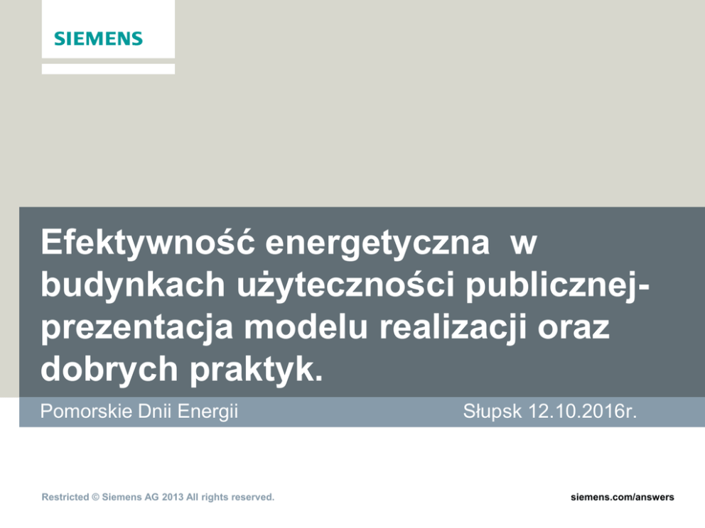 Efektywność energetyczna w budynkach użyteczności publicznejprezentacja modelu realizacji oraz dobrych praktyk. Pomorskie Dnii Energii Restricted © Siemens AG 2013 All rights reserved. Słupsk 12.10.2016r. siemens.com/answers Cele projektu 1. Modernizacja energetyczna dużej liczby budynków w krótkim okresie. 2. Trwałe, gwarantowane finansowo zmniejszenie zużycia energii w budynkach. 3. Przeniesienie większości ryzyk, zwłaszcza ryzyka budowy i ryzyka dostępności na partnera prywatnego 4. Finansowo zagwarantowane oszczędności Restricted © Siemens AG 2013All rights reserved. Page 2 Elżbieta Kaszyńska / BT BPS Wybrane projekty PPP W fazie zarządzania energią 1. UM Radzionków 2. Starostwo Kluczbork 3. UM Wołów I i II 4. UM Sosnowiec 5. UM Karczew 6. UG Świdnica 7. UG Piekoszów 8. UM Bytom 9. UM Ruda Śląska 10. UG Dębe Wielkie Okres umowy 10 10 10 10 14 10 15 15 10 15 W fazie realizacji 1. UM Kobyłka 2. UM Płock 15 17 Aktualne postępowanie PPP 1. UM Opalenica 2. UM Zgierz 3. UM Pabianice 4. Szpital Sosnowiec 5. UG Wiązowna 14 15 15 20 15 Restricted © Siemens AG 2013All rights reserved. Page 3 Elżbieta Kaszyńska / BT BPS Efektywność energetyczna – projekty w liczbach 1. Zarządzamy zdalnie od 2009r. 2. 2.000.000 m2, 3. 200 obiektów 4. 2 200 liczników 5. 8.000.000 PLN zagwarantowanych oszczędności rocznie 6. Realizacja projektów do 2030 roku Restricted © Siemens AG 2013All rights reserved. Page 4 Elżbieta Kaszyńska / BT BPS Wspólne przedsięwzięcie Urzędu Miasta Sosnowiec i Siemens otrzymało w 2015 r. prestiżową nagrodę dla najlepszego projektu w zakresie efektywności energetycznej w Europie Nagroda jest przyznawana przez Berlińską Agencję Energii wraz Komisją Europejską i Europejskim Bankiem Inwestycyjnym Przyznając nagrodę doceniono skalę przedsięwzięcia oraz innowacyjność formuły obejmującej gwarancję efektu energetycznego udzieloną przez Siemens Restricted © Siemens AG 2013All rights reserved. Page 5 Elżbieta Kaszyńska / BT BPS Best European Energy Service Project 2015 Restricted © Siemens AG 2013All rights reserved. Page 6 Elżbieta Kaszyńska / BT BPS Filary projektu 1. Modernizacja energetyczna budynku. 2. Określenie i zagwarantowanie efektu (oszczędności + komfort). 3. Zdalne zarządzanie 4. Aranżacja finansowa + spłata ratalna. 5. Procedura PPP/PZP, dialog konkurencyjny Restricted © Siemens AG 2013All rights reserved. Page 7 Elżbieta Kaszyńska / BT BPS Zarządząnie energią Modernizacja energetyczna budynku Restricted © Siemens AG 2013All rights reserved. Page 8 2016-10-13 Elżbieta Kaszyńska / BT BPS Zużycie ciepła w kolejnych trzech latach po modernizacji, projekt “Radzionków” Skumulowane oszczędności w okresie 3 lat po modernizacji GJ 9 000,0 8 000,0 7 000,0 6 000,0 5 000,0 4 000,0 3 000,0 2 000,0 1 000,0 0,0 Listopad Grudzień Styczeń Luty Marzec Kwiecień Maj Czerwiec Lipiec Sierpień Skorygowane zużycie bazowe ciepła Zużycie ciepła w 1 roku po modernizacji Zużycie ciepła w 2 roku po modernizacji Zużycie ciepła w 3 roku po modernizacji Gwarantowane 54,0% 1 rok 55,2% 2 rok 56,9% Wrzesień Październik 3 rok 58,0% Restricted © Siemens AG 2013All rights reserved. Page 9 Elżbieta Kaszyńska / BT BPS Jakie są korzyści z projektu? 1. Trwałe obniżenie zużycia energii 2. Szybka poprawa stanu technicznego dużej liczby obiektów. 3. Poprawa komfortu cieplnego – aspekt zdrowotny 4. Spłata ratalne nie blokuje środków na inne wydatki 5. Wiedza o zużyciu mediów, aspekt edukacyjny Oraz dobre ćwiczenie do przeprowadzenia trudniejszych projektów Restricted © Siemens AG 2013All rights reserved. Page 10 Elżbieta Kaszyńska / BT BPS Efekt ekologiczny? modernizacji siedemnastu zespołów szkół w Bytomiu Zagwarantowany roczny efekt ekologiczny wyłączenia z ruchu wszystkich samochodów osobowych w tym mieście na tydzień w każdym roku jest równoważny efektowi Restricted © Siemens AG 2013All rights reserved. Page 11 Elżbieta Kaszyńska / BT BPS Ewa Mikos Dyrektor ds. Rozwoju Biznesu Siemens Sp. z o.o. ul. Żupnicza 11 03-821 Warszawa tel. +48 22 870 91 04 tel.kom. +48 694463413 e-mail: [email protected] Restricted © Siemens AG 2013All rights reserved. Page 12 Elżbieta Kaszyńska / BT BPS Tak zwane “utrzymanie obiektów” w projekcie efektywności energetycznej w formule PPP Usługa prowadzona w okresie kontraktu, związana z ponoszeniem przez partnera prywatnego ryzyka dostępności, obejmująca: -zarządzanie energią z finansową gwarancją efektu, -utrzymanie w sprawności systemu zarzadzania i monitoringu oraz “ulepszeń bezpośrednio związanych” – w całym okresie kontraktu -inne zlecone prace np. okresowe przeglądy instalacji w budynku -opcja: eksploatacja urządzeń lub systemów Restricted © Siemens AG 2013All rights reserved. Page 13 Elżbieta Kaszyńska / BT BPS