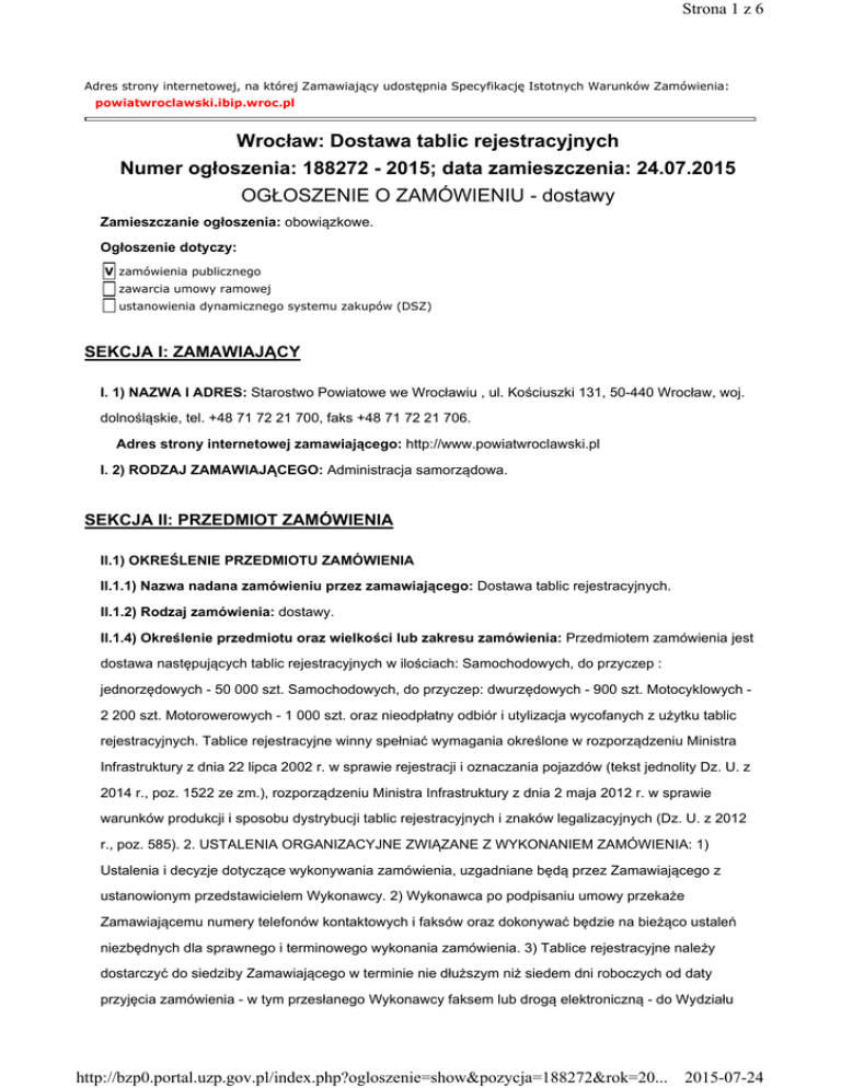 Strona 1 z 6 Adres strony internetowej, na której Zamawiający udostępnia Specyfikację Istotnych Warunków Zamówienia: powiatwroclawski.ibip.wroc.pl Wrocław: Dostawa tablic rejestracyjnych Numer ogłoszenia: 188272 - 2015; data zamieszczenia: 24.07.2015 OGŁOSZENIE O ZAMÓWIENIU - dostawy Zamieszczanie ogłoszenia: obowiązkowe. Ogłoszenie dotyczy: V zamówienia publicznego zawarcia umowy ramowej ustanowienia dynamicznego systemu zakupów (DSZ) SEKCJA I: ZAMAWIAJĄCY I. 1) NAZWA I ADRES: Starostwo Powiatowe we Wrocławiu , ul. Kościuszki 131, 50-440 Wrocław, woj. dolnośląskie, tel. +48 71 72 21 700, faks +48 71 72 21 706. Adres strony internetowej zamawiającego: http://www.powiatwroclawski.pl I. 2) RODZAJ ZAMAWIAJĄCEGO: Administracja samorządowa. SEKCJA II: PRZEDMIOT ZAMÓWIENIA II.1) OKREŚLENIE PRZEDMIOTU ZAMÓWIENIA II.1.1) Nazwa nadana zamówieniu przez zamawiającego: Dostawa tablic rejestracyjnych. II.1.2) Rodzaj zamówienia: dostawy. II.1.4) Określenie przedmiotu oraz wielkości lub zakresu zamówienia: Przedmiotem zamówienia jest dostawa następujących tablic rejestracyjnych w ilościach: Samochodowych, do przyczep : jednorzędowych - 50 000 szt. Samochodowych, do przyczep: dwurzędowych - 900 szt. Motocyklowych 2 200 szt. Motorowerowych - 1 000 szt. oraz nieodpłatny odbiór i utylizacja wycofanych z użytku tablic rejestracyjnych. Tablice rejestracyjne winny spełniać wymagania określone w rozporządzeniu Ministra Infrastruktury z dnia 22 lipca 2002 r. w sprawie rejestracji i oznaczania pojazdów (tekst jednolity Dz. U. z 2014 r., poz. 1522 ze zm.), rozporządzeniu Ministra Infrastruktury z dnia 2 maja 2012 r. w sprawie warunków produkcji i sposobu dystrybucji tablic rejestracyjnych i znaków legalizacyjnych (Dz. U. z 2012 r., poz. 585). 2. USTALENIA ORGANIZACYJNE ZWIĄZANE Z WYKONANIEM ZAMÓWIENIA: 1) Ustalenia i decyzje dotyczące wykonywania zamówienia, uzgadniane będą przez Zamawiającego z ustanowionym przedstawicielem Wykonawcy. 2) Wykonawca po podpisaniu umowy przekaże Zamawiającemu numery telefonów kontaktowych i faksów oraz dokonywać będzie na bieżąco ustaleń niezbędnych dla sprawnego i terminowego wykonania zamówienia. 3) Tablice rejestracyjne należy dostarczyć do siedziby Zamawiającego w terminie nie dłuższym niż siedem dni roboczych od daty przyjęcia zamówienia - w tym przesłanego Wykonawcy faksem lub drogą elektroniczną - do Wydziału http://bzp0.portal.uzp.gov.pl/index.php?ogloszenie=show&pozycja=188272&rok=20... 2015-07-24 Strona 2 z 6 Komunikacji Starostwa Powiatowego we Wrocławiu (parter), w ciągu godzin pracy, tj. 8.00 15.00 w opakowaniach po 50 szt. tablic pojedynczych, 4) Ilość zamawianych tablic rejestracyjnych może ulec zmianie w zależności od bieżących potrzeb Zamawiającego. 5) Wtórniki tablic rejestracyjnych, tablice indywidualne, tablice tymczasowe badawcze i tablice zabytkowe należy dostarczyć do siedziby Zamawiającego w terminie określonym w ofercie (Kryterium oceny ofert) liczonego od daty przyjęcia zamówienia - w tym przesłanego Wykonawcy faksem lub drogą elektroniczna - do Wydziału Komunikacji Starostwa Powiatowego we Wrocławiu (parter) w ciągu godzin pracy, tj. 8.00 - 15.00. 6) Zamawiający składa Wykonawcy zamówienia na tablice rejestracyjne, wtórniki tablic rejestracyjnych, tablice zabytkowe, tablice tymczasowe badawcze i tablice indywidualne zgodnie z zapotrzebowaniem., w dniach roboczych od poniedziałku do piątku. 7) Do każdej partii dostarczonych tablic rejestracyjnych Wykonawca dołączy protokół odbioru. 8) Tablice będą dostarczone transportem i na koszt Wykonawcy. Koszty załadunku, rozładunku i opakowania tablic rejestracyjnych obciążą Wykonawcę. 9) Mile widziane ale nie koniecznie wymagane przez Zamawiającego jest bezpłatne udostępnienie Zamawiającemu oprogramowania komputerowego służącego do zarządzania zamówieniem dotyczącym tablic rejestracyjnych (np.: zamówienie, ewidencja, rozliczenie, kontrola, statystyka, itd.) 3. WYMAGANIA STAWIANE WYKONAWCY: 1) Wykonawca zobowiązany jest posiadać w trakcie realizacji zamówienia aktualny wpis do rejestru przedsiębiorców produkujących tablice rejestracyjne wydane przez Marszałka Województwa właściwego dla siedziby przedsiębiorcy, o którym mowa w art. 75a ustawy z dnia 20 czerwca 1997 r. - Prawo o ruchu drogowym (Dz. U. z 2012 r., poz. 1137 ze zm.). 2) W przypadku zmiany wzoru tablic rejestracyjnych wprowadzonych w drodze zmiany przepisów ustawy z dnia 20 czerwca 1997 r. Prawo o ruchu drogowym, Wykonawca będzie dostarczał tablice wg nowych wzorów. 3) Wykonawca zobowiązuje się do nieodpłatnego odbierania, złomowania i utylizacji starych tablic rejestracyjnych - raz na kwartał. Złomowanie i utylizacja tablic rejestracyjnych odbywa się w sposób uniemożliwiający ich powtórne wykorzystanie. 4) Wykonawca na dostarczone tablice rejestracyjne udziela Zamawiającemu gwarancji na okres minimum 36 miesięcy, licząc od dnia wydania tablic rejestracyjnych właścicielowi w celu oznaczenia pojazdu. 5) Wykonawca odpowiedzialny będzie za całokształt, w tym za przebieg oraz terminowe wykonanie zamówienia w okresie wykonywania umowy jak i w okresie trwania gwarancji. 6) Wykonawca jest odpowiedzialny za zgodność z parametrami technicznymi i jakościowymi określonymi dla przedmiotu zamówienia do czasu wygaśnięcia zobowiązań Wykonawcy wobec Zamawiającego. 7) Wymagana jest należytą staranność przy realizacji zamówienia. 4. INFORMACJA O PODWYKONAWCACH 1) Zamawiający dopuszcza wykonanie zamówienia poprzez powierzenie wykonania części zamówienia podwykonawcom. 2) Zamawiający zastrzega obowiązek osobistego wykonania kluczowych części zamówienia przez Wykonawcę tj. produkcję tablic rejestracyjnych wytłoczonymi numerami lub tłoczenia numerów rejestracyjnych zgodnie z wymogami ustawy z dnia 20 czerwca 1997 r. Prawo o ruchu drogowym (Dz. U z 2012 r., poz. 1137 ze zm.) 3) W przy
