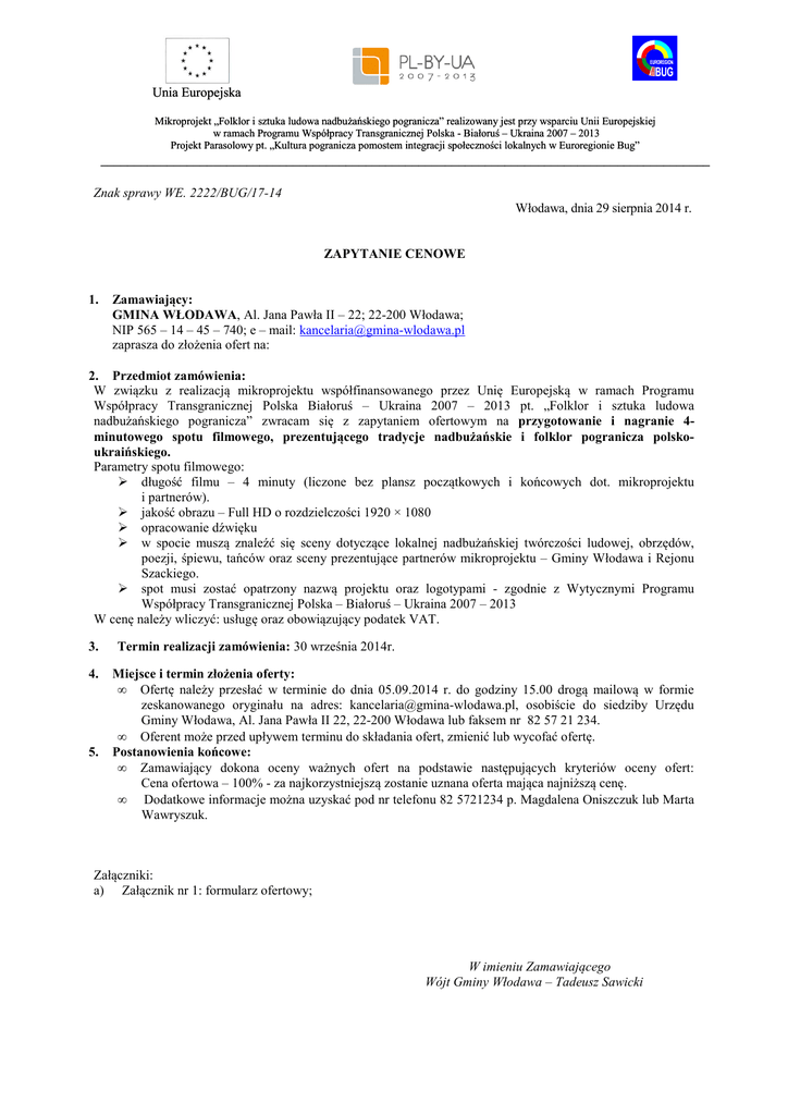 Unia Europejska Mikroprojekt „Folklor i sztuka ludowa nadbużańskiego pogranicza” realizowany jest przy wsparciu Unii Europejskiej w ramach Programu Współpracy Transgranicznej Polska - Białoruś – Ukraina 2007 – 2013 Projekt Parasolowy pt. „Kultura pogranicza pomostem integracji społeczności lokalnych w Euroregionie Bug” ____________________________________________________________________________________________ Znak sprawy WE. 2222/BUG/17-14 Włodawa, dnia 29 sierpnia 2014 r. ZAPYTANIE CENOWE 1. Zamawiający: GMINA WŁODAWA, Al. Jana Pawła II – 22; 22-200 Włodawa; NIP 565 – 14 – 45 – 740; e – mail: [email protected] zaprasza do złożenia ofert na: 2. Przedmiot zamówienia: W związku z realizacją mikroprojektu współfinansowanego przez Unię Europejską w ramach Programu Współpracy Transgranicznej Polska Białoruś – Ukraina 2007 – 2013 pt. „Folklor i sztuka ludowa nadbużańskiego pogranicza” zwracam się z zapytaniem ofertowym na przygotowanie i nagranie 4minutowego spotu filmowego, prezentującego tradycje nadbużańskie i folklor pogranicza polskoukraińskiego. Parametry spotu filmowego: długość filmu – 4 minuty (liczone bez plansz początkowych i końcowych dot. mikroprojektu i partnerów). jakość obrazu – Full HD o rozdzielczości 1920 × 1080 opracowanie dźwięku w spocie muszą znaleźć się sceny dotyczące lokalnej nadbużańskiej twórczości ludowej, obrzędów, poezji, śpiewu, tańców oraz sceny prezentujące partnerów mikroprojektu – Gminy Włodawa i Rejonu Szackiego. spot musi zostać opatrzony nazwą projektu oraz logotypami - zgodnie z Wytycznymi Programu Współpracy Transgranicznej Polska – Białoruś – Ukraina 2007 – 2013 W cenę należy wliczyć: usługę oraz obowiązujący podatek VAT. 3. 4. 5. Termin realizacji zamówienia: 30 września 2014r. Miejsce i termin złożenia oferty: • Ofertę należy przesłać w terminie do dnia 05.09.2014 r. do godziny 15.00 drogą mailową w formie zeskanowanego oryginału na adres: [email protected], osobiście do siedziby Urzędu Gminy Włodawa, Al. Jana Pawła II 22, 22-200 Włodawa lub faksem nr 82 57 21 234. • Oferent może przed upływem terminu do składania ofert, zmienić lub wycofać ofertę. Postanowienia końcowe: • Zamawiający dokona oceny ważnych ofert na podstawie następujących kryteriów oceny ofert: Cena ofertowa – 100% - za najkorzystniejszą zostanie uznana oferta mająca najniższą cenę. • Dodatkowe informacje można uzyskać pod nr telefonu 82 5721234 p. Magdalena Oniszczuk lub Marta Wawryszuk. Załączniki: a) Załącznik nr 1: formularz ofertowy; W imieniu Zamawiającego Wójt Gminy Włodawa – Tadeusz Sawicki Unia Europejska Mikroprojekt „Folklor i sztuka ludowa nadbużańskiego pogranicza” realizowany jest przy wsparciu Unii Europejskiej w ramach Programu Współpracy Transgranicznej Polska - Białoruś – Ukraina 2007 – 2013 Projekt Parasolowy pt. „Kultura pogranicza pomostem integracji społeczności lokalnych w Euroregionie Bug” ____________________________________________________________________________________________ Załącznik nr 1 do Zapytania ofertowego Znak sprawy WE. 2222/BUG/17-14 Oferta Wykonawcy Nazwa: ……………………………………………………………………………………………………………… Adres: ……………………………………………………………………………………………….……………… Numer NIP: ………………………………………………………………………………………………………… Numer REGON:………………………………………………………………………………….………………… Osoba upoważniona do kontaktów z Zamawiającym (imię, nazwisko, zajmowane stanowisko, nr telefonu, e-mail): …..………………………………………………………………………………………….……………… ___________________________________________________________________________ Skierowana do: Gmina Włodawa Al. Jana Pawła II – 22 22 – 200 Włodawa Nawiązując do zaproszenia do składania ofert Nr Znak sprawy WE. 2222/BUG/17-14 - przygotowanie i nagranie 4-minutowego spotu filmowego, prezentującego tradycje nadbużańskie i folklor pogranicza polsko-ukraińskiego. Oferuję wykonanie zamówienia za kwotę: Kwota brutto Kwota netto Podatek VAT Słownie brutto: …………………………………………………………………………………….……………………………..……….….. Oferent zaświadcza, że: Nie znajduje się w stanie upadłości lub likwidacji, jego działalność nie podlega nadzorowi sądowemu, nie zawarł ugody z wierzycielami, nie zawiesił działalności, nie toczy się wobec niego postępowanie w wyżej wymienionych sprawach lub nie znajduje się w podobnej sytuacji wynikającej z podobnych procedur zgodnie z przepisami i uregulowaniami krajowymi; Nie został skazany za przestępstwo związane z prowadzeniem działalności prawomocną decyzją właściwej instancji (od decyzji, której nie ma odwołania); Nie został uznany winnym poważnego naruszenia zasad prowadzenia działalności; Wypełnił swoje zobowiązania związane z opłatą składek na ubezpieczenie społeczne lub podatki zgodnie z przepisami państwa, gdzie ma być realizowany kontrakt; Nie została wobec niego wydana prawomocna decyzja w sprawie oszustwa, korupcji, udziału w organizacji przestępczej lub innej działalności niezgodnej z prawem na szkodę interesom finansowym Wspólnoty; Nie podlega obecnie karze administracyjnej zgodnie z pkt. 2.3.5 PRAG Ponadto oświadczam, że: 1) Wykonam zlecenie w wyznaczonym terminie. 2) Zapoznałem się ze szczegółami zamówienia, nie wnoszę żadnych zastrzeżeń oraz uzyskałem niezbędne informacje do przygotowania oferty. 3) W cenie oferty uwzględnione zostały wszystkie koszty wykonania zlece