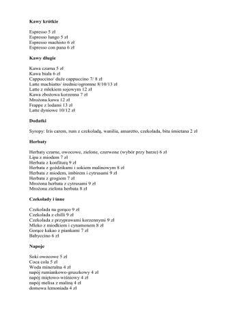 Kawy krótkie Espresso 5 zł Espresso lungo 5 zł Espresso machisto 6 zł Espresso con pana 6 zł Kawy długie Kawa czarna 5 zł Kawa biała 6 zł Cappuccino/ duże cappuccino 7/ 8 zł Latte machiatto/ średnie/ogromne 8/10/13 zł Latte z mlekiem sojowym 12 zł Kawa zbożowa korzenna 7 zł Mrożona kawa 12 zł Frappe z lodami 13 zł Latte dyniowe 10/12 zł Dodatki Syropy: Iris carem, rum z czekoladą, wanilia, amaretto, czekolada, bita śmietana 2 zł Herbaty Herbaty czarne, owocowe, zielone, czerwone (wybór przy barze) 6 zł Lipa z miodem 7 zł Herbata z konfiturą 9 zł Herbata z goździkami i sokiem malinowym 8 zł Herbata z miodem, imbirem i cytrusami 9 zł Herbata z grogiem 7 zł Mrożona herbata z cytrusami 9 zł Mrożona zielona herbata 8 zł Czekolady i inne Czekolada na gorąco 9 zł Czekolada z chilli 9 zł Czekolada z przyprawami korzennymi 9 zł Mleko z miodkiem i cynamonem 8 zł Gorące kakao z piankami 7 zł Babyccino 6 zł Napoje Soki owocowe 5 zł Coca cola 5 zł Woda mineralna 4 zł napój rumiankowo-gruszkowy 4 zł napój miętowo-wiśniowy 4 zł napój melisa z maliną 4 zł domowa lemoniada 4 zł Dla najmłodszych Bobo frut – różne smaki 6 zł Herbatka granulowane dla dzieci 4 zł Deserki owocowe 7 zł Owocowy talerzyk 6 zł Karotkowy kubeczek 5 zł Słodycze bezglutenowe, bez cukru, bez kazeiny, bez białka zwierzęcego – wybór przy barze. Desery: Ciasto dnia – zawsze inne  np.: Kremowy sernik z malinami - 9 zł Wegańską szarlotkę 7 zł Apple pie 8 zł Tort z truskawkami i rabarbarem 8 zł Tort Szarcwaldzki 8 zł Tarta cytrynowa 7 zł Bezglutenowe ciasto z dynią i świeżą żurawiną 8 zł Ciasto bardzo czekoladowe 7 z Ciasto śliwka w czekoladzie 9 zł Ciasto z jabłakami i rozmarynem 6 zł Francuskie gateau czekoladowe ciasto podawane z oliwą i solą morską 8 zł Placek drożdżowy ze śliwkami i kruszonką 7 zł Bułeczki maślane z konfiturą 6 zł Batony amarantusowe 3 zł Ciasteczka owsiane, czekoladowe i inne 1- 2 zł Miseczka żelków 4 zł Miseczka ziaren 5 zł Coś konkretnego Śniadanie dnia, np.: Jogurt z owocami i ziarenkami 8 zł Chleb na zakwasie z tofu i warzywami + kawa śniadaniowa lub herbata 13 zł Bułeczki maślane z konfiturą lub czekoladową + kawa śniadaniowa lub herbata 12 zl Chleb na zakwasie z szynką i warzywami + kawa śniadaniowa lub herbata 13 zł Bułeczki z twarogiem i miodem + kawa śniadaniowa lub herbata 13 zł Naleśnik z serem pleśniowym i szpinakiem + kawa śniadaniowa lub herbata 13 zł Naleśnik z bananem i czekoladą + kawa śniadaniowa lub herbata 13 zł