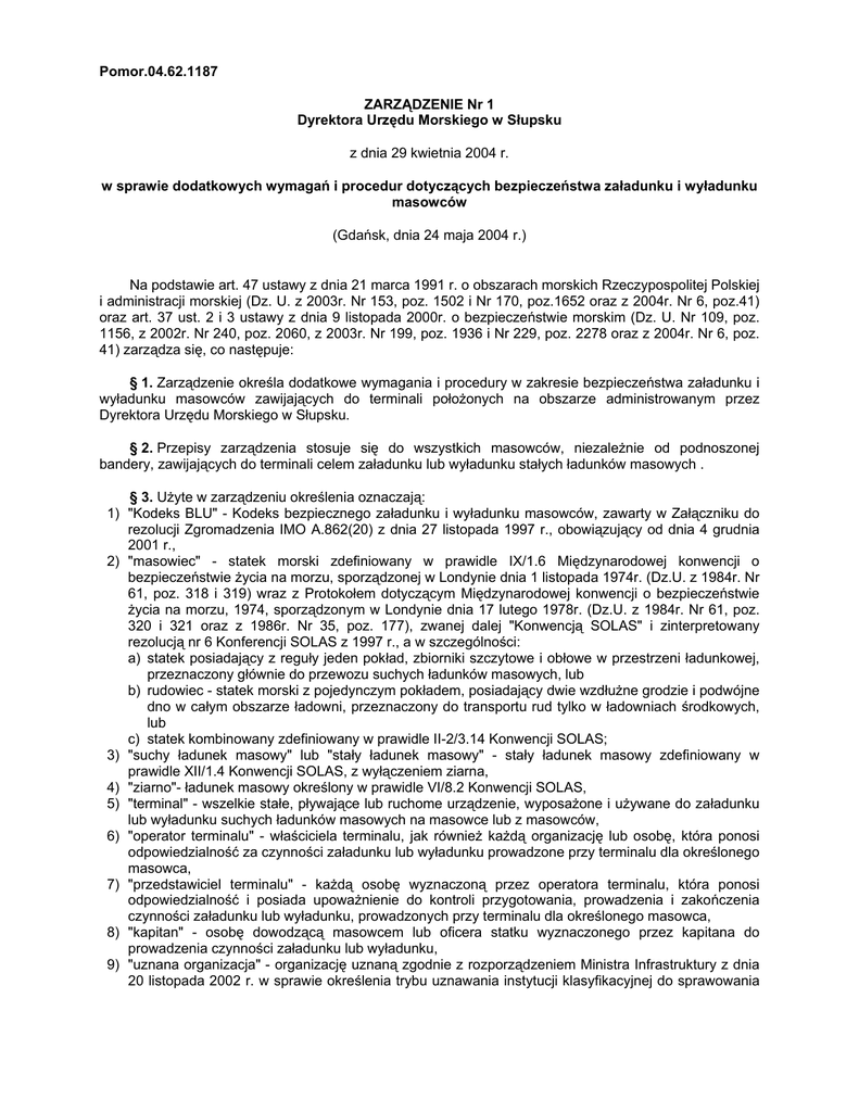 Pomor.04.62.1187 ZARZĄDZENIE Nr 1 Dyrektora Urzędu Morskiego w Słupsku z dnia 29 kwietnia 2004 r. w sprawie dodatkowych wymagań i procedur dotyczących bezpieczeństwa załadunku i wyładunku masowców (Gdańsk, dnia 24 maja 2004 r.) Na podstawie art. 47 ustawy z dnia 21 marca 1991 r. o obszarach morskich Rzeczypospolitej Polskiej i administracji morskiej (Dz. U. z 2003r. Nr 153, poz. 1502 i Nr 170, poz.1652 oraz z 2004r. Nr 6, poz.41) oraz art. 37 ust. 2 i 3 ustawy z dnia 9 listopada 2000r. o bezpieczeństwie morskim (Dz. U. Nr 109, poz. 1156, z 2002r. Nr 240, poz. 2060, z 2003r. Nr 199, poz. 1936 i Nr 229, poz. 2278 oraz z 2004r. Nr 6, poz. 41) zarządza się, co następuje: § 1. Zarządzenie określa dodatkowe wymagania i procedury w zakresie bezpieczeństwa załadunku i wyładunku masowców zawijających do terminali położonych na obszarze administrowanym przez Dyrektora Urzędu Morskiego w Słupsku. § 2. Przepisy zarządzenia stosuje się do wszystkich masowców, niezależnie od podnoszonej bandery, zawijających do terminali celem załadunku lub wyładunku stałych ładunków masowych . § 3. Użyte w zarządzeniu określenia oznaczają: 1) "Kodeks BLU" - Kodeks bezpiecznego załadunku i wyładunku masowców, zawarty w Załączniku do rezolucji Zgromadzenia IMO A.862(20) z dnia 27 listopada 1997 r., obowiązujący od dnia 4 grudnia 2001 r., 2) "masowiec" - statek morski zdefiniowany w prawidle IX/1.6 Międzynarodowej konwencji o bezpieczeństwie życia na morzu, sporządzonej w Londynie dnia 1 listopada 1974r. (Dz.U. z 1984r. Nr 61, poz. 318 i 319) wraz z Protokołem dotyczącym Międzynarodowej konwencji o bezpieczeństwie życia na morzu, 1974, sporządzonym w Londynie dnia 17 lutego 1978r. (Dz.U. z 1984r. Nr 61, poz. 320 i 321 oraz z 1986r. Nr 35, poz. 177), zwanej dalej "Konwencją SOLAS" i zinterpretowany rezolucją nr 6 Konferencji SOLAS z 1997 r., a w szczególności: a) statek posiadający z reguły jeden pokład, zbiorniki szczytowe i obłowe w przestrzeni ładunkowej, przeznaczony głównie do przewozu suchych ładunków masowych, lub b) rudowiec - statek morski z pojedynczym pokładem, posiadający dwie wzdłużne grodzie i podwójne dno w całym obszarze ładowni, przeznaczony do transportu rud tylko w ładowniach środkowych, lub c) statek kombinowany zdefiniowany w prawidle II-2/3.14 Konwencji SOLAS; 3) "suchy ładunek masowy" lub "stały ładunek masowy" - stały ładunek masowy zdefiniowany w prawidle XII/1.4 Konwencji SOLAS, z wyłączeniem ziarna, 4) "ziarno"- ładunek masowy określony w prawidle VI/8.2 Konwencji SOLAS, 5) "terminal" - wszelkie stałe, pływające lub ruchome urządzenie, wyposażone i używane do załadunku lub wyładunku suchych ładunków masowych na masowce lub z masowców, 6) "operator terminalu" - właściciela terminalu, jak również każdą organizację lub osobę, która ponosi odpowiedzialność za czynności załadunku lub wyładunku prowadzone przy terminalu dla określonego masowca, 7) "przedstawiciel terminalu" - każdą osobę wyznaczoną przez operatora terminalu, która ponosi odpowiedzialność i posiada upoważnienie do kontroli przygotowania, prowadzenia i zakończenia czynności załadunku lub wyładunku, prowadzonych przy terminalu dla określonego masowca, 8) "kapitan" - osobę dowodzącą masowcem lub oficera statku wyznaczonego przez kapitana do prowadzenia czynności załadunku lub wyładunku, 9) "uznana organizacja" - organizację uznaną zgodnie z rozporządzeniem Ministra Infrastruktury z dnia 20 listopada 2002 r. w sprawie określenia trybu uznawania instytucji klasyfikacyjnej do sprawowania nadzoru technicznego nad statkami oraz rodzajów i zakresów przeglądów statków morskich (Dz.U. Nr 208, poz.1768), 10) "rozporządzenie" - rozporządzenie Ministra Infrastruktury z dnia 31 stycznia 2003r. w sprawie bezpiecznego przewozu ładunków masowych statkami morskimi (Dz.U. Nr 35, poz. 295). § 4. Operator terminalu obowiązany jest upewnić się, że masowiec pod względem operacyjnym jest przygotowany do wykonania czynności załadunku lub wyładunku stałych ładunków masowych, zgodnie z wymaganiami określonymi w załączniku nr 1 do zarządzenia. § 5. Operator terminalu obowiązany jest: 1) zapewnić, by terminal spełniał wymagania określone w załączniku nr 2 do zarządzenia, 2) wyznaczyć osobę, która jest przedstawicielem terminalu, 3) przygotować informatory zawierające wymagania terminalu z uwzględnieniem jego specyfiki i wymaganiami określonymi dla tego terminalu przez Dyrektora Urzędu Morskiego w Słupsku oraz zawierające dane o porcie i terminalu w zakresie określonym w dodatku 1 ust. 1.2 Kodeksu BLU. Informatory te powinny być udostępniane przez przedstawicieli terminali kapitanom masowców zawijających do terminalu w celu załadunku lub wyładunku stałych ładunków masowych. § 6. 1. Kapitan obowiązany jest : a) zapewnić bezpieczeństwo załadunku i wyładunku masowca pozostającego pod jego dowództwem, b) przed przewidywanym czasem przybycia statku do terminalu, z odpowiednim wyprzedzeniem, przekazać przedstawicielowi terminalu informacje określone w załączniku nr 3 do zarządzenia, c) upewnić się przed każdym załadunkiem stałego ładunku masowego, że otrzymał informacje o ładunku wymagane rozporządzeniem, d) upewnić się przed rozpoczęciem jak również podczas załadunku lub wyładunku stałych ładunków masowych o wykonaniu obowiązków, określonych w załączniku nr 4 do zarządzenia. 2. Przedstawiciel terminalu obowiązany jest: a) przekazać kapitanowi informacje określone w załączniku nr 5 do zarządzenia, niezwłocznie po uzyskaniu od kapitana informacji o przewidywanym czasie przybycia statku na redę portu, b) upewnić się, że kapitan otrzymał informacje zawarte w formularzu deklaracji zgłoszenia ładunku, c) niezwłocznie poinformować kapitana i inspekcję portu o brakach zauważonych na statku, mogących wpływać na bezpieczeństwo czy