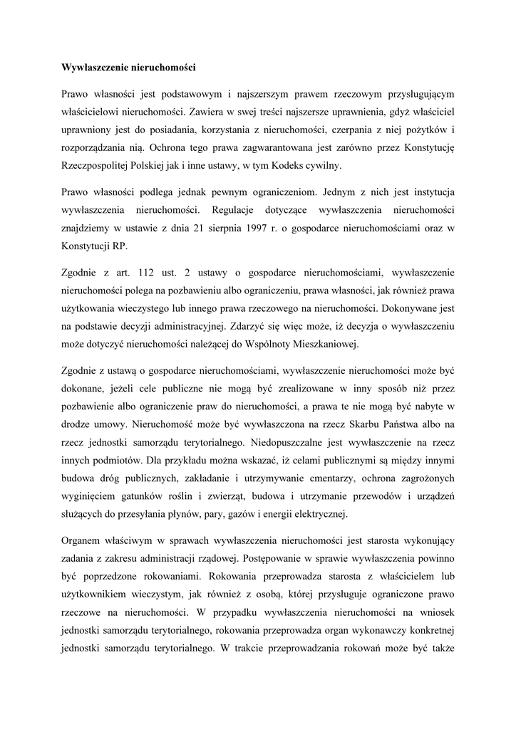 Wywłaszczenie nieruchomości Prawo własności jest podstawowym i najszerszym prawem rzeczowym przysługującym właścicielowi nieruchomości. Zawiera w swej treści najszersze uprawnienia, gdyż właściciel uprawniony jest do posiadania, korzystania z nieruchomości, czerpania z niej pożytków i rozporządzania nią. Ochrona tego prawa zagwarantowana jest zarówno przez Konstytucję Rzeczpospolitej Polskiej jak i inne ustawy, w tym Kodeks cywilny. Prawo własności podlega jednak pewnym ograniczeniom. Jednym z nich jest instytucja wywłaszczenia nieruchomości. Regulacje dotyczące wywłaszczenia nieruchomości znajdziemy w ustawie z dnia 21 sierpnia 1997 r. o gospodarce nieruchomościami oraz w Konstytucji RP. Zgodnie z art. 112 ust. 2 ustawy o gospodarce nieruchomościami, wywłaszczenie nieruchomości polega na pozbawieniu albo ograniczeniu, prawa własności, jak również prawa użytkowania wieczystego lub innego prawa rzeczowego na nieruchomości. Dokonywane jest na podstawie decyzji administracyjnej. Zdarzyć się więc może, iż decyzja o wywłaszczeniu może dotyczyć nieruchomości należącej do Wspólnoty Mieszkaniowej. Zgodnie z ustawą o gospodarce nieruchomościami, wywłaszczenie nieruchomości może być dokonane, jeżeli cele publiczne nie mogą być zrealizowane w inny sposób niż przez pozbawienie albo ograniczenie praw do nieruchomości, a prawa te nie mogą być nabyte w drodze umowy. Nieruchomość może być wywłaszczona na rzecz Skarbu Państwa albo na rzecz jednostki samorządu terytorialnego. Niedopuszczalne jest wywłaszczenie na rzecz innych podmiotów. Dla przykładu można wskazać, iż celami publicznymi są między innymi budowa dróg publicznych, zakładanie i utrzymywanie cmentarzy, ochrona zagrożonych wyginięciem gatunków roślin i zwierząt, budowa i utrzymanie przewodów i urządzeń służących do przesyłania płynów, pary, gazów i energii elektrycznej. Organem właściwym w sprawach wywłaszczenia nieruchomości jest starosta wykonujący zadania z zakresu administracji rządowej. Postępowanie w sprawie wywłaszczenia powinno być poprzedzone rokowaniami. Rokowania przeprowadza starosta z właścicielem lub użytkownikiem wieczystym, jak również z osobą, której przysługuje ograniczone prawo rzeczowe na nieruchomości. W przypadku wywłaszczenia nieruchomości na wniosek jednostki samorządu terytorialnego, rokowania przeprowadza organ wykonawczy konkretnej jednostki samorządu terytorialnego. W trakcie przeprowadzania rokowań może być także zaoferowana nieruchomość zamienna. Nieruchomość zamienną przyznawana jest z zasobu nieruchomości Skarbu Państwa, jeżeli wywłaszczenie ma nastąpić na rzecz Skarbu Państwa, lub z zasobu nieruchomości odpowiedniej jednostki samorządu terytorialnego, jeżeli wywłaszczenie następuje na rzecz tej jednostki. Wszczęcie postępowania wywłaszczeniowego na rzecz Skarbu Państwa następuje z urzędu, a na rzecz jednostki samorządu terytorialnego - na wniosek organu wykonawczego. Wszczęcie postępowania wywłaszczeniowego może nastąpić po upływie dwumiesięcznego terminu do zawarcia umowy wyznaczonego przez starostę właścicielowi, użytkownikowi wieczystemu nieruchomości, a także osobie, której przysługuje ograniczone prawo rzeczowe na nieruchomości. Rzeczony termin liczy się od dnia zakończenia rokowań. Starosta zobowiązany jest do złożenia w Sądzie Wieczystoksięgowym wniosku o ujawnienie w księdze wieczystej wszczęcia postępowania wywłaszczeniowego. Po wszczęciu postępowania wywłaszczeniowego starosta przeprowadza rozprawę administracyjną. W trakcie rozprawy administracyjnej strony mogą składać wyjaśnienia, zgłaszać żądania, propozycje i zarzuty oraz przedstawiać dowody na ich poparcie. Rozprawa o wywłaszczenie może zakończyć się wydaniem decyzji o wywłaszczeniu. Decyzja zgodnie z art. 119 ust. 1 ustawy o gospodarce nieruchomościami powinna zawierać przede wszystkim: 1) ustalenie na jakie cele nieruchomość jest wywłaszczana; 2) określenie przedmiotu wywłaszczenia przez podanie oznaczenia nieruchomości według księgi wieczystej lub zbioru dokumentów oraz według katastru nieruchomości; 3) określenie praw podlegających wywłaszczeniu; 4) wskazanie właściciela lub użytkownika wieczystego nieruchomości; 5) wskazanie osoby, której przysługują ograniczone prawa rzeczowe na nieruchomości; 6) zobowiązanie do zapewnienia lokali; 7) ustalenie wysokości odszkodowania. Przejście prawa własności nieruchomości na rzecz Skarbu Państwa lub jednostki samorządu terytorialnego następuje z dniem, w którym decyzja o wywłaszczeniu nieruchomości stała się prawomocna i ostateczna. O instytucji wywłaszczenia nieruchomości mowa również Konstytucji Rzeczpospolitej Polskiej. Zgodnie z art. 21 ust. 2 Konstytucji RP wywłaszczenie dopuszczalne jest jedynie wówczas, gdy jest dokonywane na cele publiczne i za słusznym odszkodowaniem. Wysokość odszkodowania wynika z decyzji o wywłaszczeniu. Co do zasady, ustalana jest ona według stanu i wartości wywłaszczanej nieruchomości w dniu wydania decyzji o wywłaszczeniu. Podstawę ustalenia wysokości odszkodowania stanowi wartość rynkowa nieruchomości. Szacuje ją rzeczoznawca majątkowy i określa w swojej wycenie. Odszkodowania otrzymuje się jednorazowo, w terminie 14 dni od dnia, w którym decyzja o wywłaszczeniu podlega wykonaniu. Od decyzji w sprawie wywłaszczenie można się odwołać. Środek odwoławczy wnosi się do Samorządowego Kolegium Odwoławczego, a jeżeli nie przyniesie to oczekiwanego rezultatu – do Sądu Administracyjnego. Wywłaszczeniem może być objęta cała nieruchomość albo jej część. Jeżeli wywłaszczeniem objęta jest część nieruchomości, a pozostała część nie nadaje się do prawidłowego wykorzystywania na dotychczasowe cele, na żądanie właściciela lub użytkownika wieczystego nieruchomości nabywa się tę część w drodz