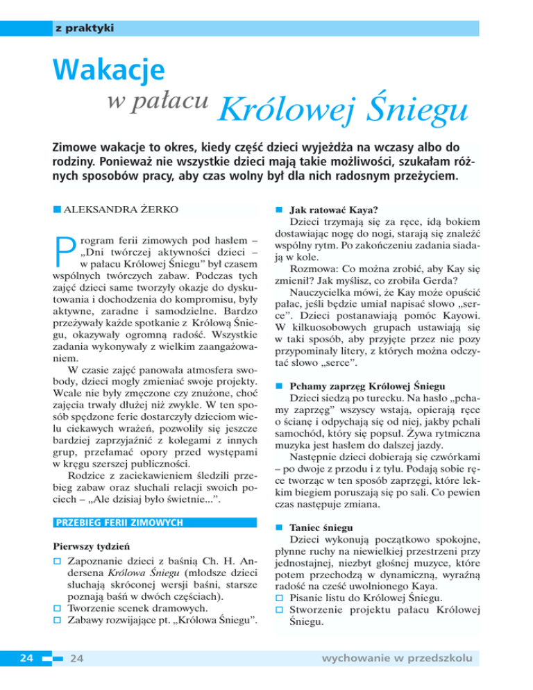 z praktyki Wakacje w pa∏acu Królowej Âniegu Zimowe wakacje to okres, kiedy cz´Êç dzieci wyje˝d˝a na wczasy albo do rodziny. Poniewa˝ nie wszystkie dzieci majà takie mo˝liwoÊci, szuka∏am ró˝nych sposobów pracy, aby czas wolny by∏ dla nich radosnym prze˝yciem. ALEKSANDRA ˚ERKO P rogram ferii zimowych pod has∏em – „Dni twórczej aktywnoÊci dzieci – w pa∏acu Królowej Âniegu” by∏ czasem wspólnych twórczych zabaw. Podczas tych zaj´ç dzieci same tworzy∏y okazje do dyskutowania i dochodzenia do kompromisu, by∏y aktywne, zaradne i samodzielne. Bardzo prze˝ywa∏y ka˝de spotkanie z Królowà Âniegu, okazywa∏y ogromnà radoÊç. Wszystkie zadania wykonywa∏y z wielkim zaanga˝owaniem. W czasie zaj´ç panowa∏a atmosfera swobody, dzieci mog∏y zmieniaç swoje projekty. Wcale nie by∏y zm´czone czy znu˝one, choç zaj´cia trwa∏y d∏u˝ej ni˝ zwykle. W ten sposób sp´dzone ferie dostarczy∏y dzieciom wielu ciekawych wra˝eƒ, pozwoli∏y si´ jeszcze bardziej zaprzyjaêniç z kolegami z innych grup, prze∏amaç opory przed wyst´pami w kr´gu szerszej publicznoÊci. Rodzice z zaciekawieniem Êledzili przebieg zabaw oraz s∏uchali relacji swoich pociech – „Ale dzisiaj by∏o Êwietnie...”. PRZEBIEG FERII ZIMOWYCH Pierwszy tydzieƒ Zapoznanie dzieci z baÊnià Ch. H. An- dersena Królowa Âniegu (m∏odsze dzieci s∏uchajà skróconej wersji baÊni, starsze poznajà baʃ w dwóch cz´Êciach). Tworzenie scenek dramowych. Zabawy rozwijajàce pt. „Królowa Âniegu”. 24 24 Jak ratowaç Kaya? Dzieci trzymajà si´ za r´ce, idà bokiem dostawiajàc nog´ do nogi, starajà si´ znaleêç wspólny rytm. Po zakoƒczeniu zadania siadajà w kole. Rozmowa: Co mo˝na zrobiç, aby Kay si´ zmieni∏? Jak myÊlisz, co zrobi∏a Gerda? Nauczycielka mówi, ˝e Kay mo˝e opuÊciç pa∏ac, jeÊli b´dzie umia∏ napisaç s∏owo „serce”. Dzieci postanawiajà pomóc Kayowi. W kilkuosobowych grupach ustawiajà si´ w taki sposób, aby przyj´te przez nie pozy przypomina∏y litery, z których mo˝na odczytaç s∏owo „serce”. Pchamy zaprz´g Królowej Âniegu Dzieci siedzà po turecku. Na has∏o „pchamy zaprz´g” wszyscy wstajà, opierajà r´ce o Êcian´ i odpychajà si´ od niej, jakby pchali samochód, który si´ popsu∏. ˚ywa rytmiczna muzyka jest has∏em do dalszej jazdy. Nast´pnie dzieci dobierajà si´ czwórkami – po dwoje z przodu i z ty∏u. Podajà sobie r´ce tworzàc w ten sposób zaprz´gi, które lekkim biegiem poruszajà si´ po sali. Co pewien czas nast´puje zmiana. Taniec Êniegu Dzieci wykonujà poczàtkowo spokojne, p∏ynne ruchy na niewielkiej przestrzeni przy jednostajnej, niezbyt g∏oÊnej muzyce, które potem przechodzà w dynamicznà, wyraênà radoÊç na czeÊç uwolnionego Kaya. Pisanie listu do Królowej Âniegu. Stworzenie projektu pa∏acu Królowej Âniegu. wychowanie w przedszkolu z praktyki Budowanie pa∏acu z kartonu. Projektowanie strojów z gazet. Drugi tydzieƒ – zabawy z Królowà Âniegu Pierwszy dzieƒ – podró˝ w Krain´ BaÊni Nauczycielka z dzieçmi wchodzi do sali z zimowymi dekoracjami, w której jest równie˝ pa∏ac Królowej Âniegu. Nauczycielka zaprasza dzieci do kr´gu i proponuje wspania∏à podró˝. „Kto chce ze mnà wyruszyç na spotkanie z Królowà Âniegu, niech poka˝e, w jaki sposób powita królowà?” Dzieci znajdujà du˝à paczk´-prezent od Królowej Âniegu. Jest w niej list: Drogie dzieci! Witam Was w moim królestwie. Przygotowa∏am dla Was na ca∏y tydzieƒ wiele wspania∏ych zabaw, abyÊcie mog∏y mi∏o sp´dziç u mnie czas. Dzisiaj zapraszam Was do mojego ogrodu zimowego na wspania∏y kulig i ognisko. Kulig w ogrodzie przedszkolnym i wokó∏ przedszkola, ognisko z kie∏baskami, wspólne zabawy na Êniegu. Wystawa Êniegowych ba∏wanków. Dzieci pod kierunkiem nauczyciela lepià ba∏wanki w 3-4-osobowych zespo∏ach i ustawiajà w wyznaczonych miejscach. Nast´pnie przystrajajà je ozdobami przyniesionymi z przedszkola. Starajà si´ udekorowaç jak naj∏adniej. Po zakoƒczeniu prac wszyscy oglàdajà wystaw´ ba∏wanków. Weso∏y bieg. Dzieci biegnà za nauczycielkà (jedno za drugim), podskakujà, maszerujà, zatrzymujà si´ i klaszczà na czeÊç najpi´kniejszego ba∏wanka, wznoszà okrzyk – hura! (trzykrotnie). Drugi dzieƒ – Zabawy z gazetami Królowa wita dzieci w swoim pa∏acu (przebrana nauczycielka). Królowa Âniegu przekonuje dzieci, ˝e nale˝y zbieraç gazety na makulatur´, która póêniej zostanie przetworzona na nowy papier. Zaprasza do zabaw z gazetami: nosimy kartki na wyciàgni´tych r´kach poruszajàc nimi; k∏adziemy kartki na g∏owach – sà to „kapelusze”; 1/2004 Zabawy z gazetami – pokaz mody kartki na plecach – dêwigamy ci´˝ki „wo- rek”; trzymamy kartki w d∏oniach, r´ce wycià- gni´te, poruszamy si´ w rytm melodii – jest to taniec „drzew zimowych”, najpierw taƒczymy pojedynczo, parami, potem w czwórkach i ósemkach (oÊmioro dzieci w kole); k∏adziemy gazety na pod∏odze i wykonujemy z nich „buty”, poruszamy si´ z szybkoÊcià umownie okreÊlonà istniejàcà temperaturà: dodatnia – do przodu, ujemna – do ty∏u, 0°C – zatrzymujemy si´; z resztek butów robimy pi∏ki, za pomocà taÊmy wzmacniamy je, bawimy si´ pi∏kami; rzuty pi∏kami-„kulami Ênie˝nymi” oburàcz, jednà r´kà, pod prawà nogà, pod lewà nogà, próby ˝onglowania; w parach rzucamy do siebie trzema pi∏kami (zmiana kierunku); celujemy pi∏kà w koleg´ – zabawa w Ênie˝ki; z kartki robimy pa∏eczki, zaklejamy taÊmà, dowolne zabawy pa∏eczkami; utrzymywanie pa∏eczki (sopel lodu) na prawej d∏oni, na lewej; rzuty pa∏eczkà (soplem lodu) do celu; z pa∏eczek robimy trójkàty przez sklejenie na koƒcach taÊmà, jedna osoba trzyma trójkàt, dwie rzucajà pi∏eczkami (kulami Ênie˝nymi) przez Êrodek trójkàta; pa∏eczki rozrywamy i rzucamy je na pod