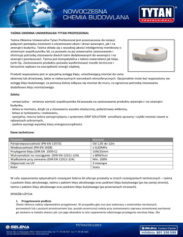 TAŚMA OKIENNA UNIWERSALNA TYTAN PROFESSIONAL Taśma Okienna Uniwersalna Tytan Professional jest przeznaczona do izolacji połączeń pomiędzy ościeżami a ościeżnicami okien i drzwi wewnątrz, jak i na zewnątrz budynku. Taśma składa się z wysokiej jakości inteligentnej membrany o zmiennym współczynniku Sd, co pozwala na jej uniwersalne zastosowanie i eliminuje potrzebę stosowania dwóch taśm dedykowanych do wewnątrz i na zewnątrz pomieszczeń. Taśma jest kompatybilna z takimi materiałami jak kleje, tynki itp. Zastosowanie produktu pozwala wyeliminować mostki termiczne i korzystnie wpływa na oszczędność energii cieplnej. Produkt wyposażony jest w specjalną wstęgę kleju, umożliwiającą montaż do ramy okiennej lub drzwiowej, także w niekorzystnych warunkach atmosferycznych. Opcjonalnie może być wyposażony we wstęgę kleju butylowego, za pomocą której odbywa się montaż do muru, co ogranicza potrzebę stosowania dodatkowo kleju montażowego. Zalety: - uniwersalna - zmienna wartość współczynnika Sd pozwala na zastosowanie produktu wewnątrz i na zewnątrz budynku, - łatwa w montażu, dzięki za y stosowaniu wysoko elastycznej, poliestrowej włókniny, - łatwa w tynkowaniu i malowaniu, - specjalna, mocna taśma samoprzylepna z systemem GRIP SOLUTION umożliwia sprawny i szybki montaż nawet w rękawicach ochronnych, - spełnia wymogi wysokiej klasy energooszczędności. Dane techniczne: Parametr Paroprzepuszczalność (PN-EN 12572) Wodoszczelność (PN-EN 1928) Przyleganie kleju (DIN EN 1939-C) Wytrzymałość na rozciąganie (DIN EN 12311-2/A) Wydłużenie przy zerwaniu (DIN EN 12311-2/A) Odporność na UV Kolor Wartość Od 1,05 do 12m ≥ 0,02MPa 15N/25mm ≥ 80N/5cm Min. 100% 3 miesiące Szary W celu zapewnienia optymalnych rozwiązań Selena SA oferuje produkty w trzech rozwiązaniach technicznych – taśma z paskiem kleju akrylowego, taśma z pakiem kleju akrylowego oraz paskiem kleju butylowego (po tej samej stronie), taśma z pakiem kleju akrylowego oraz paskiem kleju butylowego (po przeciwnych stronach). SPOSÓB UŻYCIA 1. Przygotowanie podłoża Otwór okienny należy odpowiednio przygotować. W przypadku gdy mur jest wykonany z materiałów nierównych, porowatych lub z pustymi przestrzeniami (np. pustak ceramiczny) należy przy zastosowaniu zaprawy cementowej wyrównać go zarówno w świetle otworu jak i po jego obwodzie w celu zapewnienia właściwego przylegania warstwy kleju. Dla TP/TOU/26112013 TP/TOU/26112013 TP/TOU/26112013 wzmocnienia podłoża wskazane jest zatopienie siatki. Wyrównane podłoże na którym będą stosowane taśmy zagruntować (np. Tytan Professional Grunt Uniwersalny). 2. Przygotowanie stolarki otworowej Przed przystąpieniem do wyklejania taśmami ramy okiennej należy ją odtłuścić za pomocą np. benzyny ekstrakcyjnej lub acetonu. Rama powinna być sucha, wolna od brudu, kurzu i innych zanieczyszczeń. Przymierzyć okno do otworu okiennego w celu zwrócenia uwagi na odległości pomiędzy narożnikami stolarki a narożnikami otworu okiennego oraz prawidłowego doboru taśm pod kątem ich szerokości i umiejscowienia pasków kleju. 3. Oklejanie stolarki otworowej Do wyklejania ram stolarki otworowej używane są dwa rodzaje taśm: - Tytan Professional Taśma Okienna Zewnętrzna – paroprzepuszczalna w kolorze białym - Tytan Professional Taśma Okienna Wewnętrzna – paroszczelna w kolorze niebieskim Możliwe jest zastąpienie w/w taśm , Tytan Professional Taśma Okienna Uniwersalna o zmiennym współczynniku Sd w kolorze szarym, stosowaną zarówno po stronie wewnętrznej jak i zewnętrznej okna. Wyklejanie rozpocząć od taśmy wewnętrznej - paroszczelnej w kolorze niebieskim. W celu aktywacji kleju należy zerwać taśmę zabezpieczającą. Montaż rozpocząć w połowie wysokości okna, kierując się ku dołowi. W narożnikach wykonać zakładki równe odległości pomiędzy narożnikiem ramy okiennej a otworu w celu zapewnienia właściwego połączenia taśmy z murem. Miejsca łączenia taśm podkleić klejem montażowym (np. Tytan Professional Klej Dekarski). Sposób i moment wyklejania taśm zewnętrznych – paroprzepuszczalnych w kolorze białym uzależniony jest od sposobu montażu stolarki otworowej oraz dostępu do okna po jego zamocowaniu mechanicznym. TP/TOU/26112013 TP/TOU/26112013 TP/TOU/26112013 a. Przy montażu poza licem muru, na konsolach montażowych - wskazane jest wyklejenia taśmy zewnętrznej przed umieszczeniem okna w miejscu montażu. W przypadku montażu stolarki równo z licem muru zalecane jest wyklejanie stykowe umożliwiające połączenie okna z murem. Montażu taśm dokonać w następującej kolejności: - strefa podokienna - piony (lewy i prawy) - strefa nadokienna W przypadku łatwego dostępu do okna wyklejania można dokonać po mechanicznym montażu stolarki. b. 4. Montaż stolarki otworowej Montaż stolarki wykonać zgodnie z instrukcją producenta, zwracając szczególną uwagę na prawidłowe usytuowanie kotew. Przed przystąpieniem do wypełnienia szczeliny pianą poliuretanową (np. Tytan Professional Low Expansion) wskazane jest połączenie okna z murem taśmą, za pomocą kleju butylowego, aplikując go poprzez zerwanie taśmy ochronnej. Wypełnić szczelinę pianą zgodnie z instrukcją producenta. Po całkowitym utwardzeniu piany poliuretanowej i ewentualnym odcięciu nadmiarów, zerwać taśmę ochronną z paska kleju butylowego i połączyć taśmę wewnętrzną z murem. UWAGA Przed upływem 3 miesięcy konieczne jest zabezpieczenie taśm przed degradującym ich parametry techniczne promieniowaniem UV. Dostępne produkty: Tytan Professional Taśma Okienna Uniwersalna, 70 mm Tytan Professional Taśma Okienna Uniwersalna, 100 mm Tytan Professional Taśma Okienna Uniwersalna, 150 mm Tytan Professional Taśma Okienna Uniwersalna z Butylem, jednostronna, 70 mm Tytan Professional Taśma Okienna Uniwersalna z Butylem, jednostronna, 100 mm Tytan Professional 