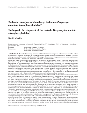 Wiadomoœci Parazytologiczne 2007, 53(2), 153–155 Copyright© 2007 Polskie Towarzystwo Parazytologiczne Badania rozwoju embrionalnego tasiemca Mosgovoyia ctenoides (Anoplocephalidae)* Embryonic development of the cestode Mosgovoyia ctenoides (Anoplocephalidae) Daniel Młocicki Praca doktorska wykonana w Instytucie Parazytologii im. W. Stefańskiego PAN w Warszawie i obroniona 24 października 2006 r. Promotor: Prof. dr hab. Zdzisław Świderski Recenzenci: Prof. dr hab. Barbara Grytner−Zięcina Prof. dr hab. Teresa Pojmańska ABSTRACT. In this study the cleavage divisions and the ultrastructural analysis of early embryos as well as cellular organisation of infective oncosphere of the anoplocephalid cestode Mosgovoyia ctenoides are described. The early cleavage is unequal and results in the formation of three types of blastomeres: 2 large macromeres containing large electron dense granules, 3 medium−size mesomeres and several small micromeres. In the early stage of oncospheral morphogenesis, formation of three following primary embryonic envelopes takes place: (1) the capsule replaced by thick, rigid outer coat originated form the uterine material secretion, (2) the outer envelope and (3) the inner envelope. The capsule is formed from the vitellocyte material. Two macromeres contribute to the formation of the outer envelope and three mesomeres take part in the formation of the inner envelope. The inner envelope undergoes differentiation into three sublayers: (1) a thick extraembryophoral cytoplasmic layer, (2) an electron−dense embryophore, as a stiff pyriform apparatus, and (3) a thin intraembryophoral cytoplasmic layer containing mesomere nuclei. The oncosphere is located in the extended cupule−like part of the pyriform apparatus. Four egg envelopes surround the mature infective oncosphere of M. ctenoides: (1) a thick outer coat, (2) the outer envelope, (3) the inner envelope with a characteristic pyriform apparatus and (4) the oncospheral membrane. Hook morphogenesis takes place inside six symmetrically arranged oncoblasts, each of which shows a characteristic large nucleus of semi−lunar shape. At the beginning the „hook−forming center” appears in the cytoplasmic part of each oncoblast. It consists of numerous free ribosomes, polyribosomes, mitochondria and Golgi complexes. The hook−forming center is involved in synthesis of a hook primordium, which undergoes differentiation and elongation into the fully developed hook. Mature hook consists of three parts: (1) blade, (2) shank, (3) base, and at the site of its protrusion from the oncosphere, is surrounded by a circular septate junction. Wide bands of hook muscles are attached to the basal and collar parts of the hook. The hook blades project outside the oncospheral body into a large cavity that is delimited by the hook region membrane. In the fully developed oncosphere of M. ctenoides three pairs of oncospheral hooks together with specialized hook muscles form a complex of „hook muscle system”, responsible for coordinated hook action. The surface of the infective oncosphere is covered by a thin cytoplasmic layer of oncospheral tegument connected with the so−called "binucleate subtegumental cell", situated deeper in the oncospheral body. Below the cytoplasmic layer are situated wide bands of the somatic musculature responsible for oncospheral body movements. Five major types of oncospheral cells have been distinguished in the infective oncosphere: (1) a binucleate subtegumental cell, (2) a binucleate penetration gland, (3) two nerve cells, (4) numerous somatic cells, and (5) six germinative cells. During development of the oncosphere, changes in the concentration of glycogen and number of lipid droplets were observed. In the early embryos glycogen particles were most abundant in the macromere cytoplasm, whereas in micromeres concentration of glycogen was observed to be lower. In the course of the differentiation of the oncospheral envelopes glycogen was progressively distributed to other parts of the developing embryo. Simultaneously, a great *Praca zrealizowana w ramach projektu badawczego nr 2PO4C 12129 154 D. M³ocicki increase in the number of lipid droplets was detected. However, during the preoncospheral phase of development a progressive reduction of lipid droplets was observed. This may indicate that lipids play a role of the energy source for developing oncosphere. Key words: Anoplocephalidae, Cestoda, Mosgovoyia ctenoides, oncosphere, ultrastructure. Streszczenie Celem pracy było dokładne opisanie rozwoju embrionalnego tasiemca Mosgovoyia ctenoides (Railliet, 1890) Beveridge, 1978, począwszy od bruzdkowania, poprzez różnicowanie oraz ultrastrukturę otoczek onkosferalnych i rozwijającego się zarodka, aż do organizacji komórkowej w dojrzałej onkosferze. Dodatkowym zadaniem było poznanie znaczenia glikogenu i lipidów oraz ich przemian zachodzących podczas embriogenezy, jak również potwierdzenie apoptozy części blastomerów, odbywającej się prawdopodobnie w trakcie różnicowania i rozwoju onkosfery. Uzyskane wyniki mogą przyczynić się do lepszego poznania rozwoju embrionalnego Anoplocephalidae, budowy i organizacji komórkowej onkosfer oraz funkcji otaczających je struktur onkosferalnych i macicznych, jak również dostarczyć użytecznych kryteriów do anliz pokrewieństwa i filogenezy w obrębie płazińców. Mosgovoyia ctenoides jest tasiemcem pasożytującym w jelicie cienkim królików oraz zajęcy. Żywicielem pośrednim są mechowce, w których rozwija się z onkosfery cysticerkoid. Zarażenie pasożytami z rodzaju Mosgovoyia jest szczególnie niebezpieczne dla zwierząt młodych i osłabionych oraz tzw. „miniaturek". Obecność tego pasożyta w hodowlach królików może powodować znaczne straty ekonomiczne, związane ze zwiększoną śmiertelnością, zmniejszonymi przyrostami masy ciała, obniżeniem jakości futra oraz zmniejszeniem przychowu. Przez wiele lat i mimo 