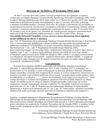 Decyzja nr 3a/2016 z 29 kwietnia 2016 roku W dniu 7 stycznia 2016 roku zostało wszczęte postępowanie dyscyplinarne w sprawie zachowania zawodnika Śląskiego Związku Brydża Sportowego Edwarda Ciesielskiego (PID 13791) w trakcie Mityngu Barbórkowego 2015, który odbył się w Chorzowie 6 grudnia 2015 roku. Sprawę omawiano na posiedzeniu Komisji Dyscyplinarnej w dniu 13 stycznia 2016 roku, a decyzję o ukaraniu zawodnika podjęto 1 kwietnia 2016 roku. W związku z odwołaniem się zawodnika jw. od przedmiotowej decyzji, umożliwiono zawodnikowi Edwardowi Ciesielskiemu złożenie ustnych wyjaśnień i wniesienie pisemnego uzupełnienia/wyjaśnienia do sprawy w dniu 27 kwietnia 2016 r. W związku z tym, że do sprawy ww. zawodnik nie wniósł nowych, istotnych i potwierdzonych faktów Komisja Dyscyplinarna podjęła powtórnie w dniu 29 kwietnia 2016 r. decyzję. Zawodnik Edward Ciesielski zostaje ukarany karą okresowej, bezwzględnej dyskwalifikacji na okres 3 miesięcy (par. 4 lit. "d" Regulaminu Dyscyplinarnego Śląskiego Związku Brydża Sportowego w Katowicach) wraz z orzeczeniem kary dodatkowej w postaci podania tego orzeczenia dyscyplinarnego do publicznej wiadomości w komunikacie na stronie internetowej Śląskiego Związku Brydża Sportowego (par. 7 ust. 1 pkt "l" Regulaminu Dyscyplinarnego Śląskiego ZBS). Kara rozpoczyna biegnie od 6 kwietnia 2016 r. (zakończenie okresu kary to dzień 5 lipca 2016 r.). Zgodnie z par. 5, ust. 2 w okresie dyskwalifikacji ukarany zawodnik nie może brać udziału w turniejach organizowanch przez PZBS lub okręgowe ZBS, a także w zawodach mistrzowskich, czy oficjalnych zawodach towarzyskich - organizowanych przez członków ŚlZBS - z wyjątkiem wewnętrznych zajęć treningowych. W okresie trwania kary nie może też pełnić żadnych funkcji związanych z działalnością ŚlZBS. Uzasadnienie: Komisja Dyscyplinarna ŚlZBS rozpatrywała czyn zawodnika Edwarda Ciesielskiego dokonany w trakcie Mityngu Barbórkowego 2015, w dniu 6 grudnia 2015 r., polegający na przebywaniu na ww. turnieju w stanie wskazującym na spożycie alkoholu i słownym obrażeniu innego zawodnika z użyciem słów wulgarnych, co uznano za wysoce niesportowe zachowanie się (ukarany zawodnik wypowiedział publicznie słowa (cytat): " na poprzednim stoliku grałem z taką brzydką panią, co za głupia p _ _ _ _ [słowo niecenzuralne], ja już nigdy jej nie popuszczę! ". Kara zostaje określona w wymiarze bezwzględnym, ponieważ Edward Ciesielski dopuścił się obrazy innego zawodnika już po raz drugi (w jednym i drugim przypadku zachowując się wysoce niesportowo mówiąc wulagarnymi słowami o kobiecie !!!). Zawodnik wykroczył tym samym przeciwko par. 22, ust. 1, pkt "k" Regulaminu Dyscyplinarnego Śląskiego Związku Brydża Sportowego w Katowicach (brzmienie pkt "k", ust. 1 par. 22: "znieważenie, obrażenie zawodnika, działacza lub osoby postronnej słowami potocznie uważanymi za obraźliwe lub wulgarne"). Pouczenie: Zgodnie z zasadami opisanymi w Regulaminie Dyscyplinarnym Polskiego Związku Brydża Sportowego od decyzji podjętej wspólnie przez Komisję Dyscyplinarną i Zarząd Śląskiego ZBS (decyzji powtórnej wskutek odwołania się od pierwotnej decyzji nr 3/2016) ukaranemu przysługuje prawo odwołania się na piśmie do Wydziału Dyscypliny lub do Zarządu PZBS, w terminie 14 dni licząc od dnia następnego po dniu powzięcia informacji o przedmiotowym orzeczeniu przez ukaranego. Za Komisję Dyscyplinarną Śląskiego Związku Brydża Sportowego Przewodniczący Janusz Jabłoński, Członek Kom. Dysc. Krzysztof Śliwoń Za Zarząd Ślskiego Związku Brydża Sportowego w Katowicach Prezes Ryszard Łazikiewicz