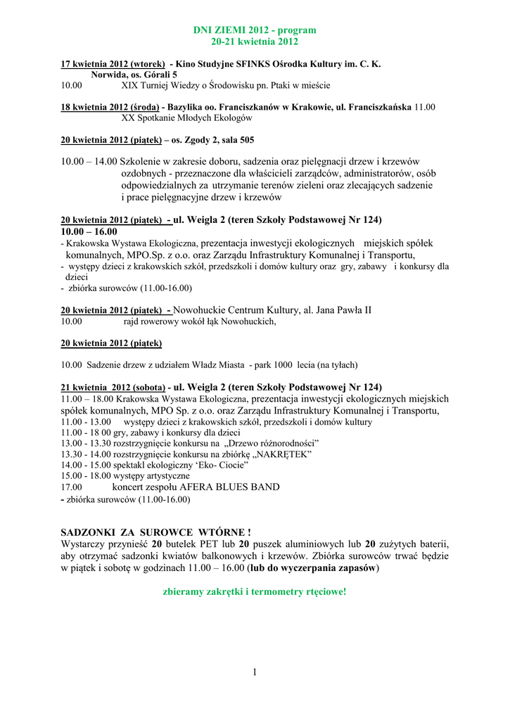 1 DNI ZIEMI 2012 - program 20-21 kwietnia 2012