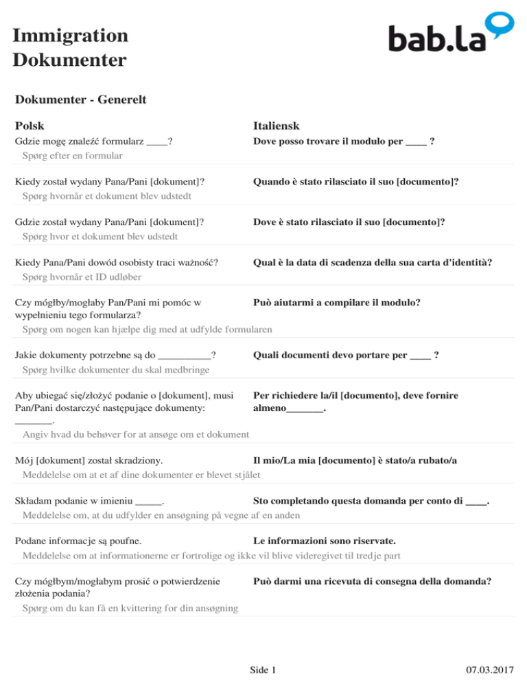 Immigration Dokumenter Dokumenter - Generelt Polsk Italiensk Gdzie mogę znaleźć formularz ____? Spørg efter en formular Dove posso trovare il modulo per ____ ? Kiedy został wydany Pana/Pani [dokument]? Spørg hvornår et dokument blev udstedt Quando è stato rilasciato il suo [documento]? Gdzie został wydany Pana/Pani [dokument]? Spørg hvor et dokument blev udstedt Dove è stato rilasciato il suo [documento]? Kiedy Pana/Pani dowód osobisty traci ważność? Spørg hvornår et ID udløber Qual è la data di scadenza della sua carta d'identità? Czy mógłby/mogłaby Pan/Pani mi pomóc w Può aiutarmi a compilare il modulo? wypełnieniu tego formularza? Spørg om nogen kan hjælpe dig med at udfylde formularen Jakie dokumenty potrzebne są do __________? Spørg hvilke dokumenter du skal medbringe Quali documenti devo portare per ____ ? Aby ubiegać się/złożyć podanie o [dokument], musi Per richiedere la/il [documento], deve fornire Pan/Pani dostarczyć następujące dokumenty: almeno_______. _______. Angiv hvad du behøver for at ansøge om et dokument Mój [dokument] został skradziony. Il mio/La mia [documento] è stato/a rubato/a Meddelelse om at et af dine dokumenter er blevet stjålet Składam podanie w imieniu _____. Sto completando questa domanda per conto di ____. Meddelelse om, at du udfylder en ansøgning på vegne af en anden Podane informacje są poufne. Le informazioni sono riservate. Meddelelse om at informationerne er fortrolige og ikke vil blive videregivet til tredje part Czy mógłbym/mogłabym prosić o potwierdzenie złożenia podania? Spørg om du kan få en kvittering for din ansøgning Può darmi una ricevuta di consegna della domanda? Side 1 07.03.2017 Immigration Dokumenter Dokumenter - Personlige informationer Polsk Italiensk Jak się Pan/Pani nazywa? Spørg efter en persons navn Come si chiama? Czy mógłby/mogłaby Pan/Pani podać swoją datę i miejsce urodzenia? Spørg efter fødselssted og fødselsdato Può dirmi il suo luogo e la sua data di nascita? Gdzie Pan/Pani mieszka? Spørg hvor en person bor Dove risiede? Jaki jest Pana/Pani adres? Spørg efter en persons adresse Qual è il suo indirizzo? Jakie posiada Pana/Pani obywatelstwo? Spørg efter en persons statsborgerskab Qual è la sua cittadinanza? Kiedy przyjechał/a Pan/Pani do [nazwa kraju]? Spørg hvornår en person er ankommet til landet Quando è arrivato/a in [stato]? Czy mógłbym/mogłabym zobaczyć Pana/Pani dowód osobisty? Spørg efter en persons ID Può mostrarmi la sua carta di identità? Dokumenter - Civilstatus Polsk Italiensk Mój stan cywilny: _____. Angiv hvad din civilstatus er Il mio stato civile è __________. kawaler/panna Civilstatus celibe (m) / nubile (f) żonaty/zamężna Civilstatus coniugato/a Side 2 07.03.2017 Immigration Dokumenter w separacji Civilstatus separato/a rozwodnik/rozwódka Civilstatus divorziato/a w konkubinacie Civilstatus convivente w rejestrowanym związku partnerskim Civilstatus in un'unione civile w związku partnerskim Civilstatus in una coppia non sposata w związku partnerskim (ze wspólnym gospodarstwem domowym) Civilstatus in un'unione di fatto wdowiec/wdowa Civilstatus vedovo/a Czy ma Pan/Pani dzieci? Spørg om en person har børn Ha figli? Czy mieszka Pan/Pani z osobami na Pana/Pani Ha familiari a carico? utrzymaniu? Spørg om en person yder finansiel støtte til personer, der bor hos ham/hende Chciałbym/Chciałabym skorzystać z prawa do Vorrei ricongiungermi alla mia famiglia. łączenia rodzin. Angiv din intention om at blive genforenet med din familie Dokumenter - Registrering i byen Polsk Italiensk Chciałbym/Chciałabym się zameldować (w nowym miejscu zamieszkania). Angiv at du gerne vil registreres i byen Vorrei iscrivermi all'anagrafe Side 3 07.03.2017 Immigration Dokumenter Jakie dokumenty wymagane są do meldunku? Spørg hvilke dokumenter du bør medbringe Quali documenti devo portare? Czy za meldunek pobierana jest opłata? Ci sono delle spese per iscriversi all'anagrafe? Spørg om der er nogen omkostninger forbundet med registrering Chciałbym/Chciałabym zameldować się na pobyt stały. Angiv at du er her for at registrere din bopæl Sono qui per effettuare il cambio di domicilio. Chciałbym/Chciałabym prosić o wydanie zaświadczenia o niekaralności. Angiv at du gerne vil ansøge om en straffeattest Vorrei ottenere un certificato di buona condotta. Chciałbym/Chciałabym złożyć podanie o Vorrei fare domanda per il permesso di soggiorno. zezwolenie na pobyt stały. Angiv at du gerne vil ansøge om opholdelsestilladelse Dokumenter - Sygeforsikring Polsk Italiensk Mam kilka pytań dotyczących ubezpieczenia zdrowotnego. Angiv at du har nogle spørgsmål om sygeforsikring Vorrei farle delle domande sull'assicurazione sanitaria. Czy muszę wykupić prywatne ubezpieczenie zdrowotne? Spørg om du behøver en privat sygeforsikring Ho bisogno di un'assicurazione sanitaria privata? Co obejmuje to ubezpieczenie zdrowotne? Spørg til forsikringens dækning Cosa è coperto dall'assicurazione sanitaria? Opłaty za pobyt w szpitalu Eksempel på sygeforsikringens dækning Spese ospedaliere Opłaty za konsultacje u specjalistów Eksempel på sygeforsikringens dækning Spese per la consultazione di uno specialista Side 4 07.03.2017 Immigration Dokumenter Badania diagnostyczne Eksempel på sygeforsikringens dækning Test diagnostici Zabiegi chirurgiczne Eksempel på sygeforsikringens dækning Operazioni chirurgiche Leczenie psychiatryczne Eksempel på sygeforsikringens dækning Trattamento psichiatrico Leczenie stomatologiczne Eksempel på sygeforsikringens dækning Cure dentali Leczenie okulistyczne Eksempel på sygeforsikringens dækning Cure oculistiche Dokumenter - Visum Polsk Italiensk W jakim celu ubiega się Pan/Pani o wizę? Per quali motivi richiede il visto d’ingresso? Spørg hvorfor en person beder efter et indrejsevisum Czy muszę posiadać wizę, aby wjechać do [nazwa Ho bisogno di un visto per entrare in [paese]? kraj