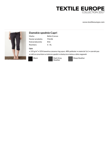 Damskie spodnie Capri Marka Bella+Canvas Numer produktu 916.06 Kod producenta 816 Rozmiary S - XL Opis • 155 g/m² • 52% bawełna czesana ring-spun, 48% poliester • materiał 1x1 • szeroki pas w talii ze sznurkiem w kolorze spodni • elastyczna taśma u dołu nogawek Black Dark Grey Heather Deep Heather