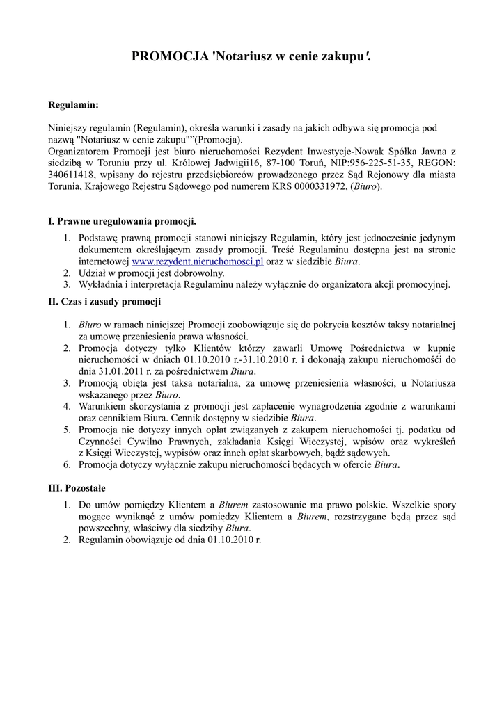 PROMOCJA 'Notariusz w cenie zakupu'. Regulamin: Niniejszy regulamin (Regulamin), określa warunki i zasady na jakich odbywa się promocja pod nazwą "Notariusz w cenie zakupu"”(Promocja). Organizatorem Promocji jest biuro nieruchomości Rezydent Inwestycje-Nowak Spółka Jawna z siedzibą w Toruniu przy ul. Królowej Jadwigii16, 87-100 Toruń, NIP:956-225-51-35, REGON: 340611418, wpisany do rejestru przedsiębiorców prowadzonego przez Sąd Rejonowy dla miasta Torunia, Krajowego Rejestru Sądowego pod numerem KRS 0000331972, (Biuro). I. Prawne uregulowania promocji. 1. Podstawę prawną promocji stanowi niniejszy Regulamin, który jest jednocześnie jedynym dokumentem określającym zasady promocji. Treść Regulaminu dostępna jest na stronie internetowej www.rezydent.nieruchomosci.pl oraz w siedzibie Biura. 2. Udział w promocji jest dobrowolny. 3. Wykładnia i interpretacja Regulaminu należy wyłącznie do organizatora akcji promocyjnej. II. Czas i zasady promocji 1. Biuro w ramach niniejszej Promocji zoobowiązuje się do pokrycia kosztów taksy notarialnej za umowę przeniesienia prawa własności. 2. Promocja dotyczy tylko Klientów którzy zawarli Umowę Pośrednictwa w kupnie nieruchomości w dniach 01.10.2010 r.-31.10.2010 r. i dokonają zakupu nieruchomośći do dnia 31.01.2011 r. za pośrednictwem Biura. 3. Promocją obięta jest taksa notarialna, za umowę przeniesienia własności, u Notariusza wskazanego przez Biuro. 4. Warunkiem skorzystania z promocji jest zapłacenie wynagrodzenia zgodnie z warunkami oraz cennikiem Biura. Cennik dostępny w siedzibie Biura. 5. Promocja nie dotyczy innych opłat związanych z zakupem nieruchomości tj. podatku od Czynności Cywilno Prawnych, zakładania Księgi Wieczystej, wpisów oraz wykreśleń z Księgi Wieczystej, wypisów oraz innch opłat skarbowych, bądź sądowych. 6. Promocja dotyczy wyłącznie zakupu nieruchomości będacych w ofercie Biura. III. Pozostałe 1. Do umów pomiędzy Klientem a Biurem zastosowanie ma prawo polskie. Wszelkie spory mogące wyniknąć z umów pomiędzy Klientem a Biurem, rozstrzygane będą przez sąd powszechny, właściwy dla siedziby Biura. 2. Regulamin obowiązuje od dnia 01.10.2010 r.