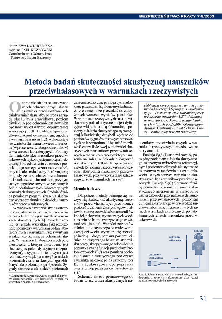 BEZPIECZEÑSTWO PRACY 7-8/2003 dr in¿. EWA KOTARBIÑSKA mgr in¿. EMIL KOZ£OWSKI Centralny Instytut Ochrony Pracy Pañstwowy Instytut Badawczy Metoda badañ skutecznoci akustycznej nauszników przeciwha³asowych w warunkach rzeczywistych chronniki s³uchu s¹ stosowane w celu ochrony narz¹du s³uchu cz³owieka przed skutkami oddzia³ywania ha³asu. Aby ochrona narz¹du s³uchu by³a prawid³owa, poziom dwiêku A pod ochronnikiem powinien byæ mniejszy od wartoci dopuszczalnej wynosz¹cej 85 dB. Do obliczeñ poziomu dwiêku A pod ochronnikiem, zgodnie z wymaganiami norm [1, 2] wykorzystuje siê wartoci t³umienia dwiêku zmierzone (w procesie certyfikacji ochronników) w warunkach laboratoryjnych. Pomiary t³umienia dwiêku nauszników przeciwha³asowych wykonuje siê metod¹ subiektywn¹ [3] w odniesieniu do czterech próbek (tego samego wzoru nauszników), przy udziale 16 s³uchaczy. Porównuje siê progi s³yszenia s³uchacza bez ochronnika i s³uchacza z ochronnikiem, przy tym samym sygnale testowym, w tych samych cile zdefiniowanych laboratoryjnych warunkach akustycznych. rednia ró¿nica pomiêdzy progami s³yszenia s³uchaczy wyznacza t³umienie dwiêku nauszników przeciwha³asowych. W warunkach rzeczywistych skutecznoæ akustyczna nauszników przeciwha³asowych jest mniejsza ani¿eli w warunkach laboratoryjnych [4]. Powodem ró¿nic jest przede wszystkim fakt rozbie¿noci pomiêdzy warunkami badañ laboratoryjnych i warunkami rzeczywistymi w jakich u¿ytkowane s¹ ochronniki s³uchu. W warunkach laboratoryjnych pole akustyczne, w którym usytuowany jest s³uchacz, jest polem dyfuzyjnym (rozproszonym), a sygna³ami testowymi jest szum ró¿owy w¹skopasmowy* , o niskich poziomach cinienia akustycznego, zbli¿onych do poziomu progu s³yszenia. Sygna³y testowe o tak niskich poziomach * Szumem ró¿owym nazywamy sygna³ akustyczny charakteryzuj¹cy siê jednakow¹ energi¹ we wszystkich pasmach oktawowych. cinienia akustycznego mog¹ byæ maskowane przez szum fizjologiczny s³uchacza, co w efekcie mo¿e prowadziæ do zawy¿onych wartoci wyników pomiarów. W warunkach rzeczywistych na stanowisku pracy pole akustyczne nie jest dyfuzyjne, widma ha³asu s¹ ró¿norodne, a poziomy cinienia akustycznego s¹ zazwyczaj kilkadziesi¹t decybeli wy¿sze od poziomów sygna³ów testowych stosowanych w laboratorium. Aby mieæ mo¿liwoæ oceny ilociowej w³aciwoci akustycznych nauszników przeciwha³asowych w warunkach rzeczywistego nara¿enia na ha³as, w Zak³adzie Zagro¿eñ Akustycznych CIO-PIB opracowano metodê [5] pomiaru rzeczywistej skutecznoci akustycznej nauszników przeciwha³asowych, przy wykorzystaniu sztucznego torsu w warunkach in situ. Metoda badawcza Dla potrzeb metody definiuje siê rzeczywist¹ skutecznoæ akustyczn¹ nauszników przeciwha³asowych jako ró¿nicê poziomów cinienia akustycznego w ma³¿owinie usznej cz³owieka bez nauszników i po ich na³o¿eniu, wyznaczanych w odniesieniu do ha³asu rzeczywistego w warunkach in situ. Wartoci poziomów cinienia akustycznego w ma³¿owinie usznej cz³owieka wyznacza siê metod¹ poredni¹ drog¹ pomiaru poziomu cinienia akustycznego ha³asu na stanowisku pracy, skorygowanego odpowiedni¹ poprawk¹ zwan¹ funkcj¹ przejcia mikrofoncz³owiek F1(f) oraz pomiaru poziomu cinienia akustycznego pod czasz¹ nausznika na³o¿onego na sztuczny tors Kemara, skorygowanego poprawk¹ zwan¹ funkcj¹ przejcia Kemarcz³owiek F2(f). Schemat uk³adu pomiarowego do badañ w³aciwoci akustycznych na- Publikacja opracowana w ramach zadania badawczego 3.6 programu wieloletniego pt. Dostosowywanie warunków pracy w Polsce do standardów UE, dofinansowywanego przez Komitet Badañ Naukowych w latach 2002-2004. G³ówny koordynator: Centralny Instytut Ochrony Pracy Pañstwowy Instytut Badawczy uszników przeciwha³asowych w warunkach rzeczywistych przedstawiono na rysunku 1. Funkcja F1(f) (1) stanowi ró¿nicê pomiêdzy poziomem cinienia akustycznego mierzonym mikrofonem referencyjnym i poziomem cinienia akustycznego mierzonym w ma³¿owinie usznej cz³owieka, w tych samych warunkach akustycznych, bez nauszników przeciwha³asowych. Funkcja F2(f) (2) stanowi ró¿nicê pomiêdzy poziomem cinienia akustycznego mierzonym w ma³¿owinie usznej cz³owieka przy na³o¿onych nausznikach przeciwha³asowych i poziomem cinienia akustycznego w przewodzie s³uchowym Kemara, mierzonym w tych samych warunkach akustycznych po na³o¿eniu tych samych nauszników przeciwha³asowych. Rys. 1. Schemat stanowiska w warunkach in situ do pomiaru rzeczywistej skutecznoci akustycznej nauszników przeciwha³asowych 31 BEZPIECZEÑSTWO PRACY 7-8/2003 Funkcje przejcia F1 i F2 okrelane s¹ nastêpuj¹cymi wzorami. Funkcje przejœcia, dB 2,5 2,0 1,5 1,0 0,5 8000 6300 5000 4000 3150 2500 2000 1600 800 1250 630 1000 500 400 315 250 200 160 125 100 0,0 Rys. 2. Czas pog³osu zaadaptowanej do badañ ochronników s³uchu komory pog³osowej CIOPPIB (2) Pomiary funkcji przejcia i weryfikuj¹ce metodê badañ Pomiary funkcji przejcia dla potrzeb metody prowadzono w komorze pog³osowej CIOP-PIP, w której wprowadzono odpowiedni¹ adaptacjê akustyczn¹. Charakterystykê czêstotliwociow¹ czasu pog³osu zaadaptowanej komory, zbli¿on¹ do charakterystyk czasu pog³osu typowych wnêtrz przemys³owych, przedstawiono na rysunku 2. Schemat uk³adu pomiarowego przedstawiono na rysunku 3. Pomiary poziomu cinienia akustycznego w przewodzie s³uchowym cz³owieka, w dwóch wariantach bez ochronnika s³uchu i pod czaszami t³umi¹cymi nauszników przeciwha³asowych, przeprowadzono u omiu s³uchaczy. Pomiary wykonano kolejno w odniesieniu do 34 32 S2 S1 Mikrofon referencyjny KEMAR, CZ£OWIEK S3 S4 B&K 2144 analizator dŸwiêku B&K 1049 generator szumu YAMAHA YDG 2030 korektor graficzny b) a) -2 -4 -6 -8 -10 Czêstotliwoœæ, Hz Czêstotliwoœæ, Hz gdzie: Lsi (f) poziom cinienia akustycznego w przewodzie s³uchowym s³uchacza bez nausznika Lm (f) poziom cinienia akustycznego zmierzony mikrofonem