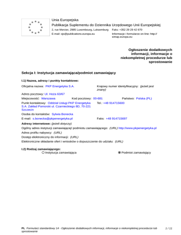 Unia Europejska Publikacja Suplementu do Dziennika Urzędowego Unii Europejskiej 2, rue Mercier, 2985 Luxembourg, Luksemburg Faks: +352 29 29 42 670 E-mail: [email protected] Informacje i formularze on-line: http:// simap.europa.eu Ogłoszenie dodatkowych informacji, informacje o niekompletnej procedurze lub sprostowanie Sekcja I: Instytucja zamawiająca/podmiot zamawiający I.1) Nazwa, adresy i punkty kontaktowe: Oficjalna nazwa: PKP Energetyka S.A. Krajowy numer identyfikacyjny: (jeżeli jest znany) _____ Adres pocztowy: Ul. Hoża 63/67 Miejscowość: Warszawa Kod pocztowy: 00-681 Punkt kontaktowy: Oddział Usługi PKP Energetyka S.A. Zakład Pomorski ul. Czarnieckiego 8D, 70-221 Szczecin Państwo: Polska (PL) Tel.: +48 914715600 Osoba do kontaktów: Sylwia Bonecka E-mail: [email protected] Faks: +48 914715697 Adresy internetowe: (jeżeli dotyczy) Ogólny adres instytucji zamawiającej/ podmiotu zamawiającego: (URL) http://www.pkpenergetyka.pl Adres profilu nabywcy: (URL) _____ Dostęp elektroniczny do informacji: (URL) _____ Elektroniczne składanie ofert i wniosków o dopuszczenie do udziału: (URL) _____ I.2) Rodzaj zamawiającego: Instytucja zamawiająca Podmiot zamawiający PL Formularz standardowy 14 - Ogłoszenie dodatkowych informacji, informacje o niekompletnej procedurze lub sprostowanie 1 / 11 Sekcja II: Przedmiot zamówienia II.1.1) Nazwa nadana zamówieniu: DOSTAWA PIĘCIU KPL. STACJI TRANSFORMATOROWYCH 15/0,4kV Z TRANSFORMATORAMI OLEJOWYMI II.1.2) Krótki opis zamówienia lub zakupu: (podano w pierwotnym ogłoszeniu) ZADANIE 1 Stacja transformatorowa 15/0,4 kV małogabarytowa typu KS 19-28z w obudowie betonowej, obsługa zewnętrzna. Obudowa stacji składa się z jednolitego fundamentu i części nadziemnej ( korpus ścian i zdejmowany dach) - ilość 3 kpl. Wymiary zewnętrzne stacji - szerokość - 1920 - długość - 2820 Wyposażenie stacji; -Rozdzielnica 15 kV w osłonie SF6, trzypolowa RRT, typu 8DJH 1. Dane podstawowe: moc znamionowa stacji : 630kVA częstotliwość znamionowa: 50Hz liczba faz: 3 2.Parametry techniczne rozdzielnicy SN napięcie znamionowe 24kV poziom znamionowy izolacji 125kV/50kV prąd znamionowy ciągły: szyn zbiorczych 630A pola liniowego 630A pola transformatora 200A prąd znamionowy szczytowy wytrzymywany: szyn zbiorczych 31,5kA pola liniowego i uziemnika 31,5kA prąd znamionowy krótkotrwały wytrzymywany: szyn zbiorczych 12,5kA pola liniowego i uziemnika 12,5kA czas znamionowy trwania zwarcia 1 sek Zestawienie pól rozdzielnicy SN. pola 2, 3 - pola liniowe wyposażone w rozłączniki 630 A, pole 1- pole transformatorowe z transformatorem 63 kVA( z możliwością zabudowy transformatora 630 kVA), 3.Parametry techniczne rozdzielnicy nn 230/400V: napięcie znamionowe 400V poziom znamionowy izolacji 660V prąd znamionowy ciągły: szyn zbiorczych 990A rozłącznik (wyłącznik) główny 1250A pola odpływowego 400A prąd znamionowy szczytowy wytrzymywany szyn zbiorczych 40kA PL Formularz standardowy 14 - Ogłoszenie dodatkowych informacji, informacje o niekompletnej procedurze lub sprostowanie 2 / 11 prąd znamionowy krótkotrwały wytrzymywany szyn zbiorczych 16kA czas znamionowy trwania zwarcia 0,5sek Zestawienie pól rozdzielnicy nn 230/400 V Rozdzielnica 10 polowa. Rozdzielnicę wyposażyć w rozłącznik główny 1250A – SIRCO SOCOMEC, kontrolny układ półpośredni pomiaru energii elektrycznej z listwą pomiarową WAGO LPW 847-356/230-000 oraz z przekładnikami 1000/5; kl.0,5; 15VA (do przekładników wymagane są świadectwa wzorcowania). 1.Kolorystyka obudowy stacji transformatorowej. - dach – kolor łamana czerwień RAL 3011 - ściany – kolor piaskowy RAL 1015, - drzwi – kolor biały RAL 9003, Drzwi zewnętrzne powinny być wyposażone w: - ryglowanie min. 2–punktowe - zamknięcie RS 130 ZNAL lub stal nierdzewna plus wkładka patentowa - uchwyt z blachy na zamknięcie na kłódkę UWAGI: Podejścia kabli SN wykonać w przepustach szczelnych typu HSI 150K z pokrywą HSI 150-D3/58 lub równoważne (podejścia wyposażyć w komplet pojedynczych rur termokurczliwych) Uziemienie ochronne i robocze rozdzielić i wyprowadzić do dwóch oddzielnych zacisków probierczych. transformator olejowy niskostratny o mocy 63 kVA na napięcie 15,750/0,4/0,231kV. Grupa połączeń transformatora – Yzn5, zakres regulacji ± 3 x 2,5 % - ilość 3 szt. ZADANIE 2 Stacja transformatorowa 15/0,4 kV małogabarytowa w obudowie betonowej, obsługa zewnętrzna. Obudowa stacji składa się z jednolitego fundamentu i części nadziemnej (korpus ścian i zdejmowany dach) - ilość 1 kpl. Wymiary zewnętrzne stacji – maksymalne - szerokość - 1920 - długość - 2820 Wyposażenie stacji; - Rozdzielnica 15 kV w osłonie SF6, trójpolowa RRT, typu 8DJH 1. Parametry techniczne rozdzielnicy SN napięcie znamionowe - 24 kV, prąd znamionowy ciągły - 630 A, prąd znamionowy 1 sek. szyn zbiorczych i pól liniowych - 16 kA, prąd znamionowy szczytowy szyn zbiorczych i pól liniowych - 31,5 kA, 1.Zestawienie pól rozdzielnicy SN. pola 1, 2 - pola liniowe wyposażone w rozłączniki 630 A, pole 3 - pole transformatorowe (z możliwością zabudowy transformatora 630 kVA), 2.Parametry techniczne rozdzielnicy nn 230/400V: napięcie znamionowe - 400 V, napięcie znamionowe izolacji - 690 V, wytrzymałość zwarciowa 1 s - 25 kA, wytrzymałość udarowa – 50 kA 3.Zestawienie pól rozdzielnicy nn 230/400 V Rozdzielnica 6 polowa: - pola 1,4 wyposażone w rozłączniki bezpiecznikowe NH00. - pole 2-3 wyposażone w rozłączniki bezpiecznikowe NH1. PL Formularz standardowy 14 - Ogłoszenie dodatkowych informacji, informacje o niekompletnej procedurze lub sprostowanie 3 / 11 - pola 5-6 pozostają niewyposażone zabezpieczone osłoną izolacyjną. Rozdzielnicę wyposażyć w rozłącznik główny 1250A – SIRCO SOCOMEC, kontrolny układ półpośredni pomiaru energii elektrycznej z listwą pomiarową WAGO LPW 847-356/230-000 oraz z przekładnikami 75/5 kl. 0,5. Kolor