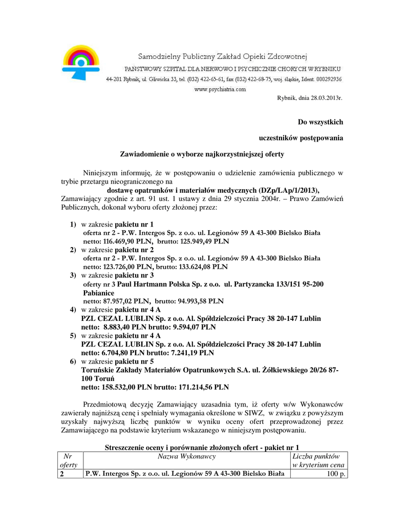 Rybnik, dnia 28.03.2013r. Do wszystkich uczestników postępowania Zawiadomienie o wyborze najkorzystniejszej oferty Niniejszym informuję, że w postępowaniu o udzielenie zamówienia publicznego w trybie przetargu nieograniczonego na dostawę opatrunków i materiałów medycznych (DZp/LAp/1/2013), Zamawiający zgodnie z art. 91 ust. 1 ustawy z dnia 29 stycznia 2004r. – Prawo Zamówień Publicznych, dokonał wyboru oferty złożonej przez: 1) w zakresie pakietu nr 1 oferta nr 2 - P.W. Intergos Sp. z o.o. ul. Legionów 59 A 43-300 Bielsko Biała netto: 116.469,90 PLN, brutto: 125.949,49 PLN 2) w zakresie pakietu nr 2 oferta nr 2 - P.W. Intergos Sp. z o.o. ul. Legionów 59 A 43-300 Bielsko Biała netto: 123.726,00 PLN, brutto: 133.624,08 PLN 3) w zakresie pakietu nr 3 oferty nr 3 Paul Hartmann Polska Sp. z o.o. ul. Partyzancka 133/151 95-200 Pabianice netto: 87.957,02 PLN, brutto: 94.993,58 PLN 4) w zakresie pakietu nr 4 A PZL CEZAL LUBLIN Sp. z o.o. Al. Spółdzielczości Pracy 38 20-147 Lublin netto: 8.883,40 PLN brutto: 9.594,07 PLN 5) w zakresie pakietu nr 4 A PZL CEZAL LUBLIN Sp. z o.o. Al. Spółdzielczości Pracy 38 20-147 Lublin netto: 6.704,80 PLN brutto: 7.241,19 PLN 6) w zakresie pakietu nr 5 Toruńskie Zakłady Materiałów Opatrunkowych S.A. ul. Żółkiewskiego 20/26 87100 Toruń netto: 158.532,00 PLN brutto: 171.214,56 PLN Przedmiotową decyzję Zamawiający uzasadnia tym, iż oferty w/w Wykonawców zawierały najniższą cenę i spełniały wymagania określone w SIWZ, w związku z powyższym uzyskały najwyższą liczbę punktów w wyniku oceny ofert przeprowadzonej przez Zamawiającego na podstawie kryterium wskazanego w niniejszym postępowaniu. Nr oferty 2 Streszczenie oceny i porównanie złożonych ofert - pakiet nr 1 Nazwa Wykonawcy Liczba punktów w kryterium cena P.W. Intergos Sp. z o.o. ul. Legionów 59 A 43-300 Bielsko Biała 100 p. Nr oferty 2 Nr oferty 3 6 Nr oferty 5 1 Nr oferty 5 3 Streszczenie oceny i porównanie złożonych ofert - pakiet nr 2 Nazwa Wykonawcy Liczba punktów w kryterium cena P.W. Intergos Sp. z o.o. ul. Legionów 59 A 43-300 Bielsko Biała 100 p. Streszczenie oceny i porównanie złożonych ofert - pakiet nr 3 Nazwa Wykonawcy Liczba punktów w kryterium cena 100 p. Paul Hartmann Polska Sp. z o.o. ul. Partyzancka 133/151 95200 Pabianice 98,40 p. Toruńskie Zakłady Materiałów Opatrunkowych S.A. ul. Żółkiewskiego 20/26 87-100 Toruń Streszczenie oceny i porównanie złożonych ofert - pakiet nr 4 A Nazwa Wykonawcy Liczba punktów w kryterium cena 100 p. PZL CEZAL LUBLIN Sp. z o.o. Al. Spółdzielczości Pracy 38 20-147 Lublin 87,92 p. SKAMEX Sp. z o.o. Sp. K. Ul. Częstochowska 38/52 93-121 Łódź Streszczenie oceny i porównanie złożonych ofert - pakiet nr 4 B Nazwa Wykonawcy Liczba punktów w kryterium cena 100 p. PZL CEZAL LUBLIN Sp. z o.o. Al. Spółdzielczości Pracy 38 20-147 Lublin 69,56 p. Paul Hartmann Polska Sp. z o.o. ul. Partyzancka 133/151 95200 Pabianice Streszczenie oceny i porównanie złożonych ofert - pakiet nr 5 Nazwa Wykonawcy Liczba punktów w kryterium cena 100 p. Toruńskie Zakłady Materiałów Opatrunkowych S.A. ul. Żółkiewskiego 20/26 87-100 Toruń Zamawiający informuje również, iż zgodnie z art. 89 ust. 1 pkt. 2 oraz art. 90 ust. 3 ustawy PZP odrzucił ofertę nr 4 złożoną w zakresie pakietu nr 3 przez GCZM ZARYS Sp. z o.o. ul. Pod Borem 18 41-808 Zabrze ponieważ w pozycji 6 produkt nie spełniał wymogów określonych w SIWZ, a produkty z pozycji 13 i 19 zaoferowano w rażąco niskiej cenie. Informacje dotyczące środków ochrony prawnej znajdujące się w rozdziale VII Specyfikacji Istotnych Warunków Zamówienia oraz w Dziale VI Ustawy z dnia 29 stycznia 2004 r. Prawo Zamówień Publicznych. Nr oferty 6 Z poważaniem Andrzej Krawczyk Dyrektor Szpitala
