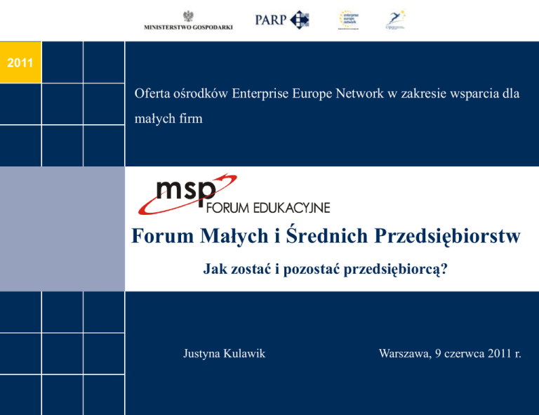 2011 Oferta ośrodków Enterprise Europe Network w zakresie wsparcia dla małych firm Forum Małych i Średnich Przedsiębiorstw Jak zostać i pozostać przedsiębiorcą? Justyna Kulawik Warszawa, 9 czerwca 2011 r. Warszawa, 9 czerwca 2011 r. Sieć Enterprise Europe Network - kim jesteśmy?  Zrzeszamy 600 organizacji na całym świecie:  izby handlowe,  regionalne agencje rozwoju,  uniwersyteckie ośrodki rozwoju,  Prowadzimy działalność w 45 krajach: Europa, Afryka, Ameryka Pn. i Płd., Azja, Bliski Wschód,  Korzystamy z doświadczenia dwóch poprzednio działających na rzecz MŚP sieci: Euro Info Centre i Innovation Relay Centre,  Świadczymy bezpłatne usługi. Warszawa, 9 czerwca 2011 r. Sieć Enterprise Europe Network w Polsce 30 ośrodków zrzeszonych w 4 konsorcja obejmujące terytorium całego kraju:  Central Poland BSN (mazowieckie, łódzkie, kujawsko-pomorskie, pomorskie),  BISNEP (podlaskie, warmińsko-mazurskie, lubelskie),  B2Europe West Poland (zachodniopomorskie, lubuskie, wielkopolskie, dolnośląskie, opolskie),  BSN South Poland (śląskie, małopolskie, świętokrzyskie, podkarpackie). Warszawa, 9 czerwca 2011 r. Informujemy: Jak prowadzić działalność gospodarczą?  prawo polskie i unijne,  prowadzenie działalności gospodarczej za granicą,  możliwe źródła finansowania dla sektora MSP,  źródła informacji europejskiej, W jaki sposób?  www.een.org.pl – 125 000 użytkowników  Newsletter – 521 odbiorców  Biuletyn Euro Info – 1550 prenumeratorów ośrodka działającego przy PARP  Odpowiadamy na pytania przedsiębiorców Warszawa, 9 czerwca 2011 r. Szukamy partnerów handlowych i technologicznych:  rejestracja we wspólnych bazach ośrodków Enterprise Europe Network (Business Cooperation Database – BCD i Bulletin Board System - BBS),  pomoc w opracowaniu ofert,  promocja za pośrednictwem ośrodków Sieci w innych krajach,  publikacja zagranicznych ofert kooperacyjnych w Biuletynie Euro Info i na stronie www.een.org.pl. Warszawa, 9 czerwca 2011 r. Szkolimy:  Szkolenia z cyklu „Europejskie Przedsiębiorstwo”  Pro-przyrodnicze inwestycje i rozwój MSP na obszarach Natura 2000  Warsztaty dla firm planujących uczestnictwo w Programach Ramowych UE  Unia celna Rosja-Białoruś-Kazachstan – możliwości dla polskich MŚP, wnioski po 1. roku obowiązywania  E-handel - wykorzystanie najnowszych kanałów marketingowych w internecie (serwisy www, konkursy, Facebook) do sprzedaży w Polsce i za granicą  Opóźnienia w płatnościach - sposoby przeciwdziałania, zarządzanie wierzytelnościami, regulacje polskie i europejskie Warszawa, 9 czerwca 2011 r. Giełdy kooperacyjne i spotkania brokerskie Bilateralne spotkania firm z danego sektora: • rejestracja i wybór partnerów do rozmów, • harmonogram spotkań, • formuła stolików, • najczęściej przy okazji targów i wystaw. Warszawa, 9 czerwca 2011 r. Planowane imprezy kooperacyjne: • Targi Technology 2011 (Tel Awiw) - branże: ICT, IT, automatyka, robotyka itp., 14 – 16 czerwca 2011 r. • Wielosektorowa misja przyjazdowa firm z Włoch (branże: mechaniczna, technologie spozywcze, ochrona środowiska, budownictwo) – 29 czerwca – 1 lipca 2011r. • Misja dla firm z branży IT promująca offshoring usług (targi, konferencja), Kopenhaga (Dania), Malmö (Szwecja) – 14 – 16 września 2011 r. • AGROEURASIA FAIR 2011 - targi rolno-hodowlane, technologie w rolnictwie, Turcja, 15 – 18 grudnia 2011 r. Warszawa, 9 czerwca 2011 r. Co zyskuje przedsiębiorca • kontakty z wyselekcjonowanymi partnerami handlowymi, • pomoc logistyczną i asystę, • pomoc lokalnych organizacji okołobiznesowych (partnerów ośrodka EEN), • niskie koszty związane z udziałem w imprezach kooperacyjnych. Warszawa, 9 czerwca 2011 r. Model współpracy technologicznej z klientami EEN Krok 1 - identyfikacja innowacyjnych firm (wizyta w firmie, ocena technologii) Krok 2 – identyfikacja profili technologicznych (poszukiwanie technologii) Krok 3- poszukiwanie partnerów (baza EEN, spotkania brokerskie) Krok 4 – doradztwo /signposting (IPR, finansowanie innowacji) Krok 5 – wsparcie w negocjacjach Warszawa, 9 czerwca 2011 r. Ośrodki EEN w Polsce Warszawa, 9 czerwca 2011 r. Strona internetowa • www.een.org.pl • informacja o targach i misjach współorganizowanych przez ośrodki Enterprise Europe Network, • informacja o seminariach i szkoleniach, • wyszukiwarka ofert kooperacyjnych, • publikacje i Biuletyn Euro Info. Warszawa, 9 czerwca 2011 r. Więcej informacji nt. rozwijania firmy udzielają Punkty Konsultacyjne KSU www.parp.gov.pl/pk Informatorium PARP tel. +48 22 432 89 91 do 93 oraz +48 801 33 22 02 [email protected] Polska Agencja Rozwoju Przedsiębiorczości ul. Pańska 81/83, 00-834 Warszawa tel. +48 22 432 80 80, fax +48 22 432 86 20 www.parp.gov.pl
