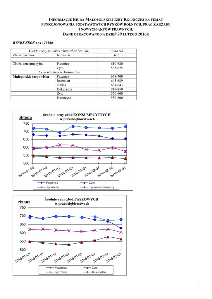 INFORMACJE BIURA MAŁOPOLSKIEJ IZBY ROLNICZEJ NA TEMAT FUNKCJONOWANIA PODSTAWOWYCH RYNKÓW ROLNYCH, PRAC ZARZĄDU I NOWYCH AKTÓW PRAWNYCH. DANE OPRACOWANO NA DZIEŃ 29 LUTEGO 2016R RYNEK ZBÓŻ-LUTY 2016R Giełda (ceny min/max skupu zbóż bez Vat) Zboża paszowe Jęczmień Cena zł/t 615 Zboża konsumpcyjne 610-620 565-625 Pszenica Żyto Cena min/max w Małopolsce Pszenica Małopolskie targowiska Jęczmień Owies Kukurydza Żyto Pszenżyto 678-709 645-689 631-643 817-850 550-600 550-600 1 Ceny zbóż w analizowanym okresie utrzymywały się na stabilnym poziomie. Stosunkowo duża podaż zbóż na rynkach europejskich powoduje zmniejszenie możliwości eksportu nasion. Duża część rolników decyduje się na sprzedaż posiadanych zapasów w związku z koniecznością zgromadzenia zapasów gotówki przeznaczonej na pokrycie kosztów zakupu środków do produkcji w sezonie wiosennym 2016 r. w ubiegłych latach korzystali oni ze środków jakie otrzymywali z tytułu dopłat bezpośrednich jednakże znaczne opóźnienia w wypłacaniu tych środków jakie obserwujemy w roku bieżącym powodują konieczność poszukiwania innych źródeł finansowania zakupu niezbędnych wiosną nawozów i środków ochrony roślin. Na giełdach towarowych odnotowuje się niewielką ilość transakcji z uwagi na brak popytu. Pszenica konsumpcyjna oferowana była w cenie 610-620 zł/t. zaś żyto w cennie 565-625 zł/t. Praktycznie brak jest w chwili obecnej na giełdach obrotu zbożami paszowymi. W analizowanym okresie zanotowano jedną transakcję zakupu 120 t. jęczmienia paszowego w cenie 615 zł./t. RYNEK TRZODY CHLEWNEJ I ŻYWCA WOŁOWEGO – luty 2016 r. Ceny bydła W miesiącu lutym na rynku bydła rzeźnego zaobserwowano niewielki wzrost cen skupu. Ceny były wyższe o. ok. 2% od cen oferowanych przed rokiem jednak nadal są znacznie niższe niż, w określanym jako rekordowy, roku 2012. Rozkład cen skupu wołowiny w Polsce nadal jest zróżnicowany w zależności od regionu. W północnej części kraju ceny skupowe żywca są wyższe niż w części południowej, jednak w kontekście obecnej sytuacji na rynku żywca wieprzowego, hodowla bydła opasowego zaczyna jawić się jako znacznie stabilniejsza i bardziej dochodowa. Bydło ogółem CENA ZAKUPU wg w.ż.* [zł/kg] 6,06-6,26 dla mpc** dla mps** [zł/tonę] [zł/tonę] 11 947-12 349 12 276-12 685 byki do 2 lat 6,70-7,17 12 897-13 300 13 155-13 566 byki > 2 lat 6,70-6,95 12 531-13 180 12 782-13 444 Krowy 4,62-4,74 10 134-10 220 10 337-10 425 jałówki 6,36-6,48 12 335-12 565 12 582-12 817 Kategoria bydła *jest to cena netto zapłacona dostawcom bydła za dostarczony do rzeźni lub zakupiony przez rzeźnię pełnowartościowy żywiec wołowy wraz z kosztami transportu dostawcy jak i rzeźni jeśli poniosła ona koszty transportu związane z zakupem żywca. Cena towaru zawiera również wszelkie dodatkowe płatności (premie , nagrody itp.) niezależnie od okresu w jakim zostały wypłacone. **-w.ż.- waga żywa ( cenę za wagę żywą wyliczono stosując średnie wskaźniki wydajności rzeźnej uzyskane w Polsce w roku 2004. mpc- masa poubojowa ciepła, mps- masa poubojowa schłodzona Ceny mleka Pogłębia się zaniepokojenie hodowców bydła mlecznego. Likwidacja kwotowania produkcji mleka pociągnęła za sobą przewidywane zwiększenie wolumenu produkcji. Dodatkowo wiele gospodarstw ucierpiało w ubiegłym roku z powodu panującej w naszym kraju suszy. Duża nadpodaż mleka surowego, spadki cen praktycznie wszystkich podstawowych produktów przerobu mleka, szczególnie mleka odtłuszczonego w proszku, masła oraz serów dojrzewających na europejskich i światowych giełdach, powoduje obniżanie cen skupu mleka surowego przez krajowych odbiorców. W okresie ostatniego roku średnia cena skupu mleka w stosunku do roku 2014 spadła o ok. 17%. Niewielkim pocieszeniem dla hodowców jest uruchomienie w okresie lutego naboru wniosków o udzielenie nadzwyczajnej pomocy dla producentów mleka. Rolnicy mocno akcentują 2 główne problemy związane z realizacją tego działania, a mianowicie zbyt niską kwotę pomocy przeznaczonej na jego realizację oraz późny (czerwiec/lipiec 2016 r.) termin wypłaty środków. Ceny prosiąt za parę na wybranych targowiskach w Małopolsce Miejscowość Krościenko Nowy Targ Proszowice Stary Sącz Szczucin Wadowice Zakliczyn Cena/para 380 440 240 280 240 260 300 Zapaść w hodowli trzody chlewnej pogłębia się z miesiąca na miesiąc. Wolny spadek cen zbóż, a co za tym idzie wysokie ceny pasz przemysłowych oraz ciągły wzrost pozostałych środków do produkcji, w tym nośników energii, przy stale niskich cenach skupu żywca powodują, że hodowla trzody chlewnej w naszym kraju powoli zamiera. Jak wynika z danych GUS pogłowie trzody zmniejszyło się w ciągu ostatniego roku o ok. 6%. Nie widać również perspektyw na nagły wzrost możliwości eksportu polskiej wieprzowiny. W tej dziedzinie jesteśmy bowiem ciągle uzależnieni w głównej mierze od fanaberii naszego wschodniego sąsiada, który co rusz wynajduje nowe przeszkody nie pozwalające na wznowienie eksportu. Wprowadzenie mechanizmu interwencyjnych dopłat do prywatnego przechowalnictwa wieprzowiny uruchomionych w ostatnim czasie na terenie Unii Europejskiej nie rozwiąże problemu a jedynie odroczy eskalację jego skutków. W obecnej sytuacji trudno bowiem spodziewać się, iż 2 odnotowywany do chwili obecnej spadek pogłowia znacząco wpłynie na zwiększenie cen skupu, co jest podstawowym warunkiem zwiększenia rentowności produkcji i, w dalszej perspektywie, na odwrócenie niekorzystnego dla hodowli trendu. Ceny EUROP zł/kg mpc S – 4,18-4,51 R – 3,48-3,91 E – 4,13-4,45 O – 3,12-3,52 U – 3,84-4,17 P – 2,46-2,96 RYNEK DROBIU – luty 2016 r. TOWAR POŁUD-WSCHOD POLSKA cena w zł/tonę Zmiana ceny [%] cena w zł/tonę Zmiana ceny [%] kurczęta typu brojler 3 267,9 3,3 3 327,8 5,1 indory 5 731,8 -2,3 5 900,0 -0,8 indyczki 5 620,4