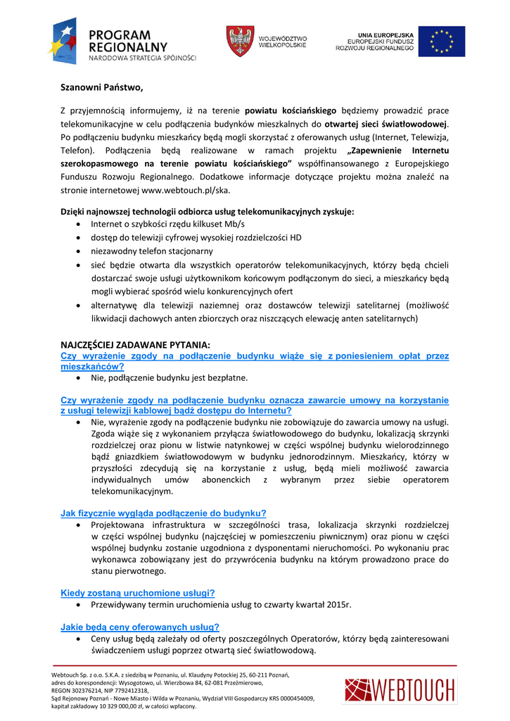 Szanowni Państwo, Z przyjemnością informujemy, iż na terenie powiatu kościańskiego będziemy prowadzić prace telekomunikacyjne w celu podłączenia budynków mieszkalnych do otwartej sieci światłowodowej. Po podłączeniu budynku mieszkańcy będą mogli skorzystać z oferowanych usług (Internet, Telewizja, Telefon). Podłączenia będą realizowane w ramach projektu „Zapewnienie Internetu szerokopasmowego na terenie powiatu kościańskiego” współfinansowanego z Europejskiego Funduszu Rozwoju Regionalnego. Dodatkowe informacje dotyczące projektu można znaleźć na stronie internetowej www.webtouch.pl/ska. Dzięki najnowszej technologii odbiorca usług telekomunikacyjnych zyskuje: Internet o szybkości rzędu kilkuset Mb/s dostęp do telewizji cyfrowej wysokiej rozdzielczości HD niezawodny telefon stacjonarny sieć będzie otwarta dla wszystkich operatorów telekomunikacyjnych, którzy będą chcieli dostarczać swoje usługi użytkownikom końcowym podłączonym do sieci, a mieszkańcy będą mogli wybierać spośród wielu konkurencyjnych ofert alternatywę dla telewizji naziemnej oraz dostawców telewizji satelitarnej (możliwość likwidacji dachowych anten zbiorczych oraz niszczących elewację anten satelitarnych) NAJCZĘŚCIEJ ZADAWANE PYTANIA: Czy wyrażenie zgody na podłączenie budynku wiąże się z poniesieniem opłat przez mieszkańców? Nie, podłączenie budynku jest bezpłatne. Czy wyrażenie zgody na podłączenie budynku oznacza zawarcie umowy na korzystanie z usługi telewizji kablowej bądź dostępu do Internetu? Nie, wyrażenie zgody na podłączenie budynku nie zobowiązuje do zawarcia umowy na usługi. Zgoda wiąże się z wykonaniem przyłącza światłowodowego do budynku, lokalizacją skrzynki rozdzielczej oraz pionu w listwie natynkowej w części wspólnej budynku wielorodzinnego bądź gniazdkiem światłowodowym w budynku jednorodzinnym. Mieszkańcy, którzy w przyszłości zdecydują się na korzystanie z usług, będą mieli możliwość zawarcia indywidualnych umów abonenckich z wybranym przez siebie operatorem telekomunikacyjnym. Jak fizycznie wygląda podłączenie do budynku? Projektowana infrastruktura w szczególności trasa, lokalizacja skrzynki rozdzielczej w części wspólnej budynku (najczęściej w pomieszczeniu piwnicznym) oraz pionu w części wspólnej budynku zostanie uzgodniona z dysponentami nieruchomości. Po wykonaniu prac wykonawca zobowiązany jest do przywrócenia budynku na którym prowadzono prace do stanu pierwotnego. Kiedy zostaną uruchomione usługi? Przewidywany termin uruchomienia usług to czwarty kwartał 2015r. Jakie będą ceny oferowanych usług? Ceny usług będą zależały od oferty poszczególnych Operatorów, którzy będą zainteresowani świadczeniem usługi poprzez otwartą sieć światłowodową. Webtouch Sp. z o.o. S.K.A. z siedzibą w Poznaniu, ul. Klaudyny Potockiej 25, 60-211 Poznań, adres do korespondencji: Wysogotowo, ul. Wierzbowa 84, 62-081 Przeźmierowo, REGON 302376214, NIP 7792412318, Sąd Rejonowy Poznań - Nowe Miasto i Wilda w Poznaniu, Wydział VIII Gospodarczy KRS 0000454009, kapitał zakładowy 10 329 000,00 zł, w całości wpłacony. Wszelkie pytania proszę kierować do: Maciej Werwiński - Specjalista ds. Uzgodnień e-mail: [email protected] tel. kontaktowy: 780 225 569 Webtouch Sp. z o.o. S.K.A. z siedzibą w Poznaniu, ul. Klaudyny Potockiej 25, 60-211 Poznań, adres do korespondencji: Wysogotowo, ul. Wierzbowa 84, 62-081 Przeźmierowo, REGON 302376214, NIP 7792412318, Sąd Rejonowy Poznań - Nowe Miasto i Wilda w Poznaniu, Wydział VIII Gospodarczy KRS 0000454009, kapitał zakładowy 10 329 000,00 zł, w całości wpłacony.