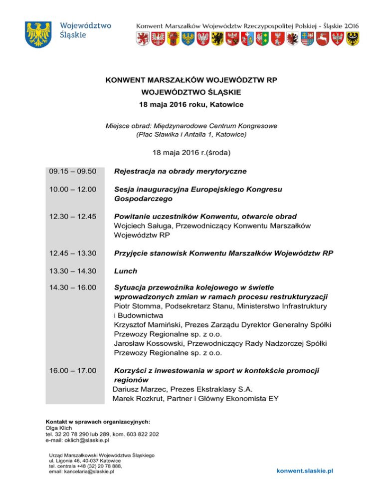 KONWENT MARSZAŁKÓW WOJEWÓDZTW RP WOJEWÓDZTWO ŚLĄSKIE 18 maja 2016 roku, Katowice Miejsce obrad: Międzynarodowe Centrum Kongresowe (Plac Sławika i Antalla 1, Katowice) 18 maja 2016 r.(środa) 09.15 – 09.50 Rejestracja na obrady merytoryczne 10.00 – 12.00 Sesja inauguracyjna Europejskiego Kongresu Gospodarczego 12.30 – 12.45 Powitanie uczestników Konwentu, otwarcie obrad Wojciech Saługa, Przewodniczący Konwentu Marszałków Województw RP 12.45 – 13.30 Przyjęcie stanowisk Konwentu Marszałków Województw RP 13.30 – 14.30 Lunch 14.30 – 16.00 Sytuacja przewoźnika kolejowego w świetle wprowadzonych zmian w ramach procesu restrukturyzacji Piotr Stomma, Podsekretarz Stanu, Ministerstwo Infrastruktury i Budownictwa Krzysztof Mamiński, Prezes Zarządu Dyrektor Generalny Spółki Przewozy Regionalne sp. z o.o. Jarosław Kossowski, Przewodniczący Rady Nadzorczej Spółki Przewozy Regionalne sp. z o.o. 16.00 – 17.00 Korzyści z inwestowania w sport w kontekście promocji regionów Dariusz Marzec, Prezes Ekstraklasy S.A. Marek Rozkrut, Partner i Główny Ekonomista EY Kontakt w sprawach organizacyjnych: Olga Klich tel. 32 20 78 290 lub 289, kom. 603 822 202 e-mail: [email protected] Urząd Marszałkowski Województwa Śląskiego ul. Ligonia 46, 40-037 Katowice tel. centrala +48 (32) 20 78 888, email: [email protected] konwent.slaskie.pl