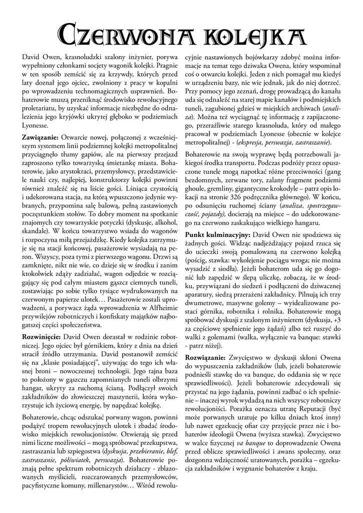 Czerwona kolejka David Owen, krasnoludzki szalony inżynier, porywa wypełniony członkami socjety wagonik kolejki. Pragnie w ten sposób zemścić się za krzywdy, których przed laty doznał jego ojciec, zwolniony z pracy w kopalni po wprowadzeniu technomagicznych usprawnień. Bohaterowie muszą przeniknąć środowisko rewolucyjnego proletariatu, by uzyskać informacje niezbędne do odnalezienia jego kryjówki ukrytej głęboko w podziemiach Lyonesse. Zawiązanie: Otwarcie nowej, połączonej z wcześniejszym systemem linii podziemnej kolejki metropolitalnej przyciągnęło tłumy gapiów, ale na pierwszy przejazd zaproszono tylko towarzyską śmietankę miasta. Bohaterowie, jako arystokraci, przemysłowcy, przedstawiciele nauki czy, najlepiej, konstruktorzy kolejki powinni również znaleźć się na liście gości. Lśniąca czystością i udekorowana stacja, na którą wpuszczono jedynie wybranych, przypomina salę balową, pełną zastawionych poczęstunkiem stołów. To dobry moment na spotkanie znajomych czy towarzyskie potyczki (dyskusje, alkohol, skandale). W końcu towarzystwo wsiada do wagonów i rozpoczyna miłą przejażdżkę. Kiedy kolejka zatrzymuje się na stacji końcowej, pasażerowie wysiadają na peron. Wszyscy, poza tymi z pierwszego wagonu. Drzwi są zamknięte, nikt nie wie, co dzieje się w środku i zanim ktokolwiek zdąży zadziałać, wagon odjedzie w rozciągający się pod całym miastem gąszcz ciemnych tuneli, zostawiając po sobie tylko tysiące wydrukowanych na czerwonym papierze ulotek… Pasażerowie zostali uprowadzeni, a porywacz żąda wprowadzenia w Alfheimie przywilejów robotniczych i konfiskaty majątków najbogatszej części społeczeństwa. Rozwinięcie: David Owen dorastał w rodzinie robotniczej. Jego ojciec był górnikiem, który z dnia na dzień stracił źródło utrzymania. David postanowił zemścić się na „klasie posiadającej”, używając do tego ich własnej broni – nowoczesnej technologii. Jego tajna baza to położony w gąszczu zapomnianych tuneli olbrzymi hangar, ukryty za ruchomą ścianą. Podłączył swoich zakładników do złowieszczej maszynerii, która wykorzystuje ich życiową energię, by napędzać kolejkę. Bohaterowie, chcąc odszukać porwany wagon, powinni podążyć tropem rewolucyjnych ulotek i zbadać środowisko miejskich rewolucjonistów. Otwierają się przed nimi liczne możliwości – mogą spróbować przekupstwa, zastraszania lub szpiegostwa (dyskusja, przebieranie, blef, zastraszanie, półświatek, perswazja). Bohaterowie poznają pełne spektrum robotniczych działaczy - zblazowanych myślicieli, rozczarowanych przemysłowców, pacyfistyczne komuny, millenarystów… Wśród rewolu- cyjnie nastawionych bojówkarzy zdobyć można informacje na temat tego dziwaka Owena, który wspominał coś o otwarciu kolejki. Jeden z nich pomagał mu kiedyś w urządzeniu bazy, nie wie jednak, jak do niej dotrzeć. Przy pomocy jego zeznań, drogę prowadzącą do kanału uda się odnaleźć na starej mapie kanałów i podmiejskich tuneli, zagubionej gdzieś w miejskich archiwach (analiza). Można też wyciągnąć tę informację z zapijaczonego, przeraźliwie starego krasnoluda, który od małego pracował w podziemiach Lyonesse (obecnie w kolejce metropolitalnej) - (ekspresja, perswazja, zastraszanie). Bohaterowie na swoją wyprawę będą potrzebowali jakiegoś środka transportu. Podczas podróży przez opuszczone tunele mogą napotkać różne przeciwności (gang bezdomnych, zerwane tory, zalany fragment podziemi ghoule, gremliny, gigantyczne krokodyle – patrz opis lokacji na stronie 326 podręcznika głównego). W końcu, po odsunięciu ruchomej ściany (analiza, spostrzegawczość, pojazdy), docierają na miejsce – do udekorowanego na czerwono zaskakująco wielkiego hangaru. Punkt kulminacyjny: David Owen nie spodziewa się żadnych gości. Widząc nadjeżdżający pojazd rzuca się do ucieczki swoją pomalowaną na czerwono kolejką (pościg, stawka: wykolejenie pociągu wroga; nie można wysadzić z siodła). Jeżeli bohaterom uda się go dogonić lub zapędzić w ślepą uliczkę, zobaczą, że w środku, przywiązani do siedzeń i podłączeni do dziwacznej aparatury, siedzą przerażeni zakładnicy. Pilnują ich trzy dwumetrowe, masywne golemy – wyidealizowane postaci górnika, robotnika i rolnika. Bohaterowie mogą spróbować dyskusji z szalonym inżynierem (dyskusja, +3 za częściowe spełnienie jego żądań) albo też ruszyć do walki z golemami (walka, wyłącznie va banque: stawki - patrz niżej). Rozwiązanie: Zwycięstwo w dyskusji skłoni Owena do wypuszczenia zakładników (lub, jeżeli bohaterowie podnieśli stawkę do va banque, do oddania się w ręce sprawiedliwości). Jeżeli bohaterowie zdecydowali się przystać na jego żądania, powinni zadbać o ich spełnienie – inaczej wyrok wydadzą na nich wszyscy robotniczy rewolucjoniści. Porażka oznacza utratę Reputacji (być może porwanych uratuje po kilku dniach ktoś inny) lub nawet egzekucję ofiar czy przyjęcie przez nie i bohaterów ideologii Owena (wyższa stawka). Zwycięstwo w walce fizycznej va banque to doprowadzenie Owena przed oblicze sprawiedliwości i awans społeczny, oraz dozgonna wdzięczność uratowanych, porażka – egzekucja zakładników i wygnanie bohaterów z kraju. Statystyki antagonistów Bob Gillen, dawny towarzysz Owena David Owen, terrorysta Bob na pierwszy rzut oka wygląda na bezdomnego i w tym przypadku pozory nie mylą – wywrotowej działalności poświęcił całe swoje życie. Radykalnymi hasłami stara się zakryć swoje tchórzostwo – w rzeczywistości nigdy nie zrobił niczego naprawdę nielegalnego, a wobec osób z wyższych sfer jest po prostu nieśmiały. Domyśla konfrontacja: dyskusja. Przeciwnik, ogr, pula 2k10; odporność 3. Zdolności: •świadomość klasowa: niedeklarowane dobicia przeciwko osobom wyglądającym na burżujów; •cechy rasowe: to tylko ogr – ni