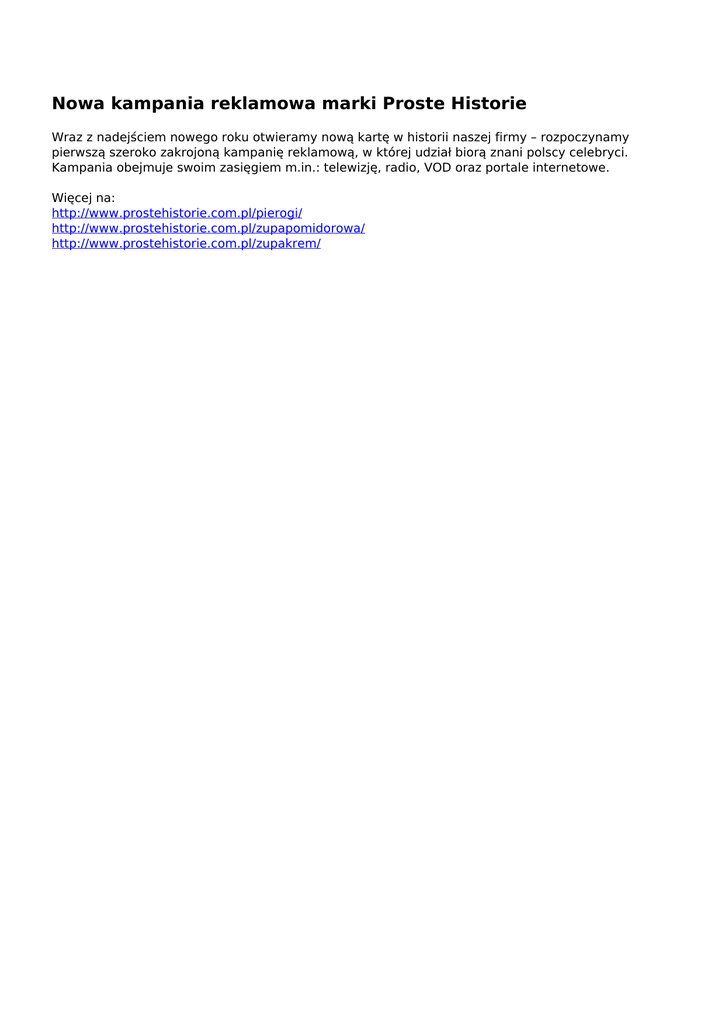 Nowa kampania reklamowa marki Proste Historie Wraz z nadejściem nowego roku otwieramy nową kartę w historii naszej firmy – rozpoczynamy pierwszą szeroko zakrojoną kampanię reklamową, w której udział biorą znani polscy celebryci. Kampania obejmuje swoim zasięgiem m.in.: telewizję, radio, VOD oraz portale internetowe. Więcej na: http://www.prostehistorie.com.pl/pierogi/ http://www.prostehistorie.com.pl/zupapomidorowa/ http://www.prostehistorie.com.pl/zupakrem/ Powered by TCPDF (www.tcpdf.org)