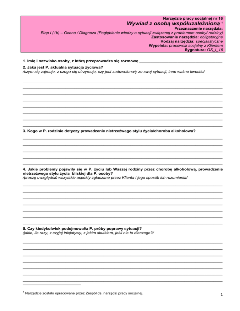 Narzędzie pracy socjalnej nr 16 Wywiad z osobą współuzależnioną 1 Przeznaczenie narzędzia: Etap I (1b) – Ocena / Diagnoza (Pogłębienie wiedzy o sytuacji związanej z problemem osoby/ rodziny) Zastosowanie narzędzia: obligatoryjne Rodzaj narzędzia: specjalistyczne Wypełnia: pracownik socjalny z Klientem Sygnatura: OS_I_16 1. Imię i nazwisko osoby, z którą przeprowadza się rozmowę _____________________________________ 2. Jaka jest P. aktualna sytuacja życiowa? /czym się zajmuje, z czego się utrzymuje, czy jest zadowolona/y ze swej sytuacji, inne ważne kwestie/ _________________________________________________________________________________________ _________________________________________________________________________________________ _________________________________________________________________________________________ _________________________________________________________________________________________ _________________________________________________________________________________________ _________________________________________________________________________________________ _________________________________________________________________________________________ _________________________________________________________________________________________ 3. Kogo w P. rodzinie dotyczy prowadzenie nietrzeźwego stylu życia/choroba alkoholowa? _________________________________________________________________________________________ _________________________________________________________________________________________ _________________________________________________________________________________________ _________________________________________________________________________________________ _________________________________________________________________________________________ 4. Jakie problemy pojawiły się w P. życiu lub Waszej rodziny przez chorobę alkoholową, prowadzenie nietrzeźwego stylu życia bliskiej dla P. osoby? /proszę uwzględnić wszystkie aspekty zgłaszane przez Klienta i jego sposób ich rozumienia/ _________________________________________________________________________________________ _________________________________________________________________________________________ _________________________________________________________________________________________ _________________________________________________________________________________________ _________________________________________________________________________________________ _________________________________________________________________________________________ _________________________________________________________________________________________ 5. Czy kiedykolwiek podejmował/a P. próby poprawy sytuacji? /jakie, ile razy, z czyjej inicjatywy, z jakim skutkiem, jeśli nie to dlaczego?/ _________________________________________________________________________________________ _________________________________________________________________________________________ _________________________________________________________________________________________ _________________________________________________________________________________________ _________________________________________________________________________________________ _________________________________________________________________________________________ _________________________________________________________________________________________ 1 Narzędzie zostało opracowane przez Zespół ds. narzędzi pracy socjalnej. 1 6. Dlaczego przychodzi P. właśnie teraz do OPS? _________________________________________________________________________________________ _________________________________________________________________________________________ _________________________________________________________________________________________ _________________________________________________________________________________________ _________________________________________________________________________________________ 7. Jak radził/a sobie P. do tej pory? Z jakiej pomocy, wsparcia korzystał/a P. do tej pory? _________________________________________________________________________________________ _________________________________________________________________________________________ _________________________________________________________________________________________ _________________________________________________________________________________________ ________________________________________________________________________________________ 8.Jaki P. chce osiągnąć cel? /czy chce dokonać zmian w sobie, czy w osobie uzależnionej, w jakim celu chce aby osoba uzależniona przestała pić, czy wyobraża sobie sytuacje, gdy osoba uzależniona nie dokonuje zmian a jest szczęśliwa, może funkcjonować, zaspakajać swoje różne potrzeby/ _________________________________________________________________________________________ _________________________________________________________________________________________ _________________________________________________________________________________________ _________________________________________________________________________________________ _________________________________________________________________________________________ 9. Jaką pomoc chciał/a/by P. uzyskać i od kogo? /proszę uwzględnić wszystkie oczekiwania dotyczące możliwej pomocy w tym zakresie oraz osób, które miałyby się do tego przyczynić/ _________________________________________________________________________________________ _________________________________________________________________________________________ _________________________________________________________________________________________ _________________________________________________________________________________________ _______________________________________________________________________