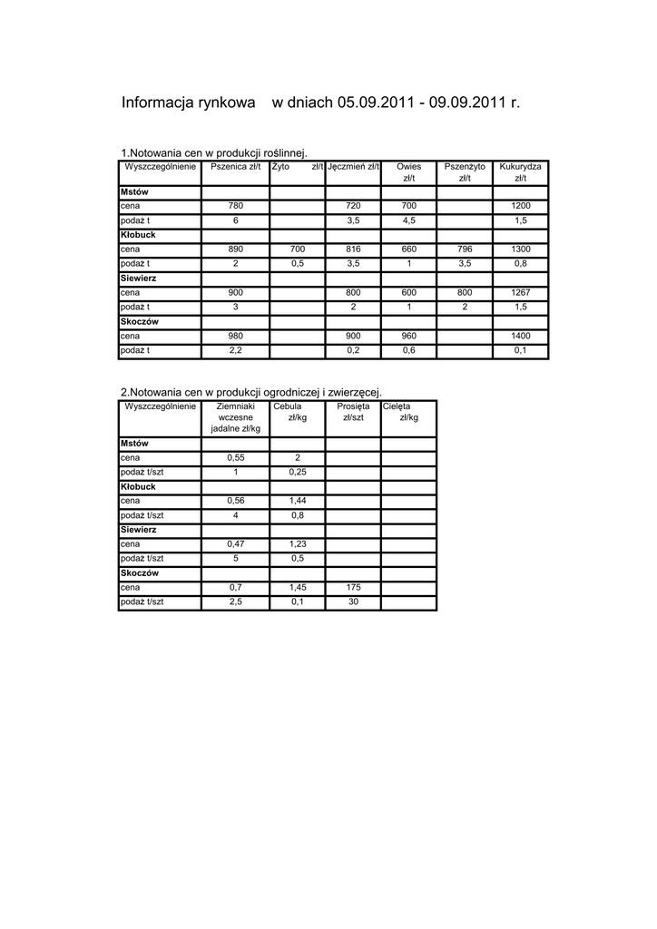 Informacja rynkowa w dniach 05.09.2011 - 09.09.2011 r. 1.Notowania cen w produkcji roślinnej. Wyszczególnienie Pszenica zł/t Żyto zł/t Jęczmień zł/t Owies zł/t Pszenżyto zł/t Kukurydza zł/t Mstów cena podaż t 780 720 700 1200 6 3,5 4,5 1,5 Kłobuck cena 890 700 816 660 796 1300 2 0,5 3,5 1 3,5 0,8 900 800 600 800 1267 3 2 1 2 1,5 cena 980 900 960 1400 podaż t 2,2 0,2 0,6 0,1 podaż t Siewierz cena podaż t Skoczów 2.Notowania cen w produkcji ogrodniczej i zwierzęcej. Wyszczególnienie Ziemniaki wczesne jadalne zł/kg Cebula zł/kg Prosięta zł/szt Mstów cena 0,55 2 1 0,25 0,56 1,44 4 0,8 0,47 1,23 5 0,5 cena 0,7 1,45 175 podaż t/szt 2,5 0,1 30 podaż t/szt Kłobuck cena podaż t/szt Siewierz cena podaż t/szt Skoczów Cielęta zł/kg
