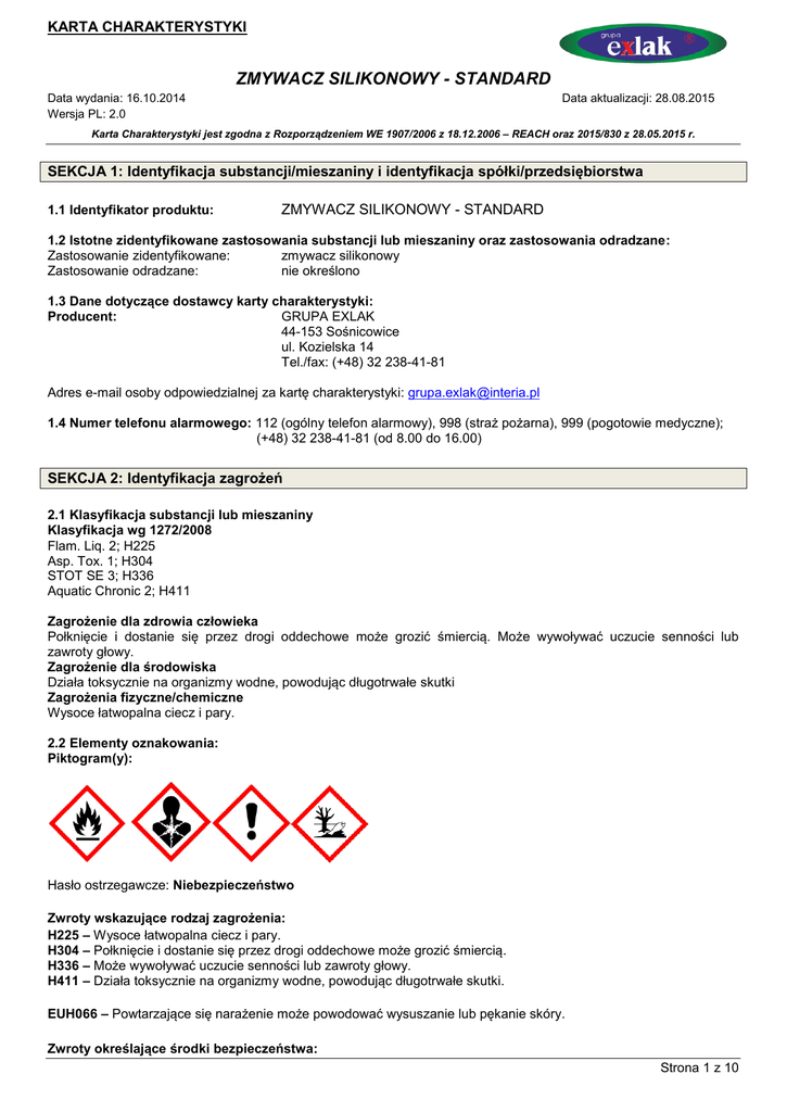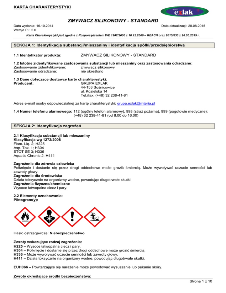 KARTA CHARAKTERYSTYKI ZMYWACZ SILIKONOWY - STANDARD Data wydania: 16.10.2014 Wersja PL: 2.0 Data aktualizacji: 28.08.2015 Karta Charakterystyki jest zgodna z Rozporządzeniem WE 1907/2006 z 18.12.2006 – REACH oraz 2015/830 z 28.05.2015 r. SEKCJA 1: Identyfikacja substancji/mieszaniny i identyfikacja spółki/przedsiębiorstwa 1.1 Identyfikator produktu: ZMYWACZ SILIKONOWY - STANDARD 1.2 Istotne zidentyfikowane zastosowania substancji lub mieszaniny oraz zastosowania odradzane: Zastosowanie zidentyfikowane: zmywacz silikonowy Zastosowanie odradzane: nie określono 1.3 Dane dotyczące dostawcy karty charakterystyki: Producent: GRUPA EXLAK 44-153 Sośnicowice ul. Kozielska 14 Tel./fax: (+48) 32 238-41-81 Adres e-mail osoby odpowiedzialnej za kartę charakterystyki: [email protected] 1.4 Numer telefonu alarmowego: 112 (ogólny telefon alarmowy), 998 (straż pożarna), 999 (pogotowie medyczne); (+48) 32 238-41-81 (od 8.00 do 16.00) SEKCJA 2: Identyfikacja zagrożeń 2.1 Klasyfikacja substancji lub mieszaniny Klasyfikacja wg 1272/2008 Flam. Liq. 2; H225 Asp. Tox. 1; H304 STOT SE 3; H336 Aquatic Chronic 2; H411 Zagrożenie dla zdrowia człowieka Połknięcie i dostanie się przez drogi oddechowe może grozić śmiercią. Może wywoływać uczucie senności lub zawroty głowy. Zagrożenie dla środowiska Działa toksycznie na organizmy wodne, powodując długotrwałe skutki Zagrożenia fizyczne/chemiczne Wysoce łatwopalna ciecz i pary. 2.2 Elementy oznakowania: Piktogram(y): Hasło ostrzegawcze: Niebezpieczeństwo Zwroty wskazujące rodzaj zagrożenia: H225 – Wysoce łatwopalna ciecz i pary. H304 – Połknięcie i dostanie się przez drogi oddechowe może grozić śmiercią. H336 – Może wywoływać uczucie senności lub zawroty głowy. H411 – Działa toksycznie na organizmy wodne, powodując długotrwałe skutki. EUH066 – Powtarzające się narażenie może powodować wysuszanie lub pękanie skóry. Zwroty określające środki bezpieczeństwa: Strona 1 z 10 KARTA CHARAKTERYSTYKI ZMYWACZ SILIKONOWY - STANDARD Data wydania: 16.10.2014 Wersja PL: 2.0 Data aktualizacji: 28.08.2015 Karta Charakterystyki jest zgodna z Rozporządzeniem WE 1907/2006 z 18.12.2006 – REACH oraz 2015/830 z 28.05.2015 r. P210 – Przechowywać z dala od źródeł ciepła, gorących powierzchni, źródeł iskrzenia, otwartego ognia i innych źródeł zapłonu. Nie palić. P273 – Unikać uwolnienia do środowiska. P280 – Stosować rękawice ochronne/odzież ochronną/ ochronę oczu/ochronę twarzy. P302+P352 – W PRZYPADKU KONTAKTU ZE SKÓRĄ: umyć dużą ilością wody z mydłem. P304+P340 – W PRZYPADKU DOSTANIA SIĘ DO DRÓG ODDECHOWYCH: wyprowadzić lub wynieść poszkodowanego na świeże powietrze i zapewnić mu warunki do swobodnego oddychania. Składniki niebezpieczne: Węglowodory C7-C9, n-alkany, izoalkany, cykliczne (WE: 920-750-0); Cykloheksan (CAS: 110-82-7), n-heksan (CAS: 110-54-3) 2.3 Inne zagrożenia: Brak innych zagrożeń. Brak informacji na temat spełnienia kryteriów PBT lub vPvB zgodnie z załącznikiem XIII rozporządzenia REACH. Odpowiednie badania nie były przeprowadzone. SEKCJA 3: Skład/informacja o składnikach 3.1 Substancje: Nie dotyczy. 3.2 Mieszaniny: Niebezpieczne składniki: Identyfikator produktu Zawartość % Węglowodory C7-C9, n-alkany, izoalkany, cykliczne CAS: WE: 920-750-0 Nr indeksowy: Nr REACH: 01-2119473851-33-XXXX 90 – 100 Octan 1-metoksy-2-propylu CAS: 108-65-6 WE: 203-603-9 Nr indeksowy: 607-195-00-7 Nr REACH: 01-2119475791-29-XXXX 1–5 Klasyfikacja CLP Kody zwrotów Klasa zagrożenia wskazujących i kody kategorii rodzaj zagrożenia Flam. Liq. 2 Asp. Tox. 1 STOT SE 3 Aquatic Chronic 2 H225 H304 H336 H411 Flam. Liq. 3 H226 Flam. Liq. 2 Asp. Tox. 1 STOT SE 3 Skin Irrit. 2 Aquatic Acute 1 Aquatic Chronic 1 H225 H304 H336 H315 H400 H410 Węglowodory C7-C9 zawierają: Cykloheksan CAS: 110-82-7 WE: 203-806-2 Nr indeksowy: 601-017-00-1 Nr REACH: substancja podlega przepisom okresu przejściowego <2 Strona 2 z 10 KARTA CHARAKTERYSTYKI ZMYWACZ SILIKONOWY - STANDARD Data wydania: 16.10.2014 Wersja PL: 2.0 Data aktualizacji: 28.08.2015 Karta Charakterystyki jest zgodna z Rozporządzeniem WE 1907/2006 z 18.12.2006 – REACH oraz 2015/830 z 28.05.2015 r. n-heksan CAS: 110-54-3 WE: 203-777-6 Nr indeksowy: 601-037-00-0 Nr REACH: substancja podlega przepisom okresu przejściowego <3 Flam. Liq. 2 Asp. Tox. 1 Rerp.2 STOT SE 3 STOT RE 2 Skin Irrit. 2 Aquatic Chronic 2 H225 H304 H361f H336 H373 H315 H411 Pełna treść zwrotów H w sekcji 16 SEKCJA 4: Środki pierwszej pomocy 4.1 Opis środków pierwszej pomocy W przypadku kontaktu ze skórą: Umyć zabrudzoną skórę wodą z mydłem, spłukać dokładnie wodą, w przypadku pojawienia się podrażnienia, rumieni skontaktować się z lekarzem. W przypadku kontaktu z oczami: Przepłukać oczy przez kilkanaście minut (ok. 15) dużą ilością wody, trzymając powieki szeroko rozwarte. Unikać silnego strumienia, ze względu na niebezpieczeństwo uszkodzenia rogówki, skontaktować się z lekarzem. Narażenie inhalacyjne: W razie zawrotów głowy lub nudności wyprowadzić poszkodowanego na świeże powietrze, w razie braku szybkiej poprawy zasięgnąć porady lekarza. W przypadku połknięcia: Nie wywoływać wymiotów, natychmiast skontaktować się z lekarzem. Nie podawać niczego doustnie osobie nieprzytomnej 4.2 Najważniejsze ostre i opóźnione objawy oraz skutki narażenia: Kontakt ze skórą: możliwe podrażnienia, zaczerwienienia, wysuszanie, pękanie. Kontakt z oczami: delikatne podrażnienia w przypadku bezpośredniego narażenia Układ oddechowy: podrażnienie błon śluzowych nosa, gardła i dalszych odcinków układu oddechowego, może wpływać depresyjnie na centralny układ nerwowy. Objawami są bóle i zawroty głowy, uczucie senności, osłabienie. Przewód pokarmowy: podrażnienia chemiczne jamy ustnej, gardła i dalszych odcinków przewodu pokarmowego. Po wchłonięciu mogą wystąpić objawy zatrucia
