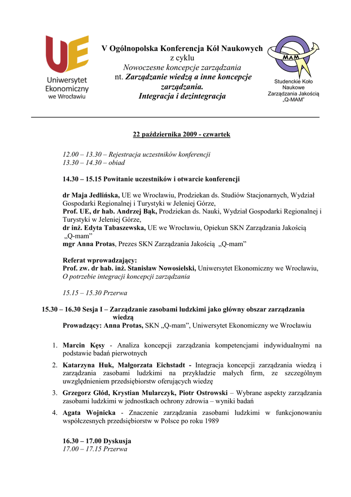 V Ogólnopolska Konferencja Kół Naukowych z cyklu Nowoczesne koncepcje zarządzania nt. Zarządzanie wiedzą a inne koncepcje zarządzania. Integracja i dezintegracja Studenckie Koło Naukowe Zarządzania Jakością „Q-MAM” 22 października 2009 - czwartek 12.00 – 13.30 – Rejestracja uczestników konferencji 13.30 – 14.30 – obiad 14.30 – 15.15 Powitanie uczestników i otwarcie konferencji dr Maja Jedlińska, UE we Wrocławiu, Prodziekan ds. Studiów Stacjonarnych, Wydział Gospodarki Regionalnej i Turystyki w Jeleniej Górze, Prof. UE, dr hab. Andrzej Bąk, Prodziekan ds. Nauki, Wydział Gospodarki Regionalnej i Turystyki w Jeleniej Górze, dr inż. Edyta Tabaszewska, UE we Wrocławiu, Opiekun SKN Zarządzania Jakością „Q-mam” mgr Anna Protas, Prezes SKN Zarządzania Jakością „Q-mam” Referat wprowadzający: Prof. zw. dr hab. inż. Stanisław Nowosielski, Uniwersytet Ekonomiczny we Wrocławiu, O potrzebie integracji koncepcji zarządzania 15.15 – 15.30 Przerwa 15.30 – 16.30 Sesja I – Zarządzanie zasobami ludzkimi jako główny obszar zarządzania wiedzą Prowadzący: Anna Protas, SKN „Q-mam”, Uniwersytet Ekonomiczny we Wrocławiu 1. Marcin Kęsy - Analiza koncepcji zarządzania kompetencjami indywidualnymi na podstawie badań pierwotnych 2. Katarzyna Huk, Małgorzata Eichstadt - Integracja koncepcji zarządzania wiedzą i zarządzania zasobami ludzkimi na przykładzie małych firm, ze szczególnym uwzględnieniem przedsiębiorstw oferujących wiedzę 3. Grzegorz Głód, Krystian Mularczyk, Piotr Ostrowski – Wybrane aspekty zarządzania zasobami ludzkimi w jednostkach ochrony zdrowia – wyniki badań 4. Agata Wojnicka - Znaczenie zarządzania zasobami ludzkimi w funkcjonowaniu współczesnych przedsiębiorstw w Polsce po roku 1989 16.30 – 17.00 Dyskusja 17.00 – 17.15 Przerwa 17.15 – 18.30 Sesja II – Pracownik w systemie zarządzania wiedzą Prowadzący: Katarzyna Huk, KN Zarządzania i Przedsiębiorczości „Meritum”, doktorantka, Uniwersytet Ekonomiczny we Wrocławiu Referat wprowadzający: Prof. UE dr hab. Mieczysław Morawski, Uniwersytet Ekonomiczny we Wrocławiu, Zarządzanie talentami 1. Magdalena Adamczyk, Mateusz Kubasiak - Rola zasobów ludzkich w zarządzaniu wiedzą 2. Ewa Geresz – Wpływ różnic kulturowych na proces zarządzania wiedzą w organizacji 3. Piotr Kuczyński - Świadomość strategiczna pracowników jako źródło przewagi konkurencyjnej przedsiębiorstwa 18.30 – 19.00 Dyskusja 20.00 Kolacja zbójnicka – wymagana ciepła odzież, sportowe obuwie i dobry humor 23 października 2009 - piątek 8.30 – 9.30 Śniadanie 9.30 – 13.30 Wycieczka do najpiękniejszego miejsca w Karkonoszach - wymagana cieplejsza odzież i wygodne, sportowe obuwie 13.30 – 14.15 Obiad 14.15 – 14.30 Wspólne zdjęcie przed ośrodkiem – wymagane szerokie uśmiechy 14.30 – 16.00 Sesja III – Zarządzanie wiedzą w służbie relacji z klientami Prowadzący: Marek Krasiński, Międzywydziałowe Koło Naukowe Krajów Wschodnioazjatyckich „Kaizen”, doktorant, Uniwersytet Ekonomiczny we Wrocławiu Referat wprowadzający: Prof. nadzw. dr hab. Mirosław Kwieciński, Krakowska Szkoła Wyższa im. Andrzeja Frycza Modrzewskiego, Wywiad gospodarczy - metakoncepcja zarządzania przedsiębiorstwem 1. Justyna Kostaś, Marta Piotrowska – Integracja zarządzania wiedzą z CRM na podstawie Europejskiego Funduszu Leasingowego – oddział w Wałbrzychu 2. Anna Protas, Magdalena Protas – Zarządzanie relacjami z klientem w oparciu o wiedzę na przykładzie firmy CLARENA 3. Monika Puzyńska - Portal korporacyjny jako informatyczne narzędzie wspomagające zarządzanie wiedzą na przykładzie Ogicom Sp. z o.o. 4. Magdalena Wróbel, Natalia Busse - Wiedza o wymaganiach klienta jako czynnik kształtowania jakości usług taksówkarskich w Łodzi 16.00 – 16.30 Dyskusja 16.30 – 16.45 Przerwa 16.45 – 18.15 Sesja IV - Zarządzanie wiedzą w praktyce (przerwa około 17.00) Prowadzący: Magdalena Protas, SKN „Q-mam”, doktorantka, Uniwersytet Ekonomiczny we Wrocławiu 1. KGHM CUPRUM sp. z o.o. Centrum Badawczo – Rozwojowe – Adriana Banera – Kierownik ds. Personalnych, Leszek Zaremba - Specjalista w Biurze Zarządzania Projektami, Zarządzanie wiedzą w kontekście zarządzania zasobami ludzkimi w KGHM Cuprum sp. z o.o. – CBR 2. CLARENA Polska – Wojciech Pyzik - Prezes, Łukasz Staszczak - Menadżer Działu Handlowego, Zarządzanie wiedzą w CLARENA Polska 3. PMPoland S.A. – Halina Truszczyńska - Kierownik Działu Rozwoju Personelu i Zarządzania Wiedzą, PMPoland jako organizacja ucząca się 4. Maciej Skrobisz – pracownik wiedzy, Zarządzanie wiedzą w projektach wdrożeniowych 18.15 – 19.30 Dyskusja 20.00 – Kolacja 21.00 – Występ Kabaretu ADecHaDe www.adechade.prv.pl 22.00 - Zabawa 24 października 2009 - sobota 8.45 – 9.30 Śniadanie 9.30 – 10.30 Sesja V – Znaczenie wiedzy w logistyce Prowadzący: Krystian Mularczyk, KN „Menedżer”, doktorant, Akademia Ekonomiczna w Katowicach 1. Tomasz Janeczko, Wojciech Musiał - Zarządzanie wiedzą w systemie magazynowym przedsiębiorstwa produkcyjnego 2. Marta Partyka, Krzysztof Nadolny - Benchmarking w procesie przygotowania produkcji nowego wyrobu 3. Daniel Wilczyński, Krzysztof Nadolny - Koncepcja modernizacji procesów logistycznych z wykorzystaniem zarządzania wiedzą na przykładzie przedsiębiorstwa usługowo - produkcyjnego 4. Tomasz Wyszyński - Zarządzanie wiedzą jako element łańcucha dostaw: przypadek Metro Group 10.30 – 11.00 Dyskusja 11.00 – 11.15 Przerwa 11.15 – 12.00 Sesja VI – Kształtowanie organizacji zorientowanej na wiedzę Prowadzący: Daniel Wilczyński, KN Logistyki „LOGTECH”, Politechnika Koszalińska 1. Marek Krasiński - Czy Hoshin Kanri ma szansę stać się w Polsce popularnym modelem strategicznego zarządzania jakością? 2. Paweł Paluchowski - Strategiczne zarządzanie wiedzą w przedsiębiorstwie opartym na wiedzy n
