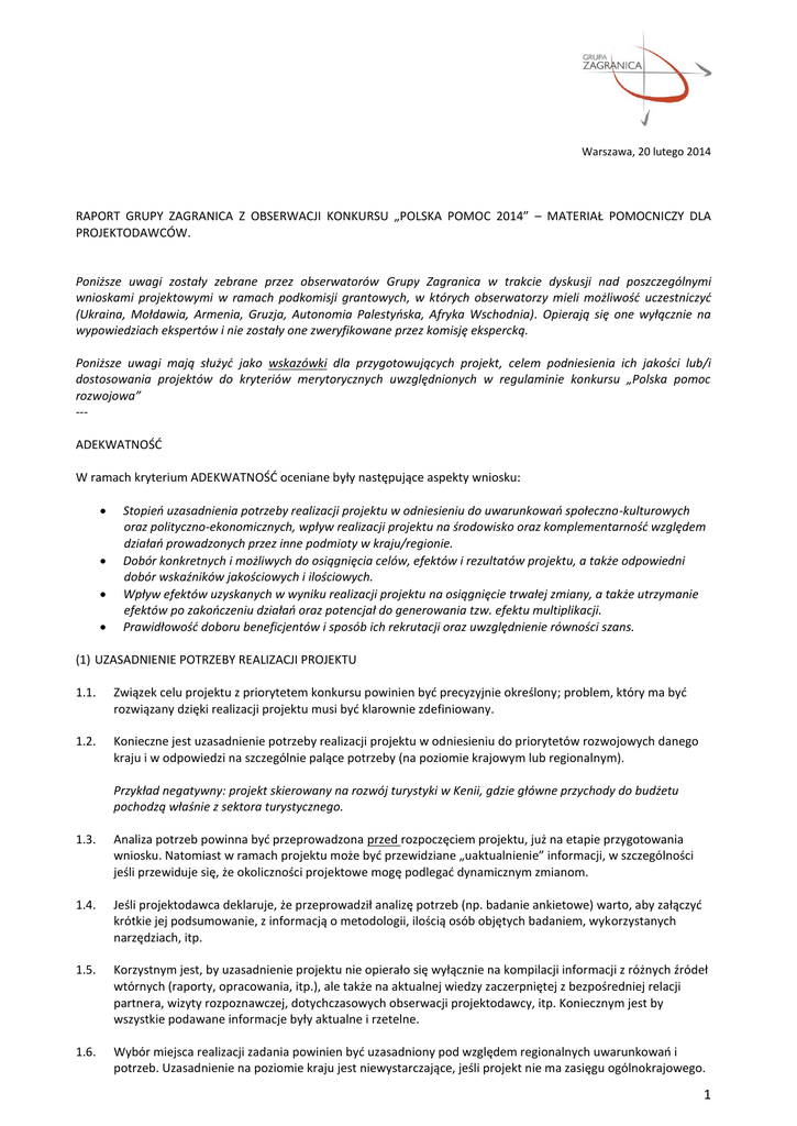 Warszawa, 20 lutego 2014 RAPORT GRUPY ZAGRANICA Z OBSERWACJI KONKURSU „POLSKA POMOC 2014” – MATERIAŁ POMOCNICZY DLA PROJEKTODAWCÓW. Poniższe uwagi zostały zebrane przez obserwatorów Grupy Zagranica w trakcie dyskusji nad poszczególnymi wnioskami projektowymi w ramach podkomisji grantowych, w których obserwatorzy mieli możliwość uczestniczyć (Ukraina, Mołdawia, Armenia, Gruzja, Autonomia Palestyńska, Afryka Wschodnia). Opierają się one wyłącznie na wypowiedziach ekspertów i nie zostały one zweryfikowane przez komisję ekspercką. Poniższe uwagi mają służyć jako wskazówki dla przygotowujących projekt, celem podniesienia ich jakości lub/i dostosowania projektów do kryteriów merytorycznych uwzględnionych w regulaminie konkursu „Polska pomoc rozwojowa” --ADEKWATNOŚĆ W ramach kryterium ADEKWATNOŚĆ oceniane były następujące aspekty wniosku: Stopień uzasadnienia potrzeby realizacji projektu w odniesieniu do uwarunkowań społeczno-kulturowych oraz polityczno-ekonomicznych, wpływ realizacji projektu na środowisko oraz komplementarność względem działań prowadzonych przez inne podmioty w kraju/regionie. Dobór konkretnych i możliwych do osiągnięcia celów, efektów i rezultatów projektu, a także odpowiedni dobór wskaźników jakościowych i ilościowych. Wpływ efektów uzyskanych w wyniku realizacji projektu na osiągnięcie trwałej zmiany, a także utrzymanie efektów po zakończeniu działań oraz potencjał do generowania tzw. efektu multiplikacji. Prawidłowość doboru beneficjentów i sposób ich rekrutacji oraz uwzględnienie równości szans. (1) UZASADNIENIE POTRZEBY REALIZACJI PROJEKTU 1.1. Związek celu projektu z priorytetem konkursu powinien być precyzyjnie określony; problem, który ma być rozwiązany dzięki realizacji projektu musi być klarownie zdefiniowany. 1.2. Konieczne jest uzasadnienie potrzeby realizacji projektu w odniesieniu do priorytetów rozwojowych danego kraju i w odpowiedzi na szczególnie palące potrzeby (na poziomie krajowym lub regionalnym). Przykład negatywny: projekt skierowany na rozwój turystyki w Kenii, gdzie główne przychody do budżetu pochodzą właśnie z sektora turystycznego. 1.3. Analiza potrzeb powinna być przeprowadzona przed rozpoczęciem projektu, już na etapie przygotowania wniosku. Natomiast w ramach projektu może być przewidziane „uaktualnienie” informacji, w szczególności jeśli przewiduje się, że okoliczności projektowe mogę podlegać dynamicznym zmianom. 1.4. Jeśli projektodawca deklaruje, że przeprowadził analizę potrzeb (np. badanie ankietowe) warto, aby załączyć krótkie jej podsumowanie, z informacją o metodologii, ilością osób objętych badaniem, wykorzystanych narzędziach, itp. 1.5. Korzystnym jest, by uzasadnienie projektu nie opierało się wyłącznie na kompilacji informacji z różnych źródeł wtórnych (raporty, opracowania, itp.), ale także na aktualnej wiedzy zaczerpniętej z bezpośredniej relacji partnera, wizyty rozpoznawczej, dotychczasowych obserwacji projektodawcy, itp. Koniecznym jest by wszystkie podawane informacje były aktualne i rzetelne. 1.6. Wybór miejsca realizacji zadania powinien być uzasadniony pod względem regionalnych uwarunkowań i potrzeb. Uzasadnienie na poziomie kraju jest niewystarczające, jeśli projekt nie ma zasięgu ogólnokrajowego. 1 Przykład negatywny: projekty na rzecz edukacji w Kenii prowadzone są w Nairobi gdzie poziom skolaryzacji sięga 90% (w innych regionach kraju jest zdecydowanie niższy). 1.7. Dobór regionu działania powinien mieć charakter merytoryczny, a nie organizacyjno-logistyczny, tzn. dotychczasowe doświadczenie i działanie organizacji w regionie to powód niewystarczający dla podjęcia tam działań, szczególnie jeśli dotyczą one zupełnie nowego zakresu tematycznego. Nie zmienia to faktu, że wykazanie dotychczasowych działań projektodawcy oraz ich rezultatów jest korzystne z punktu widzenia oceny wniosku, szczególnie jeśli projekt stanowi kontynuację dotychczasowych działań (patrz punkt 1.4.) 1.8. Jeśli projektodawca prowadził już projekt o podobnym zakresie tematycznym i planuje wdrożyć go w nowych regionach (lub krajach), powinien wskazać, że uwzględnił ich specyfikę oraz posiada rozeznanie i umocowanie w nowych realiach (lokalni partnerzy, dostosowanie programu szkoleń, dostosowany sposób przeprowadzenia rekrutacji, itp.). Ponadto warto uzasadnić dlaczego wybrano nowe lokalizacje dla projektu. Niekorzystne jest powielanie tego samego projektu na nowych terenach bez uwzględnienia ich specyfiki społecznej, politycznej i kulturowej. Zdarzają się nawet błędy i rażące niedopatrzenia, gdy projektodawca w opisie projektu dla Mołdawii wymienia ukraińskie miasta. 1.9. Tematyka projektu i proponowane działania powinny być spójne z systemami instytucjonalnymi/prawnymi i z funkcjonującymi procedurami lub też wskazywać, w jaki sposób mają wprowadzić zmianę systemową lub proceduralną. W przeciwnym razie projekt może okazać się „zawieszony w próżni”, bez gwarancji uzyskania trwałych rezultatów. Przykład negatywny: wprowadzenie segregacji śmieci w kilkunastu szkołach, jeśli miasto nie posiada sprawnego systemu segregacji odpadami. Problem zarządzania odpadami jest istotny, ale należałoby zacząć pracę od wyższego poziomu – krajowego lub regionalnego – gdzie możliwe byłoby wprowadzenie zmiany systemowej. 1.10. Jeśli projekt prowadzony jest we współpracy z jednostkami samorządu, należy uwzględnić na ile uwarunkowania polityczne (np. kolejne wybory samorządowe) mogą wpłynąć na długofalowe rezultaty projektu. Przykład negatywny: projekt ma na celu przygotowanie długofalowej strategii rozwoju miasta oraz przeszkolenie kilku osób z administracji, jednak istnieje ryzyko, że zmiany osobowe i polityczne, które mogą zajść w najbliższym roku (w związku z wyborami) mogą udaremnić wszelkie próby