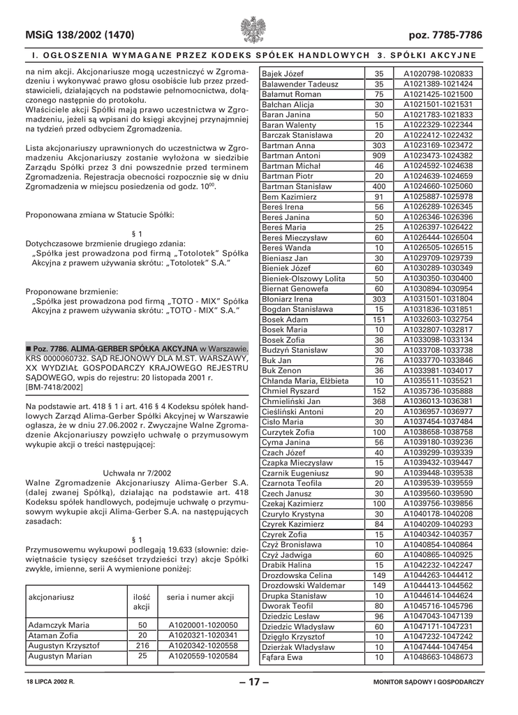 MSiG 138/2002 (1470) poz. 7785-7786 I. OGŁOSZENIA WYMAGANE PRZEZ KODEKS SPÓŁEK HANDLOWYCH na nim akcji. Akcjonariusze mogą uczestniczyć w Zgromadzeniu i wykonywać prawo głosu osobiście lub przez przedstawicieli, działających na podstawie pełnomocnictwa, dołączonego następnie do protokołu. Właściciele akcji Spółki mają prawo uczestnictwa w Zgromadzeniu, jeżeli są wpisani do księgi akcyjnej przynajmniej na tydzień przed odbyciem Zgromadzenia. Lista akcjonariuszy uprawnionych do uczestnictwa w Zgromadzeniu Akcjonariuszy zostanie wyłożona w siedzibie Zarządu Spółki przez 3 dni powszednie przed terminem Zgromadzenia. Rejestracja obecności rozpocznie się w dniu Zgromadzenia w miejscu posiedzenia od godz. 1000. Proponowana zmiana w Statucie Spółki: §1 Dotychczasowe brzmienie drugiego zdania: „Spółka jest prowadzona pod firmą „Totolotek” Spółka Akcyjna z prawem używania skrótu: „Totolotek” S.A.” Proponowane brzmienie: „Spółka jest prowadzona pod firmą „TOTO - MIX” Spółka Akcyjna z prawem używania skrótu: „TOTO - MIX” S.A.” Poz. 7786. ALIMA-GERBER SPÓŁKA AKCYJNA w Warszawie. KRS 0000060732. SĄD REJONOWY DLA M.ST. WARSZAWY, XX WYDZIAŁ GOSPODARCZY KRAJOWEGO REJESTRU SĄDOWEGO, wpis do rejestru: 20 listopada 2001 r. [BM-7418/2002] Na podstawie art. 418 § 1 i art. 416 § 4 Kodeksu spółek handlowych Zarząd Alima-Gerber Spółki Akcyjnej w Warszawie ogłasza, że w dniu 27.06.2002 r. Zwyczajne Walne Zgromadzenie Akcjonariuszy powzięło uchwałę o przymusowym wykupie akcji o treści następującej: Uchwała nr 7/2002 Walne Zgromadzenie Akcjonariuszy Alima-Gerber S.A. (dalej zwanej Spółką), działając na podstawie art. 418 Kodeksu spółek handlowych, podejmuje uchwałę o przymusowym wykupie akcji Alima-Gerber S.A. na następujących zasadach: §1 Przymusowemu wykupowi podlegają 19.633 (słownie: dziewiętnaście tysięcy sześćset trzydzieści trzy) akcje Spółki zwykłe, imienne, serii A wymienione poniżej: akcjonariusz Adamczyk Maria Ataman Zofia Augustyn Krzysztof Augustyn Marian 18 LIPCA 2002 R. ilość akcji 50 20 216 25 seria i numer akcji A1020001-1020050 A1020321-1020341 A1020342-1020558 A1020559-1020584 Bajek Józef Balawender Tadeusz Bałamut Roman Bałchan Alicja Baran Janina Baran Walenty Barczak Stanisława Bartman Anna Bartman Antoni Bartman Michał Bartman Piotr Bartman Stanisław Bem Kazimierz Bereś Irena Bereś Janina Bereś Maria Bereś Mieczysław Bereś Wanda Bieniasz Jan Bieniek Józef Bieniek-Olszowy Lolita Biernat Genowefa Błoniarz Irena Bogdan Stanisława Bosek Adam Bosek Maria Bosek Zofia Budzyń Stanisław Buk Jan Buk Zenon Chłanda Maria, Elżbieta Chmiel Ryszard Chmieliński Jan Cieśliński Antoni Cisło Maria Curzytek Zofia Cyma Janina Czach Józef Czapka Mieczysław Czarnik Eugeniusz Czarnota Teofila Czech Janusz Czekaj Kazimierz Czuryło Krystyna Czyrek Kazimierz Czyrek Zofia Czyż Bronisława Czyż Jadwiga Drabik Halina Drozdowska Celina Drozdowski Waldemar Drupka Stanisław Dworak Teofil Dziedzic Lesław Dziedzic Władysław Dzięgło Krzysztof Dzierżak Władysław Fąfara Ewa – 17 – 3. SPÓŁKI AKCYJNE 35 35 75 30 50 15 20 303 909 46 20 400 91 56 50 25 60 10 30 60 50 60 303 15 151 10 36 30 76 36 10 152 368 20 30 100 56 40 15 90 20 30 100 30 84 15 10 60 15 149 149 10 80 96 60 10 10 10 A1020798-1020833 A1021389-1021424 A1021425-1021500 A1021501-1021531 A1021783-1021833 A1022329-1022344 A1022412-1022432 A1023169-1023472 A1023473-1024382 A1024592-1024638 A1024639-1024659 A1024660-1025060 A1025887-1025978 A1026289-1026345 A1026346-1026396 A1026397-1026422 A1026444-1026504 A1026505-1026515 A1029709-1029739 A1030289-1030349 A1030350-1030400 A1030894-1030954 A1031501-1031804 A1031836-1031851 A1032603-1032754 A1032807-1032817 A1033098-1033134 A1033708-1033738 A1033770-1033846 A1033981-1034017 A1035511-1035521 A1035736-1035888 A1036013-1036381 A1036957-1036977 A1037454-1037484 A1038658-1038758 A1039180-1039236 A1039299-1039339 A1039432-1039447 A1039448-1039538 A1039539-1039559 A1039560-1039590 A1039756-1039856 A1040178-1040208 A1040209-1040293 A1040342-1040357 A1040854-1040864 A1040865-1040925 A1042232-1042247 A1044263-1044412 A1044413-1044562 A1044614-1044624 A1045716-1045796 A1047043-1047139 A1047171-1047231 A1047232-1047242 A1047444-1047454 A1048663-1048673 MONITOR SĄDOWY I GOSPODARCZY MSiG 138/2002 (1470) poz. 7786 I. OGŁOSZENIA WYMAGANE PRZEZ KODEKS SPÓŁEK HANDLOWYCH Flaga Józefa Frączek Ewa Frączek Halina Frańczyk Marian Fuglewicz Barbara Furman Józef Furtak Zofia Gajda Zofia Gancarz Małgorzata Gaweł Janusz Gazda Tadeusz Głowiak Maria Grabek Tadeusz Grad Teresa Grobelny Kazimierz Grochala Genowefa Grzywa Zofia Guzik Kazimierz Guzy Józef Gwizdak Alicja Gwizdak Helena Hałdys Emilia Hodur Maria Iwon Stanisława Janusz Franciszek Kamińska Zofia Kamiński Paweł Kasica Małgorzata Kaszowska Grażyna Kawa Zdzisław Kawalec Alicja Kawalec Teresa Kędzior Józef Kędzior Józefa Kempa Leszek Kisała Genowefa Kisała Stanisław Klęsk Paweł Kloc Edward Kloc Maria Kloc Tadeusz Kmiotek Agnieszka Kmiotek Edward Kobaka Maria Kogut Bożena Kogutek Henryka Kołodziej Alicja Kopeć Andrzej Kornak Kazimiera Kościólek Roman Kot Franciszek Kot Krystyna Kot Maria Kot Stanisław Kot Wiesław Kotarba Walenty Kotarba Zygmunt Krok Józef MONITOR SĄDOWY I GOSPODARCZY 5 30 114 30 30 20 41 15 131 55 30 151 36 112 45 20 20 45 8 45 30 10 25 15 15 15 15 197 45 41 20 30 60 50 546 25 184 149 60 100 30 60 30 100 10 41 70 60 15 30 10 20 30 30 60 15 103 30 A1049637-1049642 A1049842-1049872 A1049873-1049987 A1050141-1050171 A1050451-1050481 A1050574-1050594 A1050699-1050740 A1050741-1050756 A1051329-1051460 A1051823-1051878 A1051941-1051971 A1052301-1052456 A1053845-1053881 A1054034-1054146 A1054249-1054294 A1054295-1054315 A1055194-1055214 A1056509-1056554 A1056555-1056563 A1056564-1056609 A1056671-1056701 A1057357-1057367 A1057542-1057567 A1059834-1059849 A1061417-1061432 A1063261-1063276 A1