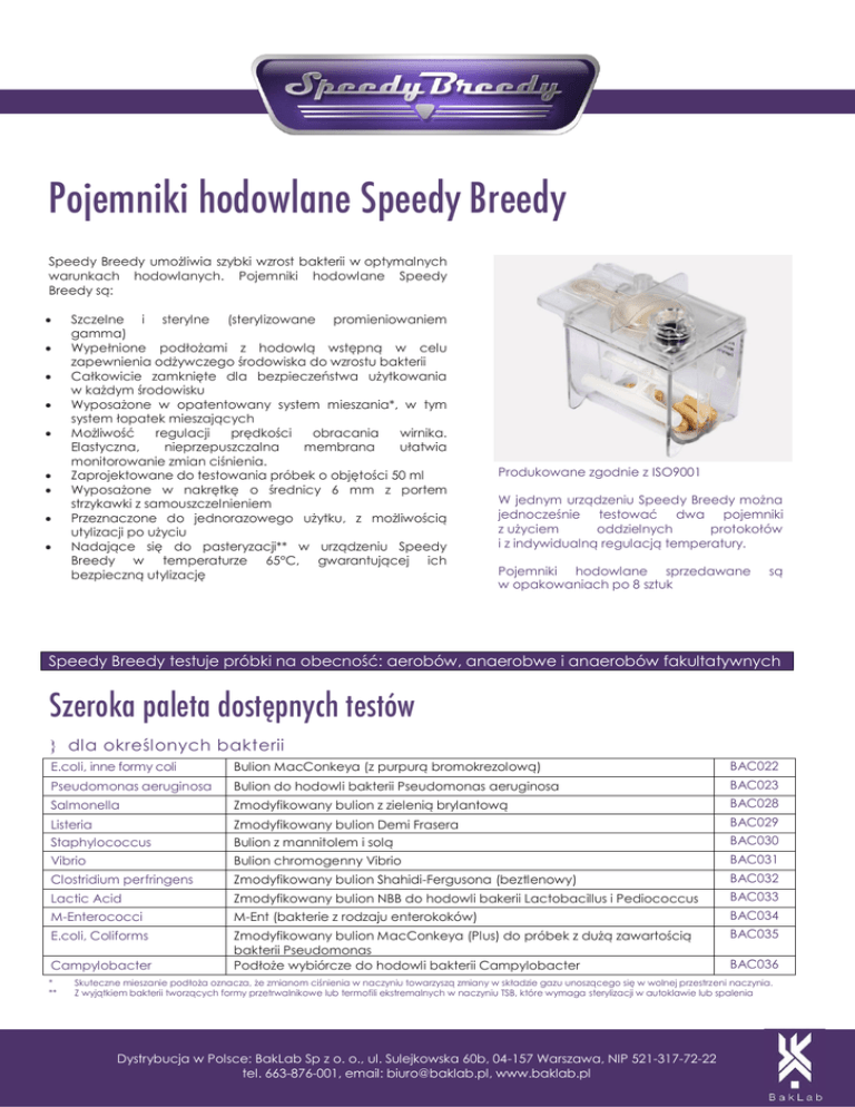 Pojemniki hodowlane Speedy Breedy Speedy Breedy umożliwia szybki wzrost bakterii w optymalnych warunkach hodowlanych. Pojemniki hodowlane Speedy Breedy są: Szczelne i sterylne (sterylizowane promieniowaniem gamma) Wypełnione podłożami z hodowlą wstępną w celu zapewnienia odżywczego środowiska do wzrostu bakterii Całkowicie zamknięte dla bezpieczeństwa użytkowania w każdym środowisku Wyposażone w opatentowany system mieszania*, w tym system łopatek mieszających Możliwość regulacji prędkości obracania wirnika. Elastyczna, nieprzepuszczalna membrana ułatwia monitorowanie zmian ciśnienia. Zaprojektowane do testowania próbek o objętości 50 ml Wyposażone w nakrętkę o średnicy 6 mm z portem strzykawki z samouszczelnieniem Przeznaczone do jednorazowego użytku, z możliwością utylizacji po użyciu Nadające się do pasteryzacji** w urządzeniu Speedy Breedy w temperaturze 65°C, gwarantującej ich bezpieczną utylizację Produkowane zgodnie z ISO9001 W jednym urządzeniu Speedy Breedy można jednocześnie testować dwa pojemniki z użyciem oddzielnych protokołów i z indywidualną regulacją temperatury. Pojemniki hodowlane sprzedawane w opakowaniach po 8 sztuk są Speedy Breedy testuje próbki na obecność: aerobów, anaerobwe i anaerobów fakultatywnych Szeroka paleta dostępnych testów } dla określonych bakterii E.coli, inne formy coli Bulion MacConkeya (z purpurą bromokrezolową) BAC022 Pseudomonas aeruginosa Bulion do hodowli bakterii Pseudomonas aeruginosa BAC023 Salmonella Zmodyfikowany bulion z zielenią brylantową BAC028 Listeria Zmodyfikowany bulion Demi Frasera BAC029 Staphylococcus Bulion z mannitolem i solą BAC030 Vibrio Bulion chromogenny Vibrio BAC031 Clostridium perfringens Zmodyfikowany bulion Shahidi-Fergusona (beztlenowy) BAC032 Lactic Acid Zmodyfikowany bulion NBB do hodowli bakerii Lactobacillus i Pediococcus (beztlenowy) M-Ent (bakterie z rodzaju enterokoków) BAC033 Zmodyfikowany bulion MacConkeya (Plus) do próbek z dużą zawartością bakterii Pseudomonas Podłoże wybiórcze do hodowli bakterii Campylobacter BAC035 M-Enterococci E.coli, Coliforms Campylobacter * ** BAC034 BAC036 Skuteczne mieszanie podłoża oznacza, że zmianom ciśnienia w naczyniu towarzyszą zmiany w składzie gazu unoszącego się w wolnej przestrzeni naczynia. Z wyjątkiem bakterii tworzących formy przetrwalnikowe lub termofili ekstremalnych w naczyniu TSB, które wymaga sterylizacji w autoklawie lub spalenia Dystrybucja w Polsce: BakLab Sp z o. o., ul. Sulejkowska 60b, 04-157 Warszawa, NIP 521-317-72-22 tel. 663-876-001, email: [email protected], www.baklab.pl } dla sterylności i higieny Bulion tryptozowo-sojowy BAC021 Wszystkie rodzaje drożdży Bulion do hodowli drożdży i pleśni (wykrywanie wszystkich rodzajów drożdży) BAC027 Dzikie drożdże Bulion do hodowli drożdży i pleśni (wykrywanie dzikich rodzajów drożdży) BAC026 Sterylność i higiena } dla drożdży } dla specyficznych wymagań użytkownika BAC020 Puste pojemniki Podłoże wybrane przez uzytkownika Puste pojemniki z możliwością wypełnienia podłożem według preferencji użytkowników. Podobnie jak inne pojemniki hodowlane, puste pojemniki do hodowli są standardowo sterylizowane, ale bez podłoży i mogą być używane z podłożami wybranymi przez użytkownika. Podłoże musi być poddane sterylizacji (zazwyczaj w autoklawie) i przeniesione w sposób aseptyczny do pojemniki hodowlanego po schłodzeniu do temperatury poniżej 60°C.. Pojemniki hodowlane Rodzaje próbek Urządzenie Speedy Breedy oferuje możliwość testowania wszystkich rodzajów płynów, w tym cieczy nieprzeźroczystych, proszków, macerowanych materiałów stałych i pociętych wacików wymazowych, uzupełnionych wodą sterylną do pojemności 50 ml. Pojemność robocza wynosi 50 ml. W przypadku próbek niepłynnych całkowita objętość próbki i wody sterylnej powinna wynosić 50 ml. Napełnianie pojemniki hodowlanego Próbki wprowadzane są do pojemniki hodowlanego przez port próbki. Do próbek płynnych zalecamy używanie jałowych, jednorazowych strzykawek 50 ml. W przypadku próbek niepłynnych całkowita objętość próbki i wody sterylnej powinna wynosić 50 ml. Pojemność robocza każdego z pojemników hodowlanych wynosi 50 ml. Utylizacja pojemniki hodowlanego Przed każdą pracą mikrobiologiczną, w tym utylizacją odpadów, należy przeprowadzić ocenę zagrożenia takiej pracy dla zdrowia i bezpieczeństwa. Metody utylizacji: Pasteryzacja w urządzeniu Speedy Breedy (3 godz. w temp. 65°C) – metoda niedostępna dla pojemników hodowlanych TSB i Clostridium perfingens. Pojemniki mogą być następnie usuwane jako zwykłe odpady (należy przestrzegać lokalnych przepisów prawa). Autoklawowanie w temperaturze 121°C przy 15 psi przez 15 minut. Pojemniki mogą być następnie usuwane jako zwykłe odpady (należy przestrzegać lokalnych przepisów prawa). Spalanie/usuwanie odpadów niebezpiecznych Używanie pojemników hodowlanych jako miniaturowych pojemników fermentacyjnych Pojemniki testowe Speedy Breedy produkowane są zgodnie z ISO9001 Urządzenia Speedy Breedy produkowane są zgodnie z ISO9001 Speedy Breedy spełnia dyrektywy niskiego napięcia – Certyfikat CE Urządzenie Speedy Breedy może być używane jako szybki, przenośny, samodzielny i zoptymalizowany miniaturowy system fermentacyjny, który nie wymaga zbytniego przygotowania, etapów pośrednich czy angażowania operatora. Pojemniki jednorazowego użytku nadają się do bezpiecznej utylizacji po użyciu. Pojemniki fermentacyjne muszą być stale monitorowane podczas pracy i czyszczone po użyciu przez wykwalifikowanych operatorów. Używanie urządzenia Speedy Breedy ułatwia prowadzenie fermentacji przez każdego członka personelu. Monitorowanie ciśnienia I temperatury odbywa się automatycznie. Dystrybucja w Polsce: BakLab Sp z o. o., ul. Sulejkowska 60b, 04-157 Warszawa, NIP 521-317-72-22 tel. 663-876-001, email: [em