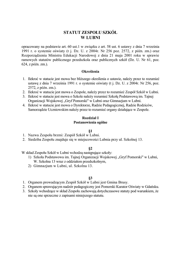 STATUT ZESPOŁU SZKÓŁ W LUBNI opracowany na podstawie art. 60 ust.1 w związku z art. 58 ust. 6 ustawy z dnia 7 września 1991 r. o systemie oświaty (t j. Dz. U. z 2004r. Nr 256 poz. 2572, z późn. zm.) oraz Rozporządzenia Ministra Edukacji Narodowej z dnia 21 maja 2001 roku w sprawie ramowych statutów publicznego przedszkola oraz publicznych szkół (Dz. U. Nr 61, poz. 624, z późn. zm.). Określenia 1. Ilekroć w statucie jest mowa bez bliższego określenia o ustawie, należy przez to rozumieć ustawę z dnia 7 września 1991 r. o systemie oświaty (t j. Dz. U. z 2004r. Nr 256, poz. 2572, z późn. zm.). 2. Ilekroć w statucie jest mowa o Zespole, należy przez to rozumieć Zespół Szkół w Lubni. 3. Ilekroć w statucie jest mowa o Szkole należy rozumieć Szkołę Podstawową im. Tajnej Organizacji Wojskowej „Gryf Pomorski" w Lubni oraz Gimnazjum w Lubni. 4. Ilekroć w statucie jest mowa o Dyrektorze, Radzie Pedagogicznej, Radzie Rodziców, Samorządzie Uczniowskim należy przez to rozumieć organy działające w Zespole. Rozdział I Postanowienia ogólne §1 1. Nazwa Zespołu brzmi: Zespół Szkół w Lubni. 2. Siedziba Zespołu znajduje się w miejscowości Lubnia przy ul. Szkolnej 13. §2 W skład Zespołu Szkół w Lubni wchodzą następujące szkoły: 1) Szkoła Podstawowa im. Tajnej Organizacji Wojskowej „Gryf Pomorski" w Lubni, W. Szkolna 13 wraz z oddziałem przedszkolnym, 2) Gimnazjum w Lubni, ul. Szkolna 13. §3 1. Organem prowadzącym Zespół Szkół w Lubni jest Gmina Brusy. 2. Organem sprawującym nadzór pedagogiczny jest Pomorski Kurator Oświaty w Gdańsku. 3. Szkoły wchodzące w skład Zespołu zachowują dotychczasowe statuty pod warunkiem, że nie są one sprzeczne z zapisami niniejszego statutu. Rozdział II Cele i zadania Zespołu §4 1. Zespół realizuje cele i zadania wynikające z ustawy o systemie oświaty i wydanych na jej podstawie aktów wykonawczych oraz innych obowiązujących uregulowań prawnych. 2. Statuty szkół wchodzących w skład Zespołu szczegółowo precyzują cele, zadania i sposób ich realizacji. Rozdział III Organy Zespołu §5 1. Organami Zespołu są: 1) Dyrektor Zespołu, będący jednocześnie dyrektorem Szkoły Podstawowej im. Tajnej Organizacji Wojskowej „Gryf Pomorski" w Lubni i Gimnazjum w Lubni, 2) Rada Pedagogiczna. 2. Organami społecznymi działającymi w Zespole są: 1) Rada Rodziców Zespołu, 2) Samorząd Uczniowski Zespołu. 3. W zespole może działać Rada Zespołu. 4. Kompetencje wymienionych organów określa ustawa. 5. Dyrektor Zespołu jest odpowiedzialny za wymianę informacji między organami Zespołu. §6 1. Dyrektor Zespołu realizuje zadania w odniesieniu do Zespołu. 2. Dyrektor Zespołu w szczególności: 1) kieruje działalnością Zespołu oraz reprezentuje go na zewnątrz, 2) sprawuje nadzór pedagogiczny, 3) sprawuje opiekę nad uczniami oraz stwarza warunki harmonijnego rozwoju psychologicznego poprzez aktywne działania prozdrowotne, 4) realizuje uchwały Rady Zespołu, jeśli została utworzona, oraz Rady Pedagogicznej, podjęte w ramach ich kompetencji stanowiących, 5) dysponuje środkami określonymi w planie finansowym Zespołu i ponosi odpowiedzialność za ich prawidłowe wykorzystanie, 6) wykonuje zadania związane z zapewnieniem bezpieczeństwa uczniom i nauczycielom w czasie zajęć organizowanych przez Zespół, 7) odpowiada za właściwą organizację i przebieg sprawdzianu kompetencji i egzaminu gimnazjalnego przeprowadzanych w Zespole, 8) stwarza warunki do działania w Zespole: wolontariuszy, stowarzyszeń i innych organizacji, w szczególności organizacji harcerskich, których celem statutowym jest działalność wychowawcza lub rozszerzenie i wzbogacenie form działalności dydaktycznej, wychowawczej i opiekuńczej, 9) wykonuje inne zadania wynikające z ustawy oraz przepisów szczególnych, 10) współdziała ze szkołami wyższymi oraz zakładami kształcenia nauczycieli w organizacji praktyk pedagogicznych. 3. Dyrektor Zespołu jest kierownikiem dla zatrudnionych w Zespole nauczycieli i pracowników niebędących nauczycielami, w szczególności: 1) zatrudnia nauczycieli i innych pracowników, 2) przyznaje nagrody oraz wymierza kary porządkowe nauczycielom i innym pracownikom Zespołu, 3) występuje z wnioskami po zasięgnięciu opinii Rady Pedagogicznej w sprawach odznaczeń, nagród i innych wyróżnień dla nauczycieli oraz pozostałych pracowników Zespołu. 4. Dyrektor Zespołu w wykonywaniu swoich zadań współpracuje z Radą Pedagogiczną, Radą Rodziców, Radą Zespołu, jeśli została powołana oraz Samorządem Uczniowskim. 5. W przypadku nieobecności Dyrektora zastępuje go wicedyrektor. §7 1. W Zespole, który liczy, co najmniej 12 oddziałów, tworzy się stanowisko wicedyrektora. 2. Dyrektor Zespołu, za zgodą organu prowadzącego szkołę może utworzyć stanowisko wicedyrektora w innych przypadkach niż określone w ust. 1. §$ 1. W Zespole funkcjonuje jedna Rada Pedagogiczna, w skład której wchodzą wszyscy nauczyciele zatrudnieni w Zespole. 2. Przewodniczącym Rady Pedagogicznej jest Dyrektor Zespołu. 3. Rada Pedagogiczna pracuje na zebraniach z udziałem wszystkich nauczycieli zatrudnionych w Zespole. 4. W zebraniu Rady Pedagogicznej mogą brać udział z głosem doradczym osoby zapraszane przez przewodniczącego za zgodą lub na wniosek Rady. 5. Uchwały Rady Pedagogicznej są podejmowane zwykłą większością głosów w obecności co najmniej połowy jej członków. 6. Do kompetencji stanowiących Rady Pedagogicznej należy: 1) zatwierdzanie planów pracy, 2) podejmowanie uchwał w sprawie wyników klasyfikacji i promocji uczniów, 3) podejmowanie uchwał w sprawie innowacji i eksperymentów pedagogicznych, 4) ustalanie organizacji doskonalenia zawodowego nauczycieli, 5) podejmowanie uchwał w sprawach skreślenia z listy uczniów. 6) ustalanie sposobu wykorzystania wyników nadzoru pedagogicznego, w tym sprawowanego nad szkołą prze