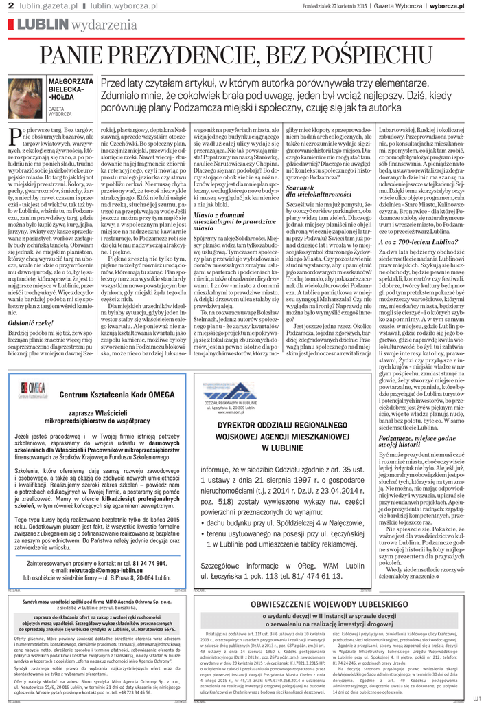 2 lublin.gazeta.pl Poniedziałek 27 kwietnia 2015 lublin.wyborcza.pl Gazeta Wyborcza wyborcza.pl LUBLIN wydarzenia PANIE PREZYDENCIE, BEZ POŚPIECHU MAŁGORZATA BIELECKA-HOŁDA GAZETA WYBORCZA P o pierwsze targ. Bez targów, nie obskurnych bazarów, ale targów kwiatowych, warzywnych, z ekologiczną żywnością, które rozpoczynają się rano, a po południu nie ma po nich śladu, trudno wyobrazić sobie jakiekolwiek europejskie miasto. Bo targ to jak klejnot w miejskiej przestrzeni. Kolory, zapachy, gwar rozmów, śmiechy, żarty, a niechby nawet czasem i sprzeczki – tak jest od wieków, tak też było w Lublinie, właśnie tu, na Podzamczu, zanim prawdziwy targ, gdzie można było kupić żywą kurę, jajka, jarzyny, kwiaty czy kasze sprzedawane z pasiastych worków, zastąpiły budy z chińską tandetą. Obawiam się jednak, że miejskim planistom, którzy chcą wyrzucić targ na ubocze, wcale nie idzie o przywrócenie mu dawnej urody, ale o to, by tę samą tandetę, która sprawia, że jest to najgorsze miejsce w Lublinie, przenieść i trochę ukryć. Więc zdecydowanie bardziej podoba mi się społeczny plan z targiem wśród kamienic. Odsłonić rzekę! Bardziej podoba mi się też, że w społecznym planie znacznie więcej miejsca przeznaczono dla przestrzeni publicznej: plac w miejscu dawnej Sze- Przed laty czytałam artykuł, w którym autorka porównywała trzy elementarze. Zdumiało mnie, że cokolwiek brała pod uwagę, jeden był wciąż najlepszy. Dziś, kiedy porównuję plany Podzamcza miejski i społeczny, czuję się jak ta autorka rokiej, plac targowy, deptak na Nadstawnej, a przede wszystkim otoczenie Czechówki. Bo społeczny plan, inaczej niż miejski, przewiduje odsłonięcie rzeki. Nawet więcej – zbudowanie na jej fragmencie zbiornika retencyjnego, czyli mówiąc po prostu małego jeziorka czy stawu w pobliżu cerkwi. Nie muszę chyba przekonywać, że to coś niezwykle atrakcyjnego. Któż nie lubi usiąść nad rzeką, słuchać jej szumu, patrzeć na przepływającą wodę Jeśli jeszcze można przy tym napić się kawy, a w społecznym planie jest miejsce na nadrzeczne kawiarnie i restauracje, to Podzamcze robi się dzięki temu nadzwyczaj atrakcyjne. I piękne. Pięk ne zresz tą nie tyl ko tym, piękne może być również urodą domów, które mają tu stanąć. Plan społeczny narzuca wysokie standardy wszystkim nowo powstającym budynkom, gdy miejski żąda tego dla części z nich. Dla miejskich urzędników idealna byłaby sytuacja, gdyby jeden inwestor stałby się właścicielem całego kwartału. Ale ponieważ nie nakazują kształtowania kwartału jako zespołu kamienic, możliwe byłoby stworzenie na Podzamczu blokowiska, może nieco bardziej luksuso- wego niż na peryferiach miasta, ale wizja jednego budynku ciągnącego się wzdłuż ca łej uli cy wyda je się przerażająca. Nie tak powstają miasta! Popatrzmy na naszą Starówkę, na ulice Narutowicza czy Chopina. Dlaczego się nam podobają? Bo domy sto ją ce obok sie bie są róż ne. I znów lepszy jest dla mnie plan społeczny, według którego nowe budynki muszą wyglądać jak kamienice a nie jak bloki. Miasto z domami mieszkalnymi to prawdziwe miasto Spójrzmy na aleję Solidarności. Miejscy planiści widzą tam tylko zabudowę usługową. Tymczasem społeczny plan przewiduje wybudowanie domów mieszkalnych z małymi usługami w parterach i podcieniach kamienic, a także obsadzenie ulicy drzewa mi. I znów – mia sto z do ma mi mieszkalnymi to prawdziwe miasto. A dzięki drzewom ulica stałaby się prawdziwą aleją. To, na co zwraca uwagę Bolesław Stelmach, jeden z autorów społecznego planu – że zarysy kwartałów z miejskiego projektu nie pokrywają się z lokalizacją zburzonych domów, jest na pewno istotne dla potencjalnych inwestorów, którzy mo- gliby mieć kłopoty z przeprowadzeniem badań archeologicznych, ale także niezrozumiałe wydaje się zignorowanie historii tego miejsca. Dlaczego kamienice nie mogą stać tam, gdzie dawniej? Dlaczego nie uwzględnić kontekstu społecznego i historycznego Podzamcza? Szacunek dla wielokulturowości Szczęśliwie nie ma już pomysłu, żeby otoczyć cerkiew parkingiem, oba plany widzą tam zieleń. Dlaczego jednak miejscy planiści nie objęli ochroną wiecznie zapalonej latarni przy Podwalu? Świeci tam już ponad dziesięć lat i wrosła w to miejsce jako symbol zburzonego Żydowskiego Miasta. Czy pozostawienie studni wystarczy, aby upamiętnić jego zamordowanych mieszkańców? Trochę to mało, aby pokazać szacunek dla wielokulturowości Podzamcza. A tablica pamiątkowa w miejscu synagogi Maharszala? Czy nie wygląda na ironię? Naprawdę nie można było wymyślić czegoś innego? Jest jeszcze jedna rzecz. Okolice Podzamcza, to jedna z gorszych, bardziej zdegradowanych dzielnic. Przewagą planu społecznego nad miejskim jest jednoczesna rewitalizacja Centrum Kształcenia Kadr OMEGA ODDZIAŁ REGIONALNY W LUBLINIE ul. Łęczyńska 1, 20-309 Lublin www.wam.com.pl zaprasza Właścicieli mikroprzedsiębiorstw do współpracy DYREKTOR ODDZIAŁU REGIONALNEGO WOJSKOWEJ AGENCJI MIESZKANIOWEJ W LUBLINIE Jeżeli jesteś pracodawcą i w Twojej firmie istnieją potrzeby szkoleniowe, zapraszamy do wzięcia udziału w darmowych szkoleniach dla Właścicieli i Pracowników mikroprzedsiębiorstw finansowanych ze Środków Krajowego Funduszu Szkoleniowego. Tego typu kursy będą realizowane bezpłatnie tylko do końca 2015 roku. Dodatkowym plusem jest fakt, iż wszystkie kwestie formalne związane z ubieganiem się o dofinansowanie realizowane są bezpłatnie za naszym pośrednictwem. Do Państwa należy jedynie decyzja oraz zatwierdzenie wniosku. Zainteresowanych prosimy o kontakt nr tel. 81 74 74 904, e-mail: [email protected] lub osobiście w siedzibie firmy – ul. B.Prusa 8, 20-064 Lublin. Szczegółowe informacje w OReg. WAM Lublin ul. Łęczyńska 1 pok. 113 tel. 81/ 474 61 13. REKLAMA 33114938 REKLAMA A co z 700-leciem Lub