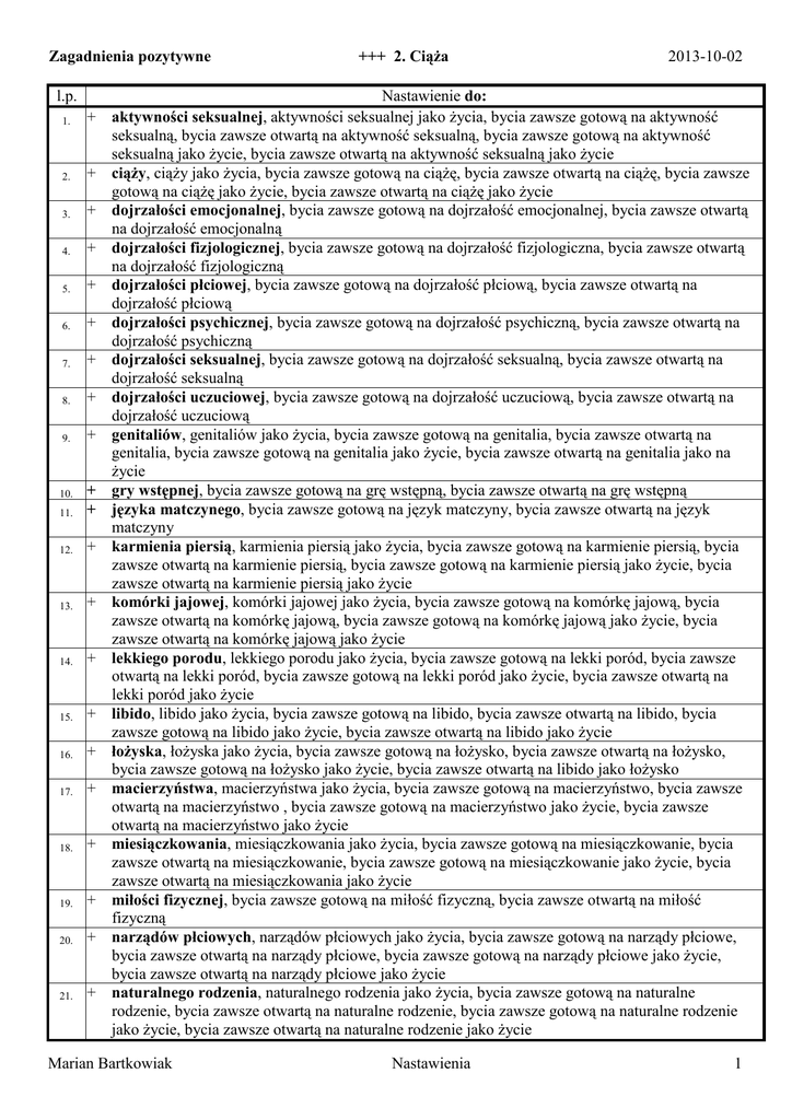 Zagadnienia pozytywne l.p. 1. + 2. + 3. + 4. + 5. + 6. + 7. + 8. + 9. + 11. + + 12. + 13. + 14. + 15. + 16. + 17. + 18. + 19. + 20. + 21. + 10. +++ 2. Ciąża 2013-10-02 Nastawienie do: aktywności seksualnej, aktywności seksualnej jako życia, bycia zawsze gotową na aktywność seksualną, bycia zawsze otwartą na aktywność seksualną, bycia zawsze gotową na aktywność seksualną jako życie, bycia zawsze otwartą na aktywność seksualną jako życie ciąży, ciąży jako życia, bycia zawsze gotową na ciążę, bycia zawsze otwartą na ciążę, bycia zawsze gotową na ciążę jako życie, bycia zawsze otwartą na ciążę jako życie dojrzałości emocjonalnej, bycia zawsze gotową na dojrzałość emocjonalnej, bycia zawsze otwartą na dojrzałość emocjonalną dojrzałości fizjologicznej, bycia zawsze gotową na dojrzałość fizjologiczna, bycia zawsze otwartą na dojrzałość fizjologiczną dojrzałości płciowej, bycia zawsze gotową na dojrzałość płciową, bycia zawsze otwartą na dojrzałość płciową dojrzałości psychicznej, bycia zawsze gotową na dojrzałość psychiczną, bycia zawsze otwartą na dojrzałość psychiczną dojrzałości seksualnej, bycia zawsze gotową na dojrzałość seksualną, bycia zawsze otwartą na dojrzałość seksualną dojrzałości uczuciowej, bycia zawsze gotową na dojrzałość uczuciową, bycia zawsze otwartą na dojrzałość uczuciową genitaliów, genitaliów jako życia, bycia zawsze gotową na genitalia, bycia zawsze otwartą na genitalia, bycia zawsze gotową na genitalia jako życie, bycia zawsze otwartą na genitalia jako na życie gry wstępnej, bycia zawsze gotową na grę wstępną, bycia zawsze otwartą na grę wstępną języka matczynego, bycia zawsze gotową na język matczyny, bycia zawsze otwartą na język matczyny karmienia piersią, karmienia piersią jako życia, bycia zawsze gotową na karmienie piersią, bycia zawsze otwartą na karmienie piersią, bycia zawsze gotową na karmienie piersią jako życie, bycia zawsze otwartą na karmienie piersią jako życie komórki jajowej, komórki jajowej jako życia, bycia zawsze gotową na komórkę jajową, bycia zawsze otwartą na komórkę jajową, bycia zawsze gotową na komórkę jajową jako życie, bycia zawsze otwartą na komórkę jajową jako życie lekkiego porodu, lekkiego porodu jako życia, bycia zawsze gotową na lekki poród, bycia zawsze otwartą na lekki poród, bycia zawsze gotową na lekki poród jako życie, bycia zawsze otwartą na lekki poród jako życie libido, libido jako życia, bycia zawsze gotową na libido, bycia zawsze otwartą na libido, bycia zawsze gotową na libido jako życie, bycia zawsze otwartą na libido jako życie łożyska, łożyska jako życia, bycia zawsze gotową na łożysko, bycia zawsze otwartą na łożysko, bycia zawsze gotową na łożysko jako życie, bycia zawsze otwartą na libido jako łożysko macierzyństwa, macierzyństwa jako życia, bycia zawsze gotową na macierzyństwo, bycia zawsze otwartą na macierzyństwo , bycia zawsze gotową na macierzyństwo jako życie, bycia zawsze otwartą na macierzyństwo jako życie miesiączkowania, miesiączkowania jako życia, bycia zawsze gotową na miesiączkowanie, bycia zawsze otwartą na miesiączkowanie, bycia zawsze gotową na miesiączkowanie jako życie, bycia zawsze otwartą na miesiączkowania jako życie miłości fizycznej, bycia zawsze gotową na miłość fizyczną, bycia zawsze otwartą na miłość fizyczną narządów płciowych, narządów płciowych jako życia, bycia zawsze gotową na narządy płciowe, bycia zawsze otwartą na narządy płciowe, bycia zawsze gotową na narządy płciowe jako życie, bycia zawsze otwartą na narządy płciowe jako życie naturalnego rodzenia, naturalnego rodzenia jako życia, bycia zawsze gotową na naturalne rodzenie, bycia zawsze otwartą na naturalne rodzenie, bycia zawsze gotową na naturalne rodzenie jako życie, bycia zawsze otwartą na naturalne rodzenie jako życie Marian Bartkowiak Nastawienia 1 Zagadnienia pozytywne 22. 23. 24. 25. 26. 27. 28. 29. 30. 31. 32. 33. 34. 35. 36. 37. 38. 39. 40. +++ 2. Ciąża 2013-10-02 + naturalnego zapłodnienia, naturalnego zapłodnienia jako życia, bycia zawsze gotową na naturalne zapłodnienie, bycia zawsze otwartą na naturalne zapłodnienie, bycia zawsze gotową na naturalne zapłodnienie jako życie, bycia zawsze otwartą na naturalne zapłodnienie jako życie + niemowląt, niemowląt jako życia, bycia zawsze gotową na niemowlęta, bycia zawsze otwartą na niemowlęta, bycia zawsze gotową na niemowlęta jako życie, bycia zawsze otwartą na niemowlęta jako życie + oogenezy, oogenezy jako życia, bycia zawsze gotową na oogenezę, bycia zawsze otwartą na oogenezę, bycia zawsze gotową na oogenezę jako życie, bycia zawsze otwartą na oogenezę jako życie (proces powstawania i dojrzewania komórek jajowych) + orgazmu, bycia zawsze gotową na orgazm, bycia zawsze otwartą na orgazm + pieszczenia, bycia zawsze gotową na pieszczenie, bycie zawsze otwartą na pieszczenie + plemników, plemników jako życia, bycia zawsze gotową na plemniki, bycia zawsze otwartą na plemniki, bycia zawsze gotową na plemniki jako życie, bycia zawsze otwartą na plemniki jako na życie + płodzenia, płodzenia jako życia, bycia zawsze gotową na płodzenie, bycia zawsze otwartą na płodzenie, bycia zawsze gotową na płodzenie jako życie, bycia zawsze otwartą na płodzenie jako życie + poczęcia, poczęcia jako życia, bycia zawsze gotową na poczęcie, bycia zawsze otwartą na poczęcie, bycia zawsze gotową na poczęcie jako życie, bycia zawsze otwartą na poczęcie jako życie + podniecenia seksualnego, bycia zawsze gotową na podniecenie seksualne, bycia zawsze otwartą na podniecenie seksualne + pokwitania, pokwitania jako życia, bycia zawsze gotową na pokwitanie, bycia zawsze otwartą na pokwitanie, bycia zawsze gotową na pokwitanie jako życie, bycia zawsze 