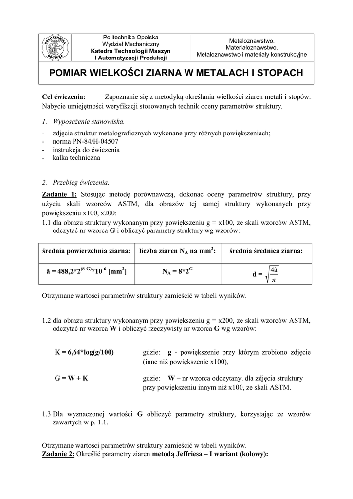 Politechnika Opolska Wydział Mechaniczny Katedra Technologii Maszyn I Automatyzacji Produkcji Metaloznawstwo. Materiałoznawstwo. Metaloznawstwo i materiały konstrukcyjne POMIAR WIELKOŚCI ZIARNA W METALACH I STOPACH Cel ćwiczenia: Zapoznanie się z metodyką określania wielkości ziaren metali i stopów. Nabycie umiejętności weryfikacji stosowanych technik oceny parametrów struktury. 1. Wyposażenie stanowiska. - zdjęcia struktur metalograficznych wykonane przy różnych powiększeniach; norma PN-84/H-04507 instrukcja do ćwiczenia kalka techniczna 2. Przebieg ćwiczenia. Zadanie 1: Stosując metodę porównawczą, dokonać oceny parametrów struktury, przy użyciu skali wzorców ASTM, dla obrazów tej samej struktury wykonanych przy powiększeniu x100, x200: 1.1 dla obrazu struktury wykonanym przy powiększeniu g = x100, ze skali wzorców ASTM, odczytać nr wzorca G i obliczyć parametry struktury wg wzorów: średnia powierzchnia ziarna: liczba ziaren NA na mm2: ã = 488,2*2(8-G)*10-6 [mm2] NA = 8*2G średnia średnica ziarna: d= 4ã Otrzymane wartości parametrów struktury zamieścić w tabeli wyników. 1.2 dla obrazu struktury wykonanym przy powiększeniu g = x200, ze skali wzorców ASTM, odczytać nr wzorca W i obliczyć rzeczywisty nr wzorca G wg wzorów: K = 6,64*log(g/100) gdzie: g - powiększenie przy którym zrobiono zdjęcie (inne niż powiększenie x100), G=W+K gdzie: W – nr wzorca odczytany, dla zdjęcia struktury przy powiększeniu innym niż x100, ze skali ASTM. 1.3 Dla wyznaczonej wartości G obliczyć parametry struktury, korzystając ze wzorów zawartych w p. 1.1. Otrzymane wartości parametrów struktury zamieścić w tabeli wyników. Zadanie 2: Określić parametry ziaren metodą Jeffriesa – I wariant (kołowy): 2.1 na obrazie struktury wykonanej przy powiększeniu x100 wykonać: - wykreślić okrąg o średnicy D = 79,8 mm, zliczyć liczbę ziaren leżących w całości w okręgu (nw), zliczyć liczbę ziaren przeciętych przez okrąg (ni), obliczyć całkowitą liczbę ziaren (nt) na obserwowanej powierzchni A: nt = nw + 0,5ni 2.2 obliczyć parametry struktury: średnia powierzchnia ziarna: liczba ziaren NA na mm2: NA = nt / A ã = 1 / NA gdzie: średnia średnica ziarna: [1/mm2] 2 A = 0,50 [mm ] d= 4ã Otrzymane wartości parametrów struktury zamieścić w tabeli wyników. Zadanie 3: Określić parametry ziaren metodą Jeffriesa z poprawką Sałtykowa: 3.1 obliczyć wartość współczynnika korekcji k: k = 0,5 – d/(4D’) gdzie d – średnia średnica ziarna w [mm] (obl. pkt. 2.2), D’ – rzeczywista średnica pola obserwacji [mm] (D’ = 0,798 [mm]) 3.2 obliczyć całkowitą liczbę ziaren (nt) na obserwowanej powierzchni A ze wzoru: nt = nw + k*ni wartości nw i ni przyjąć z obliczeń w pkt. 2.1 3.3 dla obliczonej wartości nt (uwzględniającą poprawkę Sałtykowa) obliczyć ponownie parametry struktury NA, ã, d (jak w pkt. 2.1, 2.2), 3.4 Otrzymane wartości parametrów struktury zamieścić w tabeli wyników. Zadanie 4: Określić parametry ziaren metodą Jeffriesa (I wariant) i Jeffriesa z poprawką Sałtykowa dla obrazu struktury wykonanego przy powiększeniu x200: - procedury obliczeniowe do wyznaczenia nw, ni, nt, takie jak w zadaniu 2 i w zadaniu 3), wartość k obliczamy przyjmując D’= 0,399 [mm], wartość NA, dla obrazu struktury o powiększeniu innym niż x100, obliczamy ze wzoru: NA = 2 (g/100)2 nt gdzie g – wartość powiększenia obrazu (inna niż x100), - parametry struktury ã, d obliczamy korzystając z wzorów zawartych w zad. 2 pkt. 2.2. Otrzymane wartości parametrów struktury zamieścić w tabeli wyników. Zadanie 5 Określić parametry struktury metodą Jeffriesa – II wariant (kwadrat): 5.1 na obrazie struktury uzyskanym przy powiększeniu x100 wykonać: - narysować kwadrat o boku b = 70 mm, - zliczyć liczbę ziaren leżących w całości w polu kwadratu (nw), - zliczyć liczbę ziaren przeciętych przez linie boków kwadratu (ni), (nie liczyć ziaren w narożach), - obliczyć całkowitą liczbę ziaren (nt) na obserwowanej powierzchni A: nt = nw + 0,5ni + 1 - obliczyć liczbę ziaren NA przypadającą na jeden mm2 powierzchni: NA = nt / A - [1/mm2] gdzie A = 0,50 [mm2] obliczyć pozostałe parametry struktury wykorzystując wzory z pkt. 2.2, otrzymane wartości parametrów struktury zamieścić w tabeli wyników. 5.2 na obrazie struktury wykonanym przy powiększeniu x200 wykonać: - narysować kwadrat o boku b = 70 mm, - obliczyć wartości (nw), (ni), (nt), - obliczyć NA, ze wzoru jak w zadaniu 4, - obliczyć pozostałe parametry struktury wykorzystując wzory z pkt. 2.2, - otrzymane wartości parametrów struktury zamieścić w tabeli wyników. WYNIKI UZYSKANE Z REALIZACJI ZADAŃ ZESTAWIĆ W TABELI: Metoda Powiększenie obrazu struktury nw ni nt Porównawcza ASTM X100 X200 - - - Jeffriesa (I wariant) X100 X200 Jeffriesa z popr. Sałtykowa X100 X200 Jeffriesa (II wariant) X100 X200 Parametry badanej struktury NA Ã [1/mm2] [mm2] d [mm] Uwagi do sprawozdania. Sprawozdanie powinno zawierać: - wstęp obejmujący krótką charakterystykę poszczególnych metod określania wielkości ziaren w metalach i stopach; kalki z przerysowanymi strukturami; obliczenia wybranych parametrów dla poszczególnych metod wnioski. Literatura: [1] PN-84/H-04507/01: Metale. Metalograficzne badania wielkości ziarna. Mikroskopowe metody określenia wielkości ziarna. Polski Komitet Normalizacji Miar i Jakości. [2] Ryś J.: Stereologia materiałów, Fotobit Design, Kraków 1995. [3] Ćwiczenia laboratoryjne z materiałoznawstwa pod red. Haimanna R., skrypt Politechnika Wrocławska, Wrocław 1980. [4] Sokołowski J., Hubner K., Nosiła M., Pluta B.: Metalografia ilościowa. Automatyczne metody pomiarów, skrypt Politechnika Śląska, Gliwice 1979. Zagadnienia do tematu: 1. Co to jest metalografia ilościowa? 2. Na czym polegają metody porównawcze w metalografii? 3. Metody określania objętościowego udziału faz lub składnik