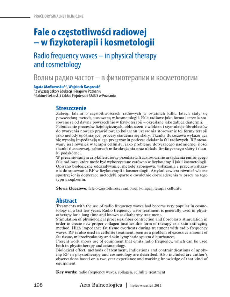 PRACE oryginalne i kliniczne Fale o częstotliwości radiowej – w fizykoterapii i kosmetologii Radio frequency waves – in physical therapy and cosmetology Волны радио частот – в физиотерапии и косметологии Agata Mańkowska1,2, Wojciech Kasprzak2 1 z Wyższej Szkoły Edukacji i Terapii w Poznaniu 2 Gabinet Lekarski i Zakład Fizjoterapii SALUS w Poznaniu Streszczenie Zabiegi falami o częstotliwościach radiowych w ostatnich kilku latach stały się powszechną metodą stosowaną w kosmetologii. Fale radiowe jako forma leczenia stosowane są od dawna powszechnie w fizykoterapii – określane jako zabieg diatermii. Pobudzenie procesów fizjologicznych, obkurczenie włókien i stymulacje fibroblastów do tworzenia nowego prawidłowego kolagenu uzasadnia stosowanie tej formy terapii jako metody opóźniającej procesy starzenia się skóry. Tkanka tłuszczowa wykazująca się wysoką impedancją ulega przegrzaniu podczas działania fal radiowych. RF stosowany jest również w terapii cellulitu, jako problemu dotyczącego nadmiernej ilości tkanki tłuszczowej, zaburzeń mikrokrążenia oraz układu limfatycznego skóry i tkanki podskórnej. W prezentowanym artykule autorzy przedstawili zastosowanie urządzenia emitującego fale radiowe, które może być wykorzystane zarówno w fizykoterapii jak i kosmetologii. Opisano biologiczne oddziaływanie, metodę zabiegową, wskazania i przeciwwskazania do stosowania RF w fizykoterapii i kosmetologii. Artykuł zawiera również własne spostrzeżenia dotyczące metodyki oparte o dwuletnie doświadczenia w pracy na tego typu urządzeniu. Słowa kluczowe: fale o częstotliwości radiowej, kolagen, terapia cellulitu Abstract Treatments with the use of radio frequency waves had become very popular in cosmetology in a last few years. Radio frequency wave treatment is generally used in physiotherapy for a long time and known as diathermy treatment. Stimulation of physiological processes, fiber contraction and fibroblasts stimulation in order to create new proper collagen justifies this form of therapy as a skin anti-aging method. High impedance fat tissue overheats during treatment with radio frequency waves. RF is also used in cellulite treatment, seen as a problem of excessive amount of fat tissue, microcirculatory and skin lymphatic system disturbances. Present work shows use of equipment that emits radio frequency, which can be used both in physiotherapy and cosmetology. Biological effect, methods of treatment, indications and contraindications of applying RF in physiotherapy and cosmetology are described. Also included are author’s observations based on a two year experience and working knowledge of that kind of equipment. Key words: radio frequency waves, collagen, cellulite treatment 198 Acta Balneologica | lipiec-wrzesień 2012 Fale o częstotliwości radiowej – w fizykoterapii i kosmetologii Резюме Процедуры с использованием волн радио частот в последние несколько лет стали распространенной методикой применяемой в косметологии. Радиоволны как форма лечения используется в физиотерапии издавна и широко, и носит название – диатермия. Стимуляция физиологических процессов, укорочение волокон и стимуляция фибробластов к выработке нового правильного коллагена, подтверждает правильность используемой формы терапии как метода препятствующего старению кожи. Жировая ткань, проявляющая себя высоким сопротивлением, подвергается нагреванию под воздействием радиоволн. Радиоволны используются при лечении целюлита, проблема возникновения которого связана с излишним накоплением жира, нарушениями как в микроциркуляции, так и в лимфоцитарной системе кожи и подкожной клетчатки. В предложенной статье авторы представили использование аппарата, имитирующего радиоволны, которые могут быть использованы как в физиотерапии так и в косметологии. Описано их биологическое влияние, показания и противопоказания к процедуре при использовании ее в физиотерапии и косметологии. Статья включает также собственные наблюдения, относительно методики, базирующиеся на двухлетнем опыте работы на подобного типа оборудовании. Ключевые слова: pадиоволны, коллаген, лечениe целюлита Acta Balneol. Tom LIV Nr 3 (129), str. 198-203 Wstęp W ostatnich latach zabiegi wykorzystujące fale o częstotliwości radiowej (powyżej 300 kHz) stały się kolejnym narzędziem, służącym do poprawy wyglądu skóry. Metoda zwana popularnie falą radiową lub radiofrekwencją w kosmetologii i medycynie estetycznej pojawiła się stosunkowo niedawno. Jako forma lecznicza stosowana jest już od lat 70 ubiegłego wieku. W fizykoterapii zabieg określany jest jako diatermia. Nazwa ta pochodzi od greckich słów: diá – przez, thérmé – gorąco. Głównym czynnikiem oddziałującym leczniczo jest wewnętrzne ciepło wytworzone w tkankach poddawanych zabiegowi. Zabiegi stosuje się głównie 