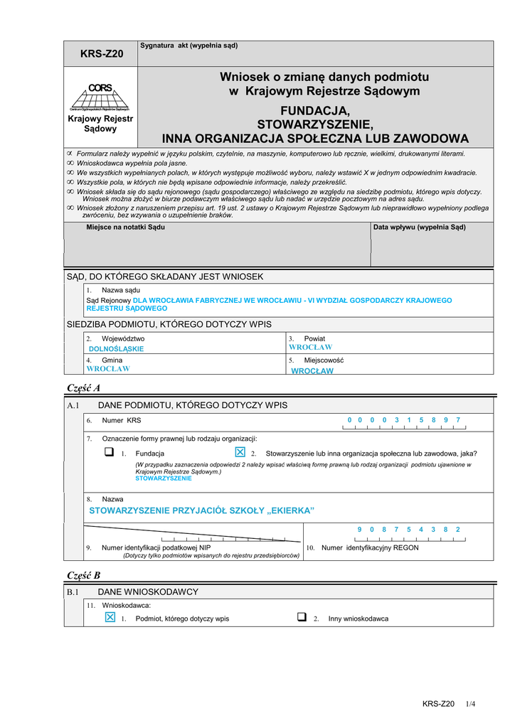 Sygnatura akt (wypełnia sąd) KRS-Z20 Wniosek o zmianę danych podmiotu w Krajowym Rejestrze Sądowym CORS FUNDACJA, STOWARZYSZENIE, INNA ORGANIZACJA SPOŁECZNA LUB ZAWODOWA Centrum Ogólnopolskich Rejestrów Sądowych Krajowy Rejestr Sądowy • • • • • • Formularz należy wypełnić w języku polskim, czytelnie, na maszynie, komputerowo lub ręcznie, wielkimi, drukowanymi literami. Wnioskodawca wypełnia pola jasne. We wszystkich wypełnianych polach, w których występuje możliwość wyboru, należy wstawić X w jednym odpowiednim kwadracie. Wszystkie pola, w których nie będą wpisane odpowiednie informacje, należy przekreślić. Wniosek składa się do sądu rejonowego (sądu gospodarczego) właściwego ze względu na siedzibę podmiotu, którego wpis dotyczy. Wniosek można złożyć w biurze podawczym właściwego sądu lub nadać w urzędzie pocztowym na adres sądu. Wniosek złożony z naruszeniem przepisu art. 19 ust. 2 ustawy o Krajowym Rejestrze Sądowym lub nieprawidłowo wypełniony podlega zwróceniu, bez wzywania o uzupełnienie braków. Miejsce na notatki Sądu Data wpływu (wypełnia Sąd) SĄD, DO KTÓREGO SKŁADANY JEST WNIOSEK 1. Nazwa sądu Sąd Rejonowy DLA WROCŁAWIA FABRYCZNEJ WE WROCŁAWIU - VI WYDZIAŁ GOSPODARCZY KRAJOWEGO REJESTRU SĄDOWEGO SIEDZIBA PODMIOTU, KTÓREGO DOTYCZY WPIS 2. Województwo DOLNOŚLĄSKIE 3. Gmina 4. Powiat WROCŁAW 5. WROCŁAW Miejscowość WROCŁAW Część A DANE PODMIOTU, KTÓREGO DOTYCZY WPIS A.1 0 0 6. Numer KRS 7. Oznaczenie formy prawnej lub rodzaju organizacji: 1. Fundacja 2. 0 0 3 1 5 8 9 7 Stowarzyszenie lub inna organizacja społeczna lub zawodowa, jaka? (W przypadku zaznaczenia odpowiedzi 2 należy wpisać właściwą formę prawną lub rodzaj organizacji podmiotu ujawnione w Krajowym Rejestrze Sądowym.) STOWARZYSZENIE Nazwa 8. STOWARZYSZENIE PRZYJACIÓŁ SZKOŁY „EKIERKA” 9 Numer identyfikacji podatkowej NIP 9. 0 8 7 5 4 3 8 2 10. Numer identyfikacyjny REGON (Dotyczy tylko podmiotów wpisanych do rejestru przedsiębiorców) Część B B.1 DANE WNIOSKODAWCY 11. Wnioskodawca: 1. Podmiot, którego dotyczy wpis 2. Inny wnioskodawca KRS-Z20 1/4 Pola o numerach 12 i 13 należy wypełnić tylko wówczas, gdy w polu oznaczonym numerem 11 zaznaczono „Inny wnioskodawca”. W pozostałych przypadkach pola te należy przekreślić. 12. Nazwa / firma lub nazwisko 13. Imię B.2 DANE ADRESATA KORESPONDENCJI B.2.1 Oznaczenie adresata korespondencji 14. Nazwa / firma lub nazwisko STOWARZYSZENIE PRZYJACIÓŁ SZKOŁY „EKIERKA” 15. Imię B.2.2 Adres do korespondencji 16. Ulica SZKOLNA 20. Kod pocztowy 54-007 B.3 17. Nr domu 18. Nr lokalu 5 7 21. Poczta 19. Miejscowość WROCŁAW 22. Kraj POLSKA WROCŁAW DANE PEŁNOMOCNIKA PROCESOWEGO B.3.1 Oznaczenie pełnomocnika 23. Nazwa / firma lub nazwisko 24. Imię B.3.2 Adres pełnomocnika 25. Ulica 29. Kod pocztowy 26. Nr domu 27. Nr lokalu 30. Poczta 28. Miejscowość 31. Kraj Część C Wnoszę o dokonanie wpisu zgodnie z informacjami zamieszczonymi we wniosku i na załącznikach: • • C.1 Wszystkie informacje o podmiocie, które uległy zmianie należy wpisać w odpowiednim polu, podając ich aktualną treść. Jeśli któraś z informacji nie uległa zmianie, to pole przeznaczone na jej wpisanie należy przekreślić, a jeśli jest to pole, w którym występuje możliwość wyboru odpowiedzi, należy zaznaczyć odpowiedź „BEZ ZMIAN”. ZMIANA NAZWY PODMIOTU 32. Nowa nazwa C.2 ZMIANA INFORMACJI O PROWADZENIU DZIAŁALNOŚCI GOSPODARCZEJ Z INNYMI PODMIOTAMI NA PODSTAWIE UMOWY SPÓŁKI CYWILNEJ (W przypadku gdy podmiot nie jest wpisany do rejestru przedsiębiorców, pole oznaczone numerem 33 należy przekreślić.) 33. Czy przedsiębiorca prowadzi działalność gospodarczą z innymi podmiotami na podstawie umowy spółki cywilnej? TAK NIE BEZ ZMIAN KRS-Z20 2/4 C.3 ZMIANA SIEDZIBY I/LUB ADRESU PODMIOTU • • • W przypadku zmiany siedziby podmiotu należy wypełnić pola oznaczone numerami od 34 do 42. W przypadku zmiany adresu bez zmiany siedziby należy wypełnić pola oznaczone numerami od 38 do 42. Jeśli podmiot, którego siedzibą jest Warszawa, zmienił adres, a z tym związana jest również zmiana gminy, należy wówczas wypełnić pola oznaczone numerami od 34 do 42. 34. Województwo 35. Powiat 36. Gmina 37. Miejscowość 38. Ulica 39. Nr domu 41. Kod pocztowy C.4 40. Nr lokalu 42. Poczta ZMIANA ADRESU STRONY INTERNETOWEJ I/LUB ADRESU POCZTY ELEKTRONICZNEJ 43. Nowy adres strony internetowej 44. Nowy adres poczty elektronicznej C.5 ZMIANA STATUTU 45. Data zmiany statutu (dzień – miesiąc – rok) oraz numery zmienionych, dodanych, usuniętych paragrafów (innych jednostek redakcyjnych) 01.08.2013 r. ZMIENIONO : PAR. 18 C.6 ZMIANA INFORMACJI O CZASIE, NA JAKI UTWORZONY JEST PODMIOT 46. Podmiot utworzony jest na czas: C.7 1. Oznaczony, jaki? 2. Nieoznaczony 3. Bez zmian ZMIANA ORGANU SPRAWUJĄCEGO NADZÓR (organ samorządowy, administracji państwowej lub właściwy minister) 47. Nowa nazwa organu C.8 ZMIANA CELU DZIAŁANIA PODMIOTU 48. Nowy cel działania KRS-Z20 3/4 Część D D.1 INFORMACJA O ZAŁĄCZNIKACH: 1. W celu wpisania nowej jednostki terenowej lub nowego oddziału, lub wykreślenia jednostki terenowej, lub oddziału, lub zmiany informacji o jednostce terenowej, lub oddziale podmiotu, należy wypełnić załącznik KRS-ZA „Zmiana - oddziały, terenowe jednostki organizacyjne”. 2. W celu wpisania organu nadzoru należy wypełnić załącznik KRS-WK „Organy podmiotu”. W celu wykreślenia organu uprawnionego do reprezentacji lub organu nadzoru, zmiany jego składu lub zmiany danych osób wchodzących w jego skład, lub zmiany sposobu reprezentacji należy wypełnić załącznik KRS-ZK „Zmiana - organy podmiotu / wspólnicy uprawnieni do reprezentowania spółki”. 3. Jeśli zmianie uległ przedmiot prowadzonej działalności gospodarczej, należy wypełnić załącznik KRS-ZM „Zmiana - przedmiot działalności”. 4. W celu wpisania wzmi